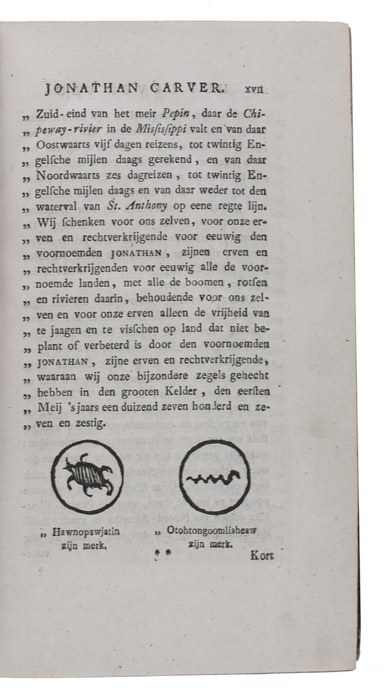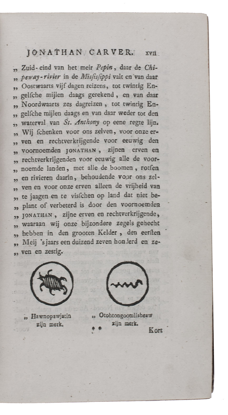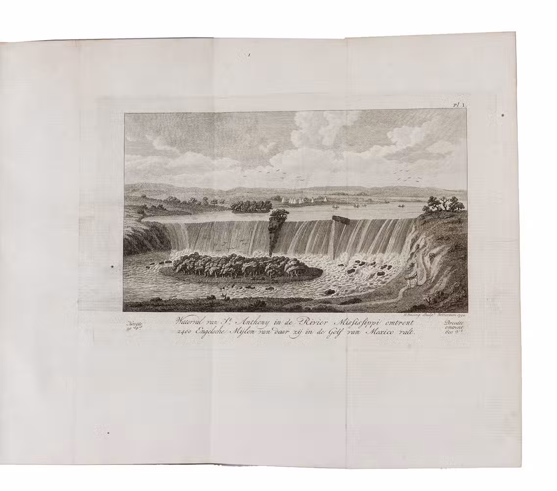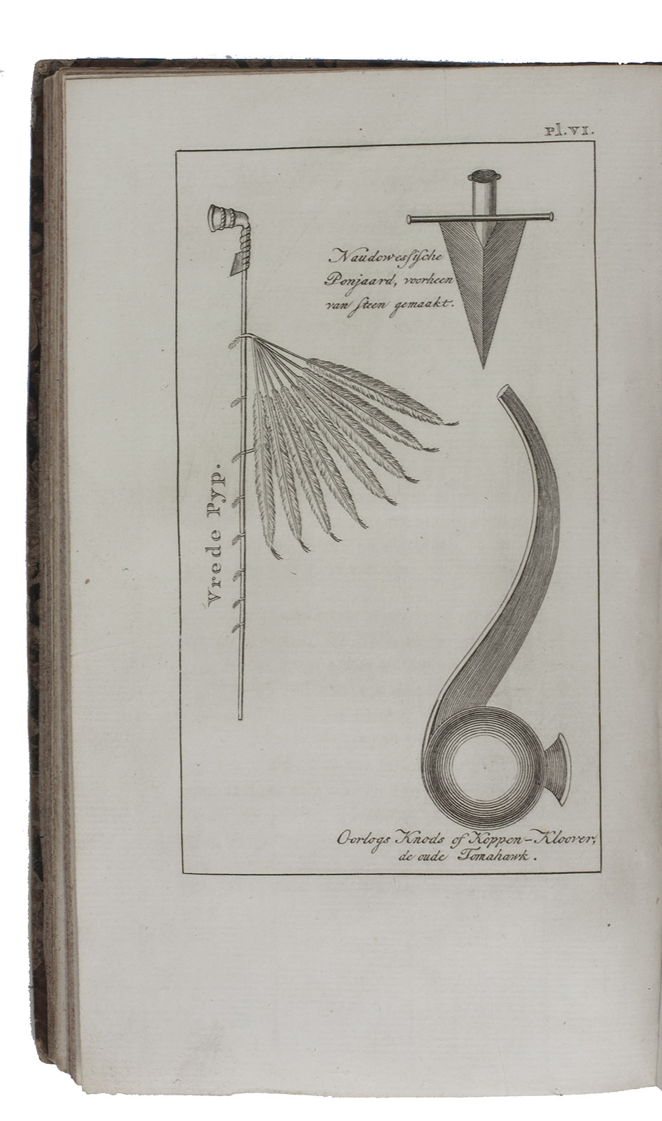 First edition of the Dutch translation of a travelogue of North America by the English-American colonial captain Jonathan Carver (1710-1780). "In 1766 Carver was employed ... to explore to the west of the Great Lake in an attempt to contact the Sioux Indians. ... After wintering with the Indians on the Ste Croix River, Carver set out to return to Mackinac, but at the mouth of the Wisconsin met Captain James Tute, in command of a party send out to explore a route to the Pacific Ocean" (Howgego). The folding map shows the midlands of North America, the folding plate the St. Anthony waterfall in the Mississippi River and the hand-coloured engravings show different native American Indians.