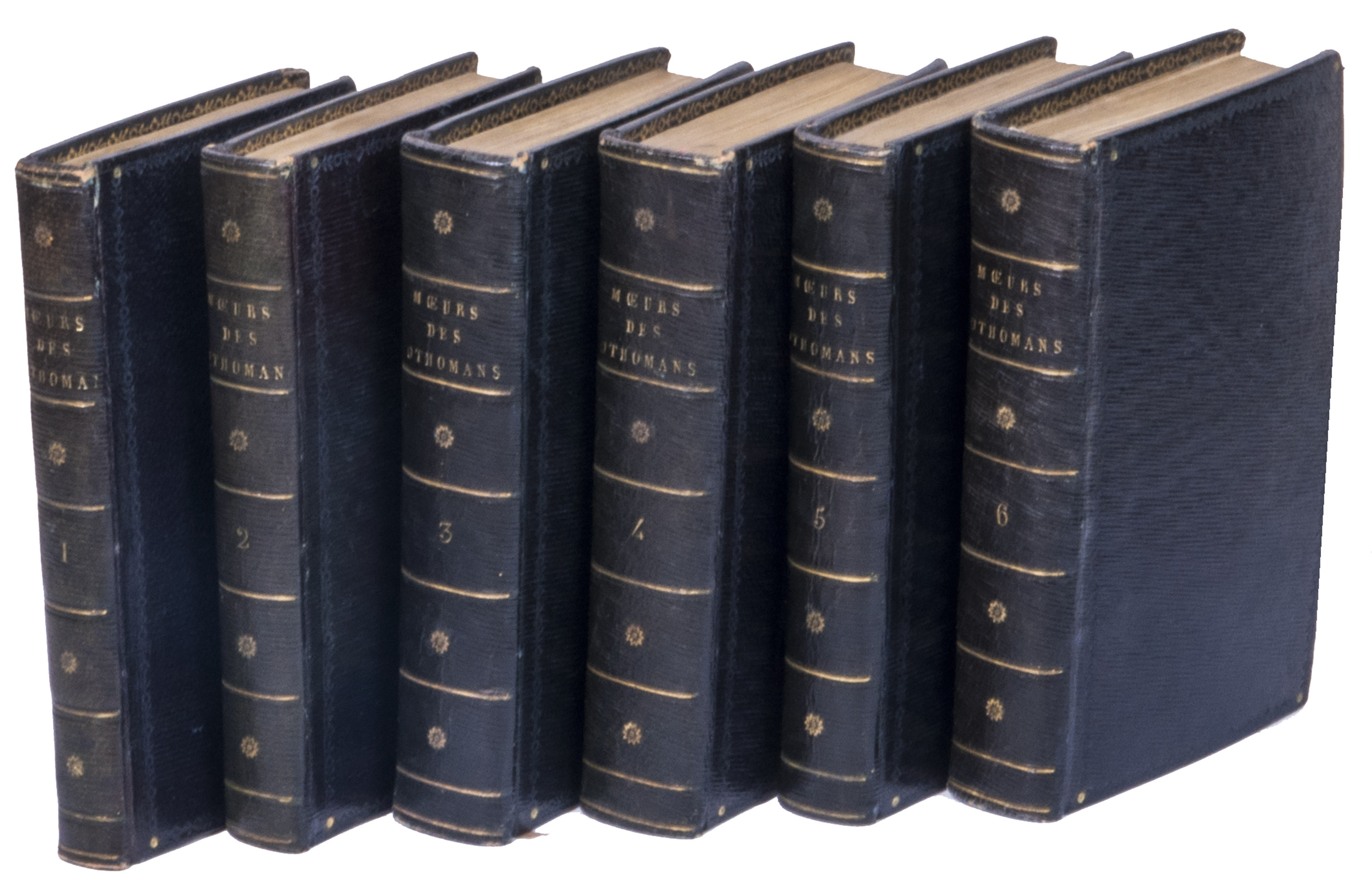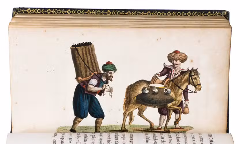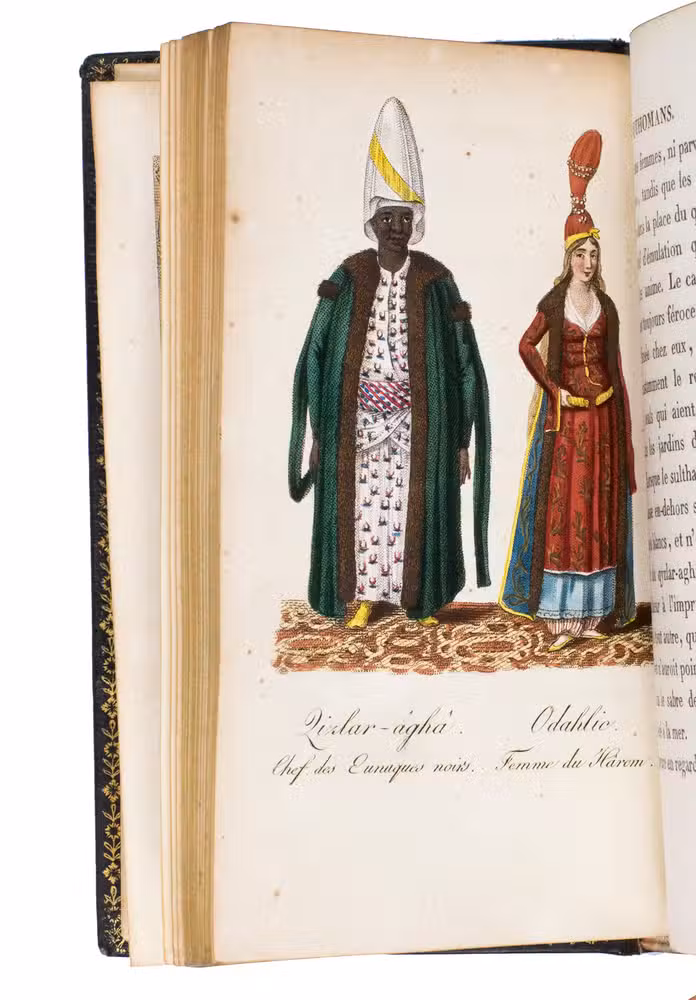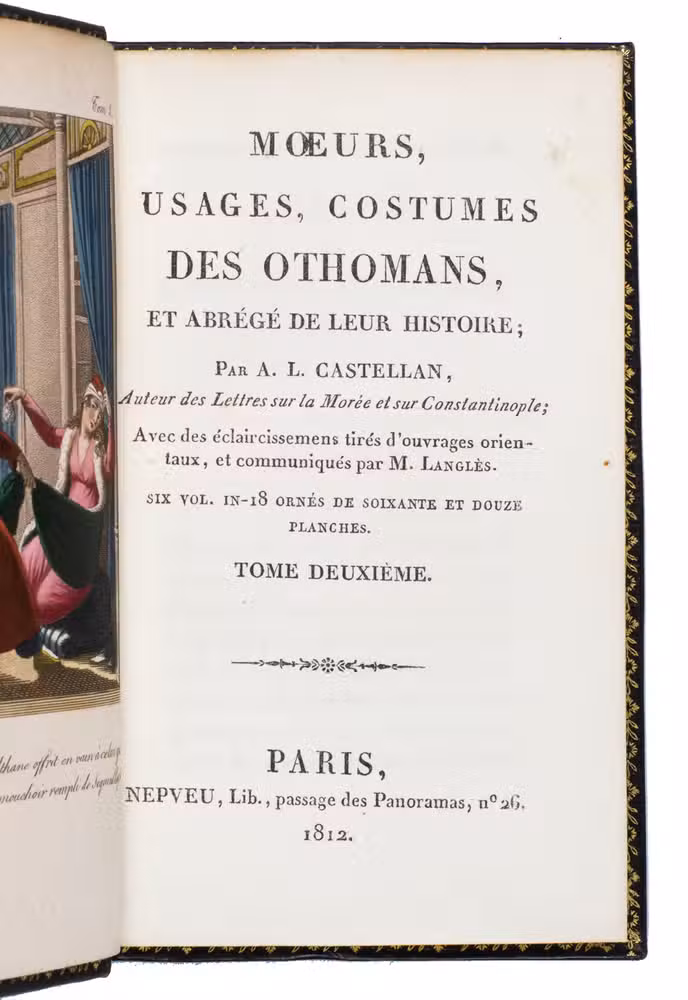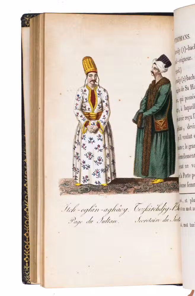 Beautifully illustrated 6-volume work on the customs, habits and costumes of the people in the Ottoman Empire. The work gives an elaborate account of Ottoman history, the emperors, people, religion, arts and professions, which are shown in the handcoloured detailed full-page engravings.