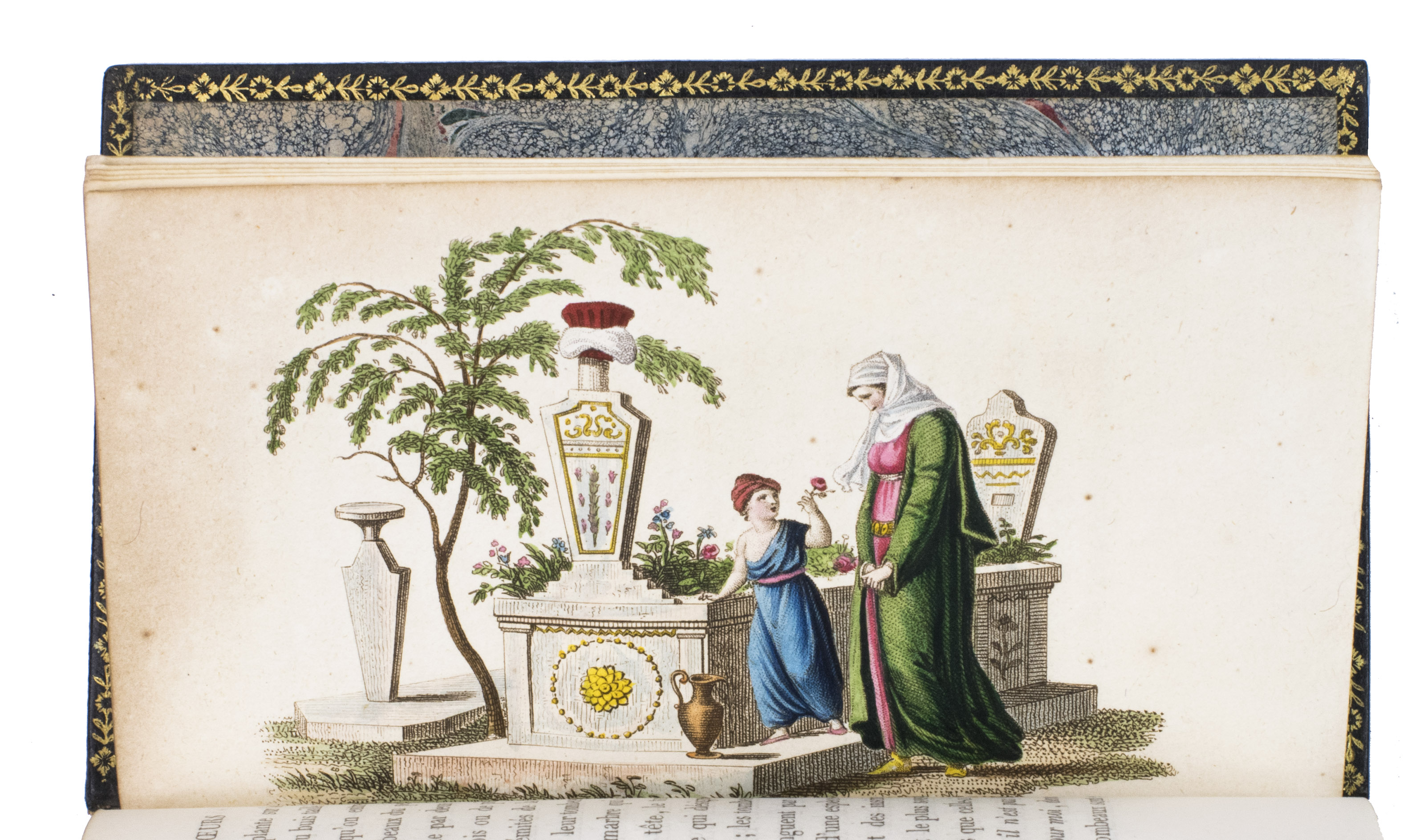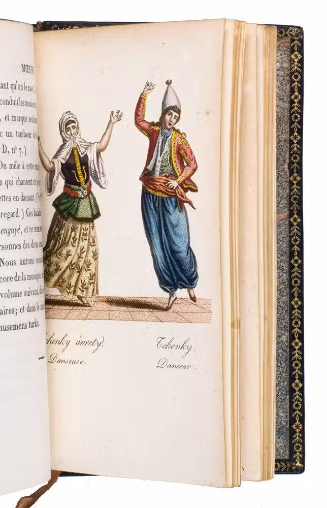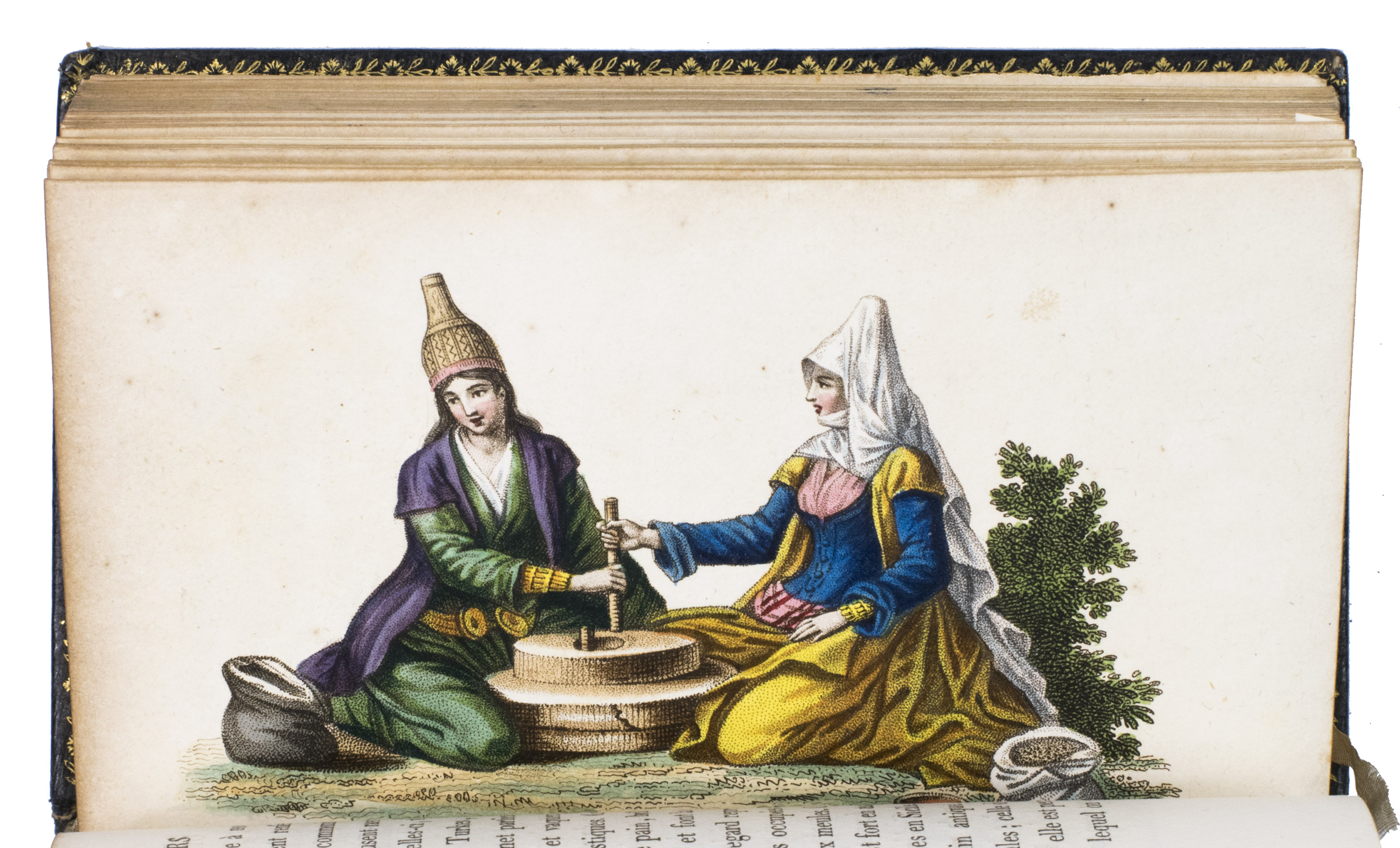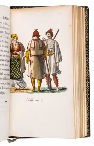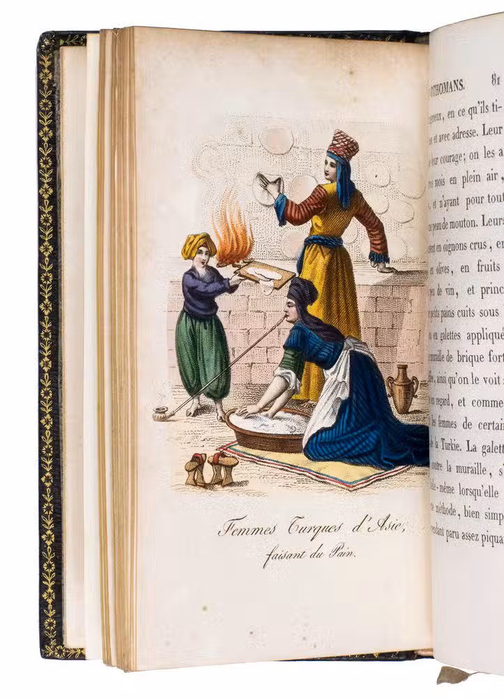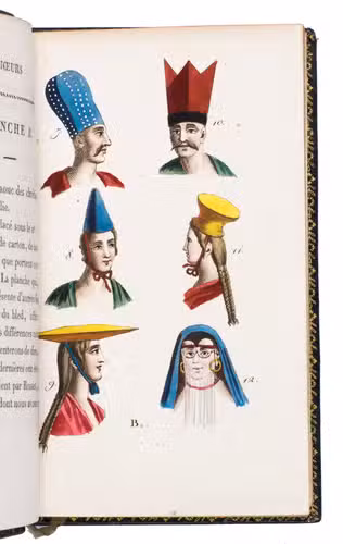 Paris, Nepveu, 1812. 6 volumes. 18mo (14 x 9 cm). With 75 hand-coloured engraved plates: a frontispiece in each volume and 17, 17, 9, and 26 plates in volumes 3, 4, 5, and 6 respectively. Most plates depict costumes, but also tools and instruments are shown. All plates are very detailed and beautifully coloured by hand, in very fresh contemporary colouring, some even finished with gold. Contemporary gold- and blined-toole purpleish-black morocco.