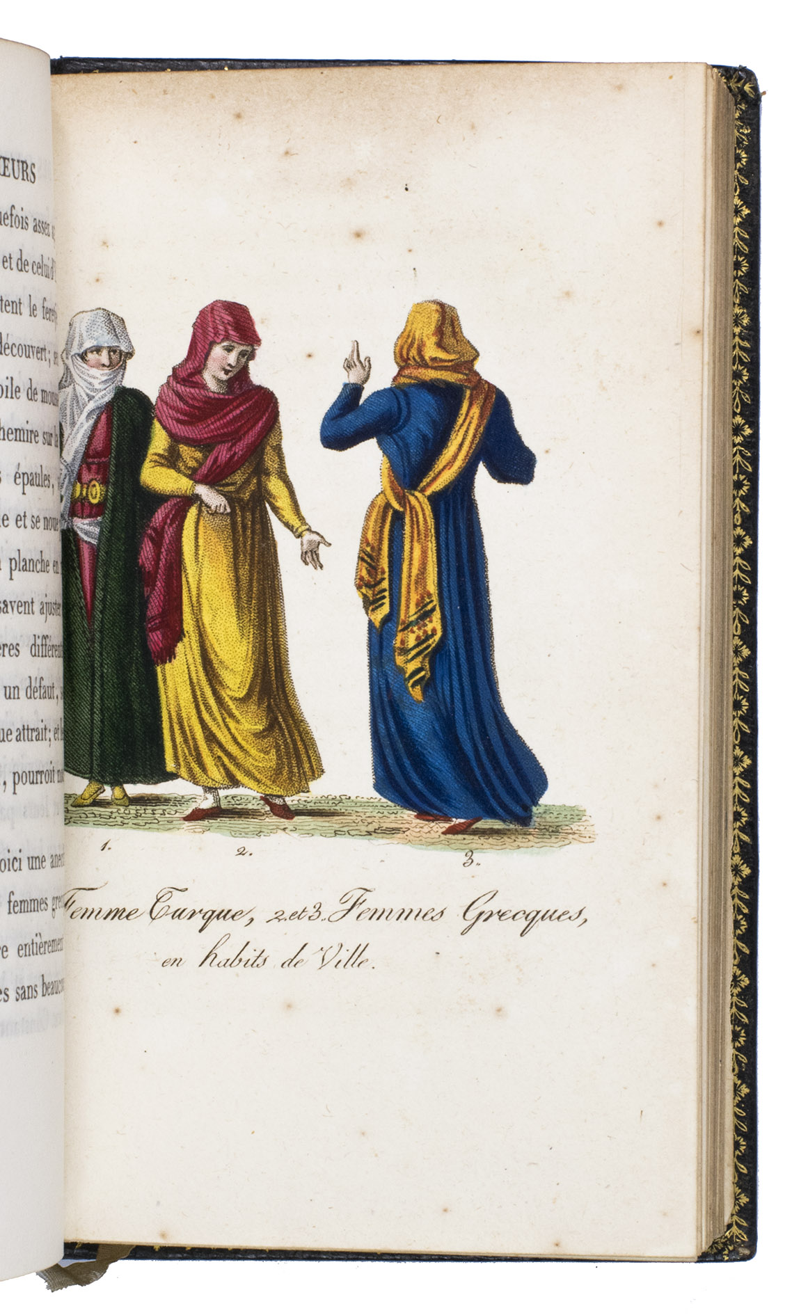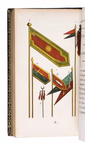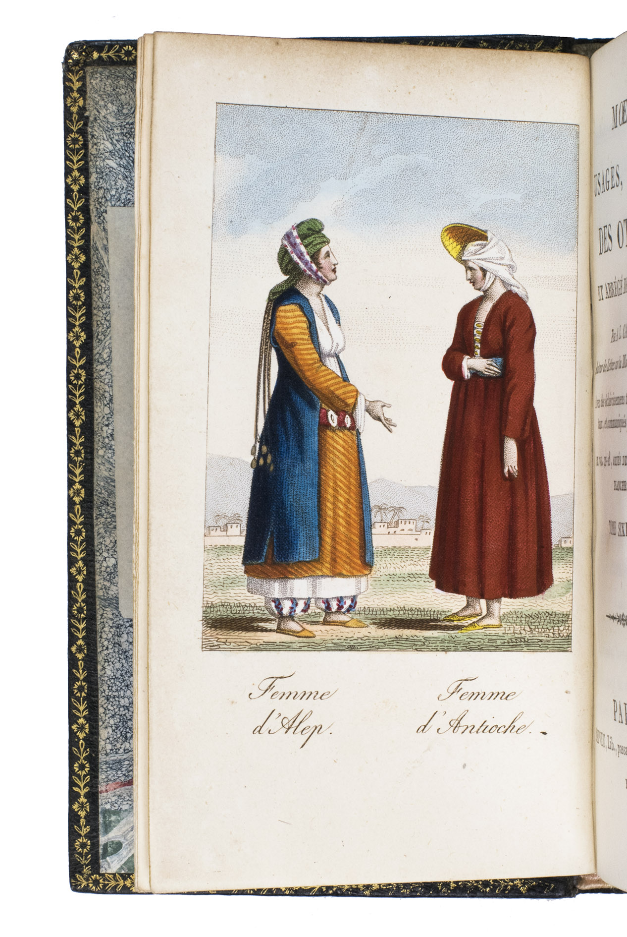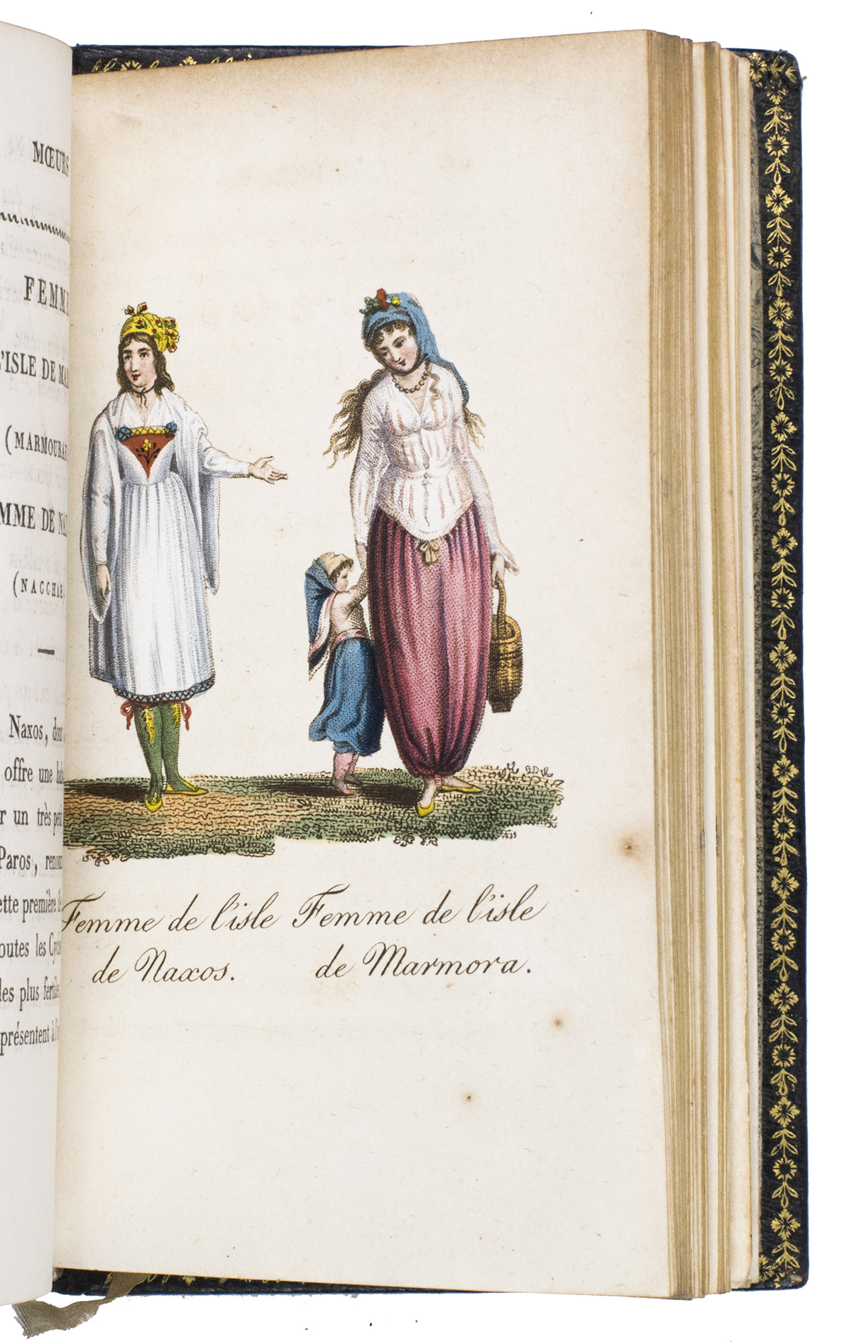 Paris, Nepveu, 1812. 6 volumes. 18mo (14 x 9 cm). With 75 hand-coloured engraved plates: a frontispiece in each volume and 17, 17, 9, and 26 plates in volumes 3, 4, 5, and 6 respectively. Most plates depict costumes, but also tools and instruments are shown. All plates are very detailed and beautifully coloured by hand, in very fresh contemporary colouring, some even finished with gold. Contemporary gold- and blined-toole purpleish-black morocco.