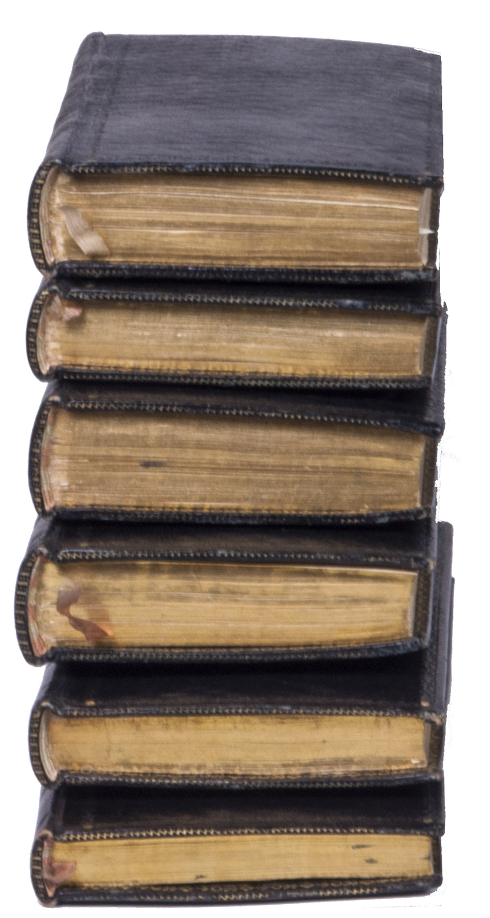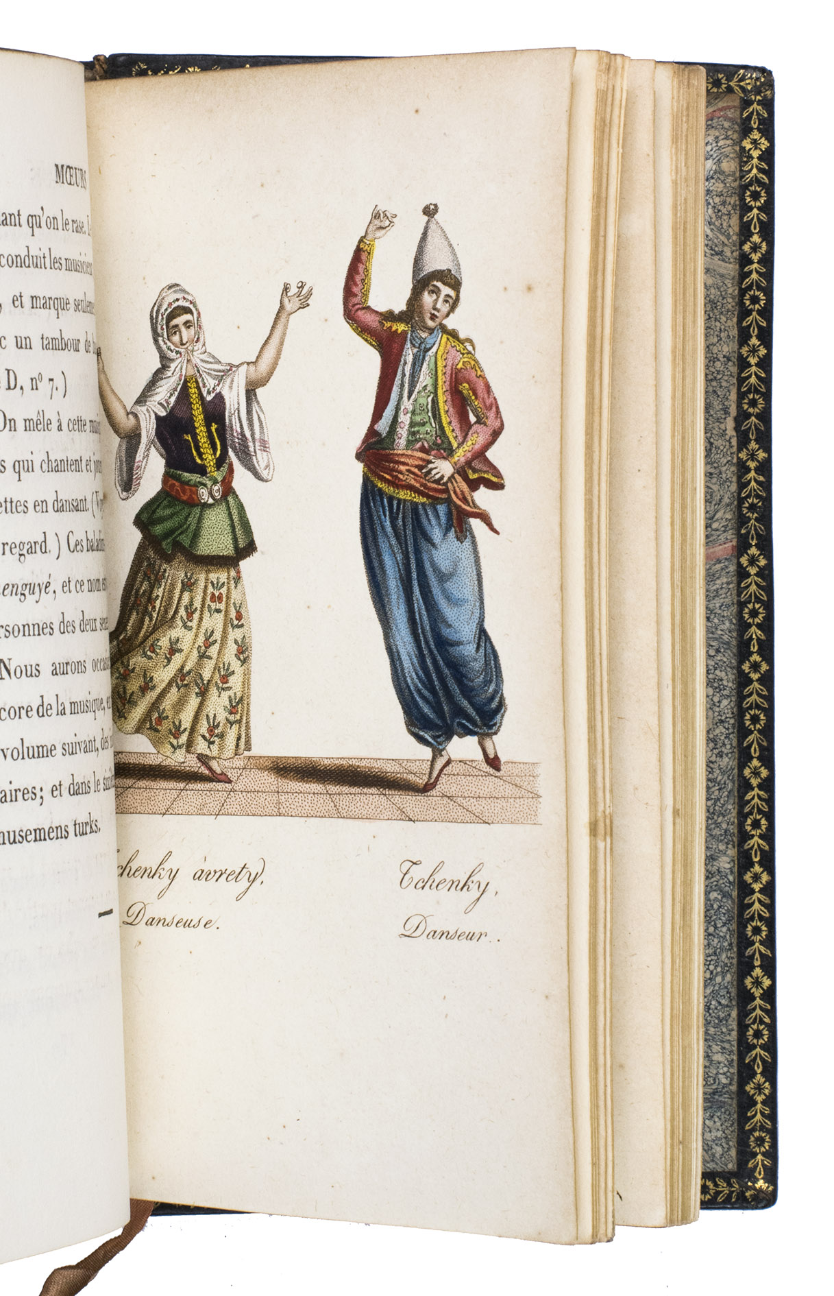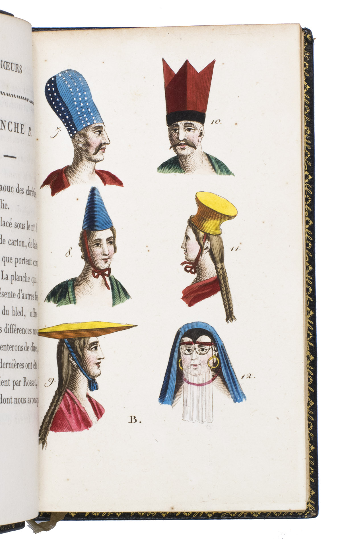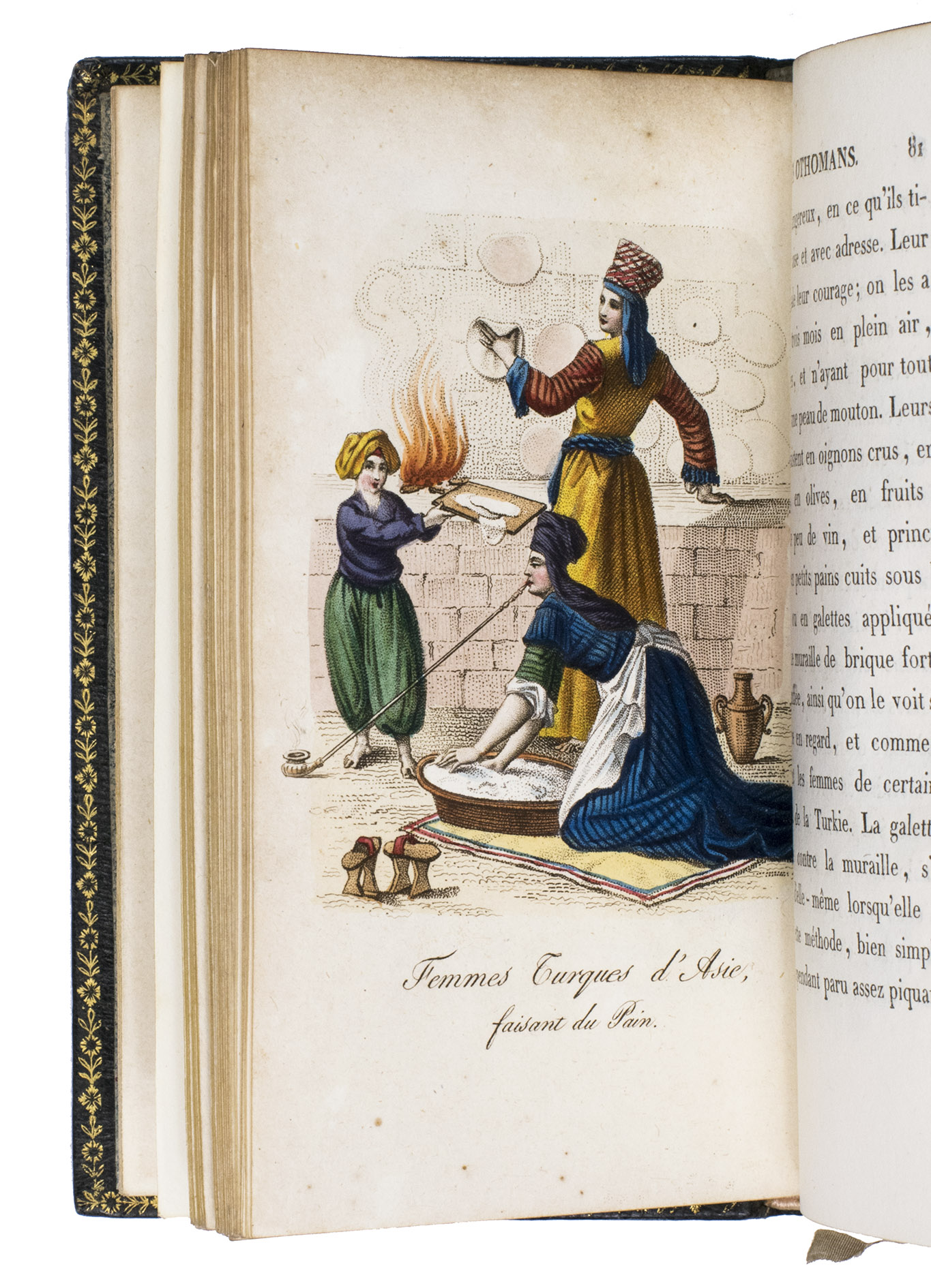 Paris, Nepveu, 1812. 6 volumes. 18mo (14 x 9 cm). With 75 hand-coloured engraved plates: a frontispiece in each volume and 17, 17, 9, and 26 plates in volumes 3, 4, 5, and 6 respectively. Most plates depict costumes, but also tools and instruments are shown. All plates are very detailed and beautifully coloured by hand, in very fresh contemporary colouring, some even finished with gold. Contemporary gold- and blined-toole purpleish-black morocco.