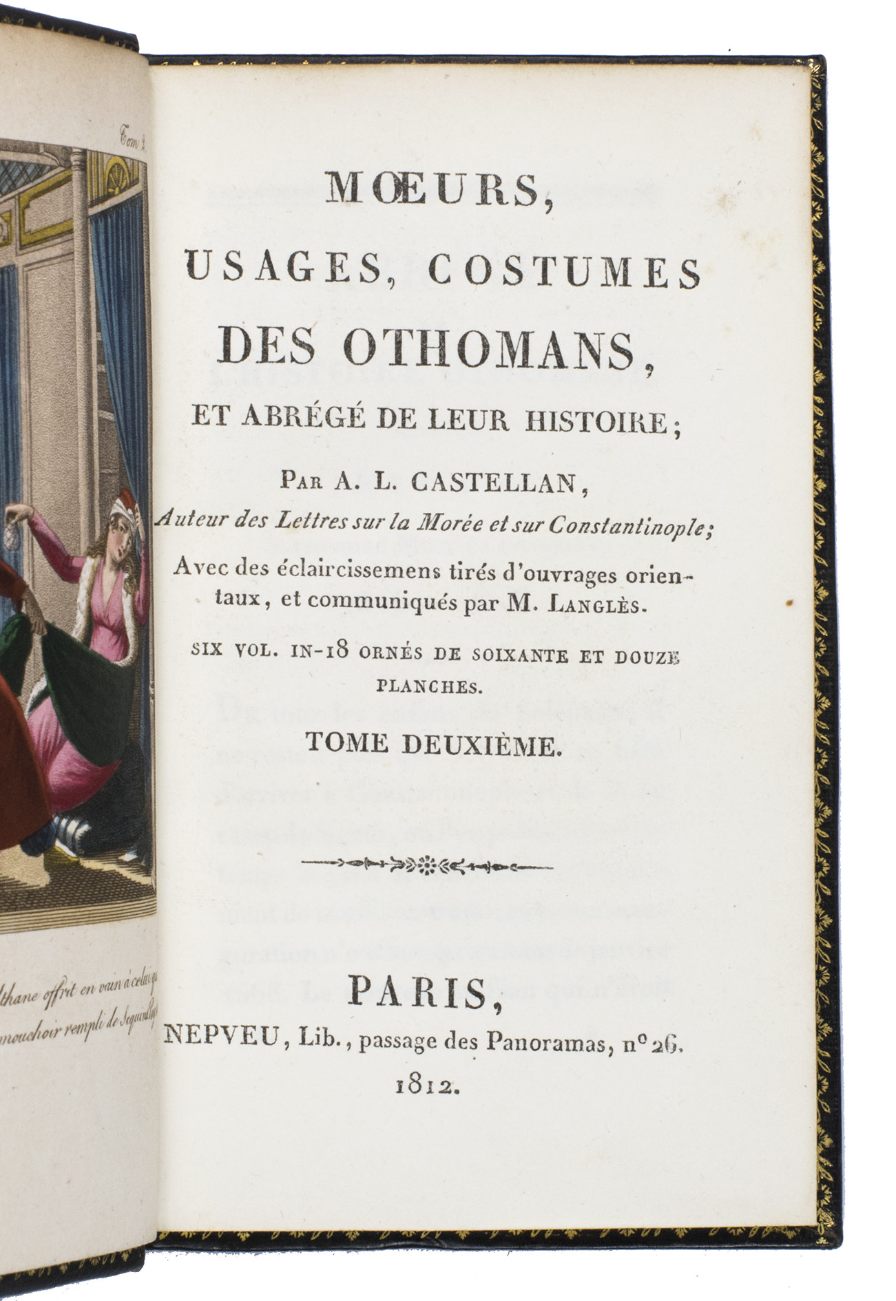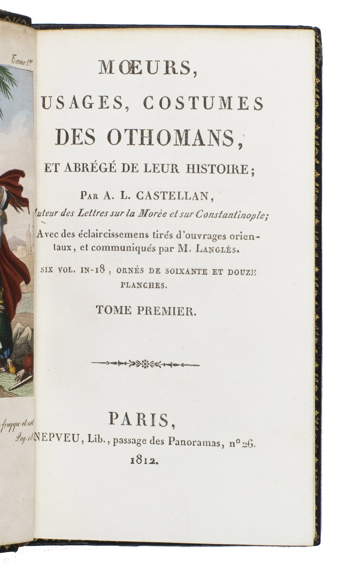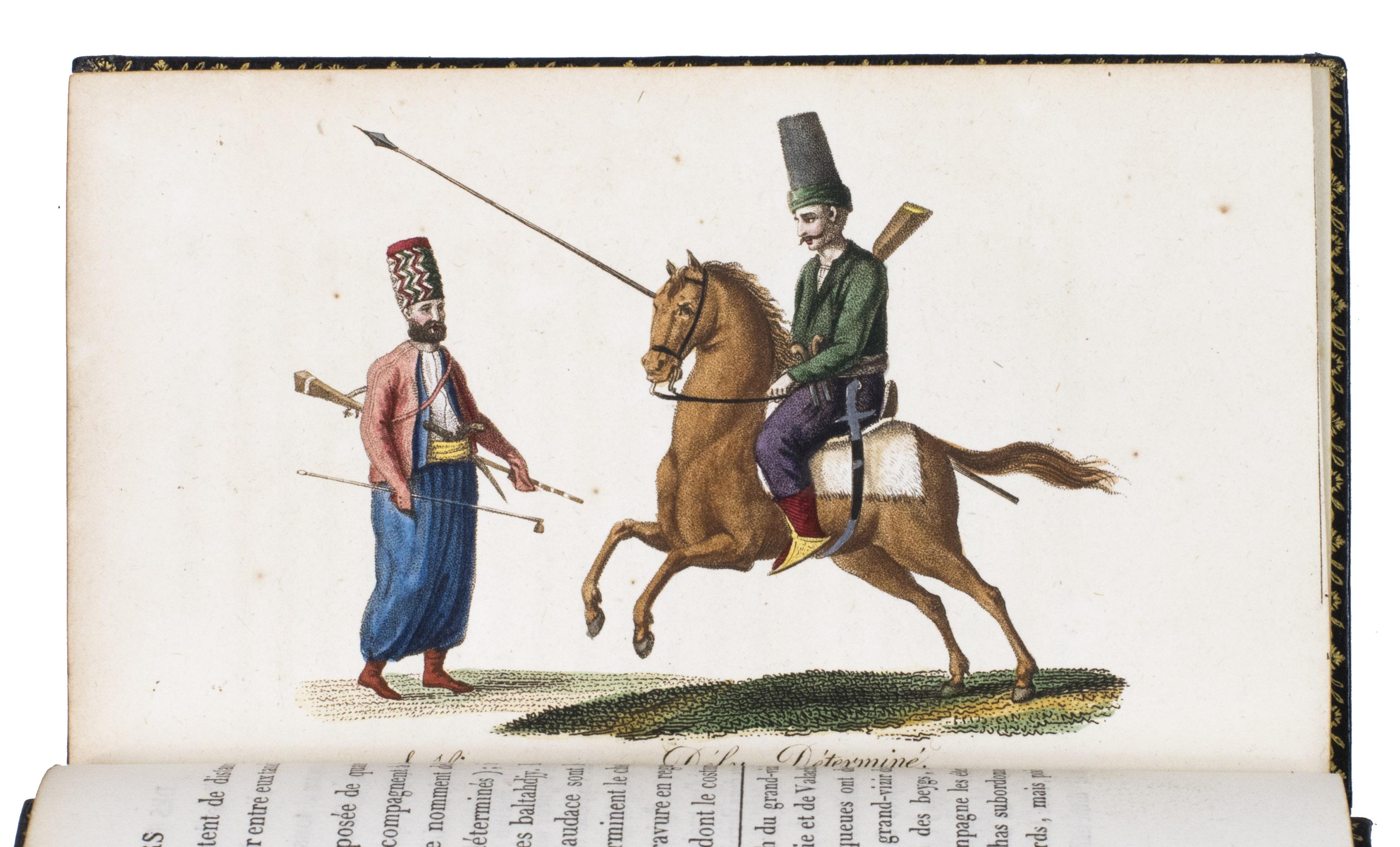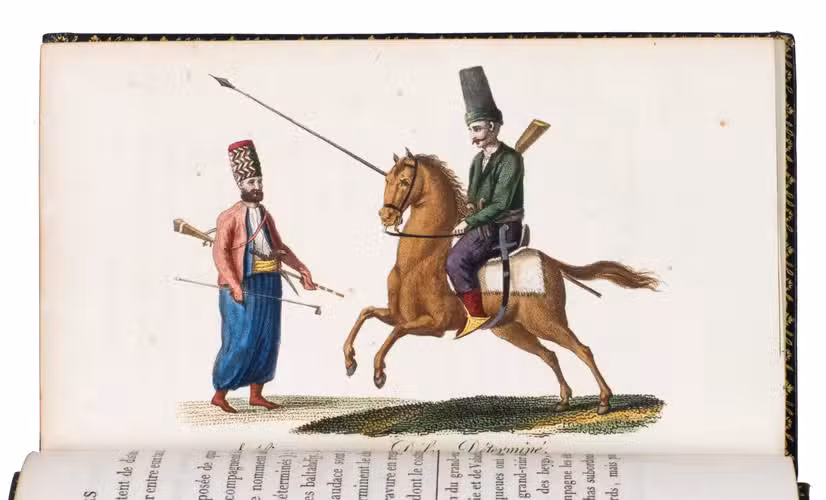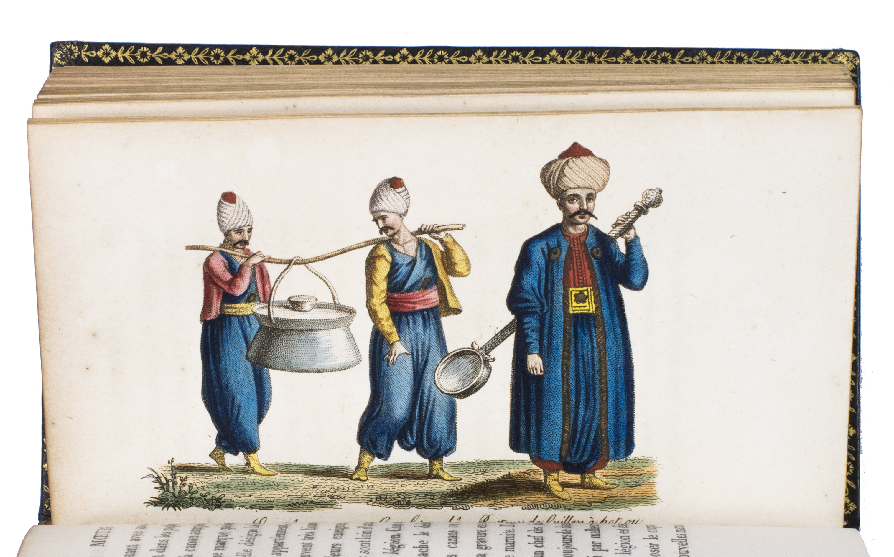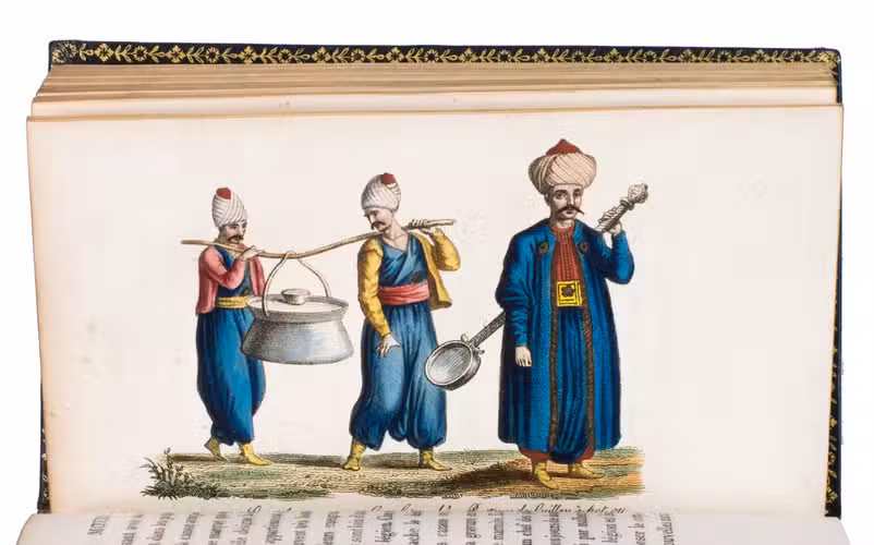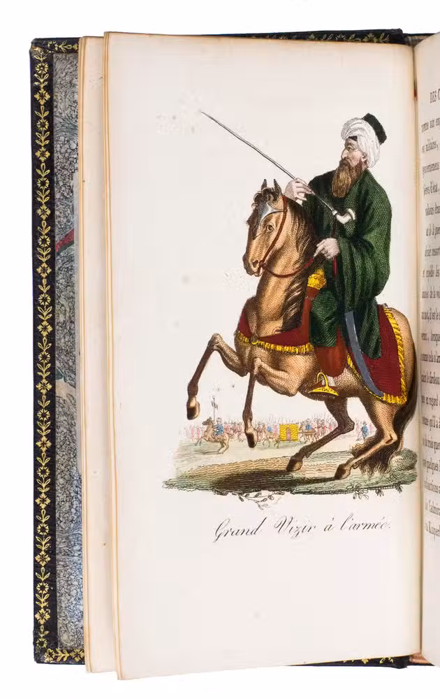 Colas, Lipperheide, Hage Chahine as well as Atabey and Blackmer (73) all mention copies with only 72 plates as is called for on the title-page; our copy has 75 plates. Two of the extra plates can be found in volume 3 (one depicting "Capydjy-Bachy Chef des Concierges" and one depicting "Bostandjy-Bachy Intendant des Jardins") and the other can be found in volume 4 (depicing a man on a camel with a portable canon by its side).