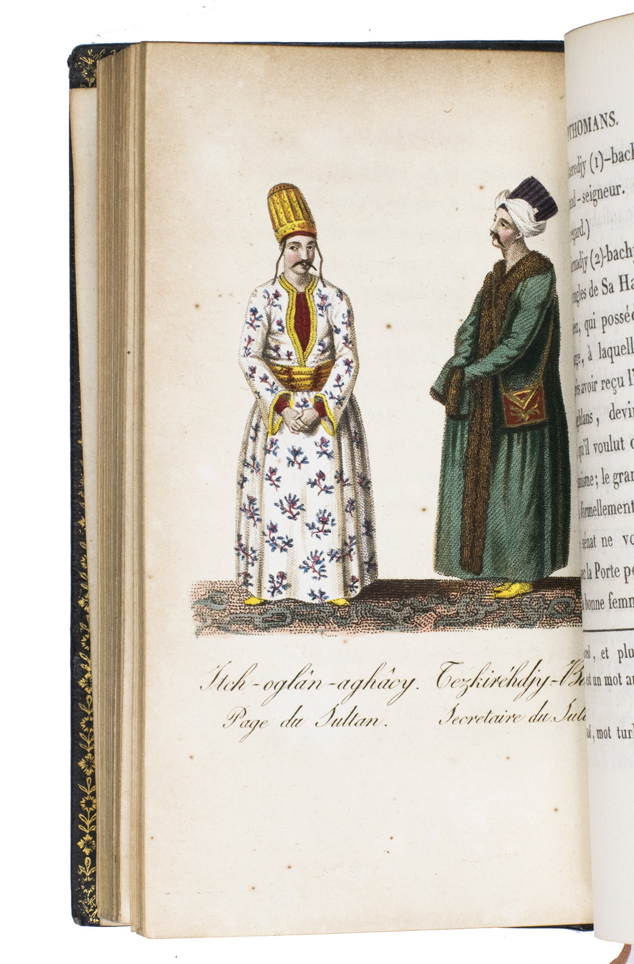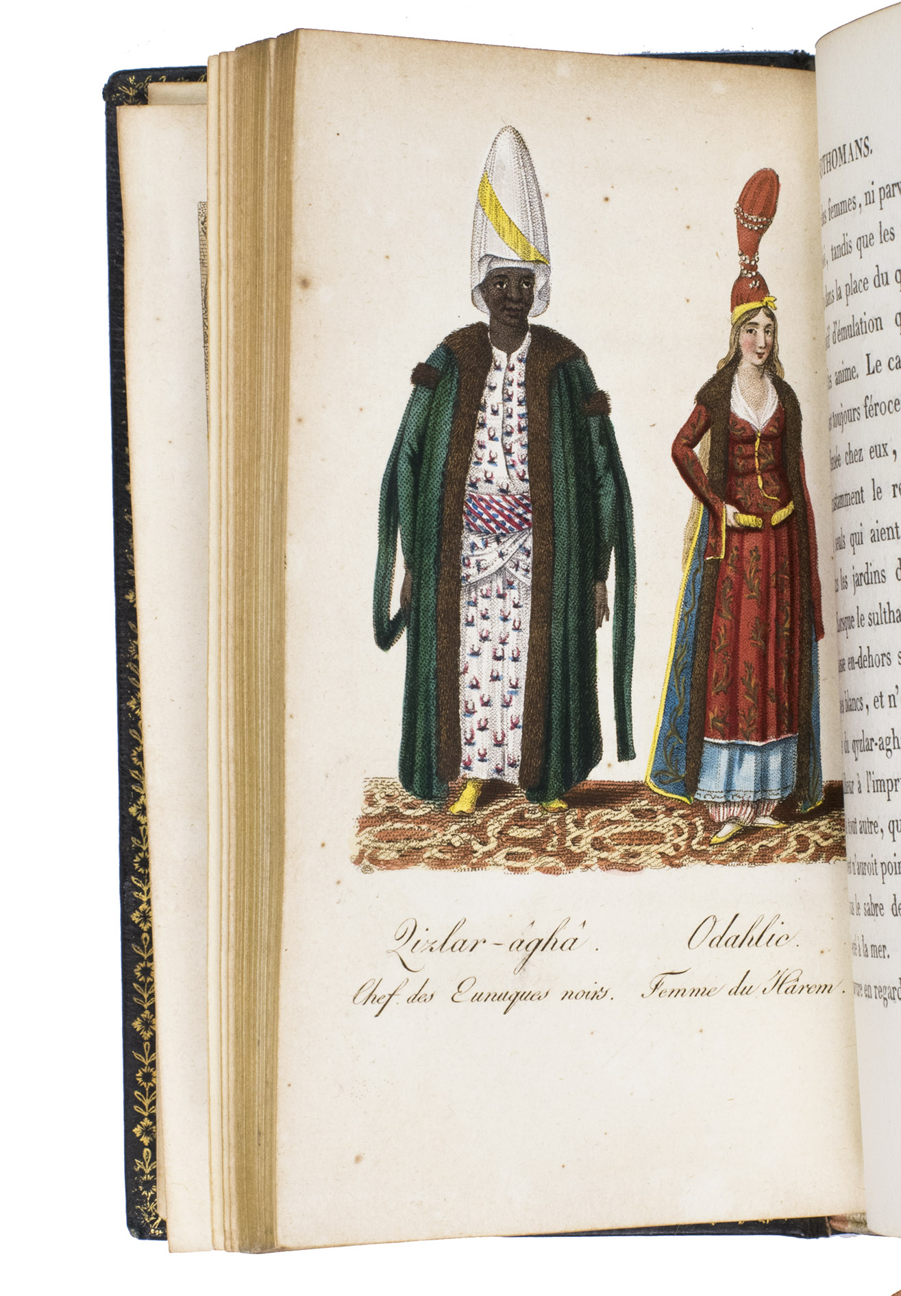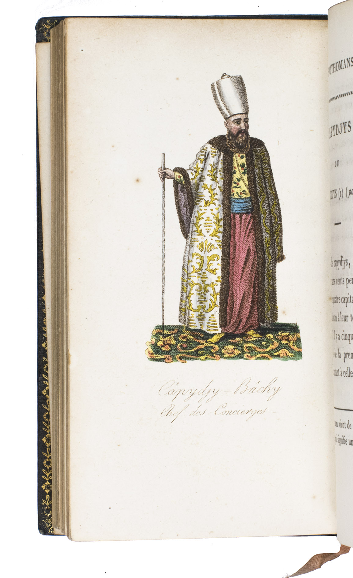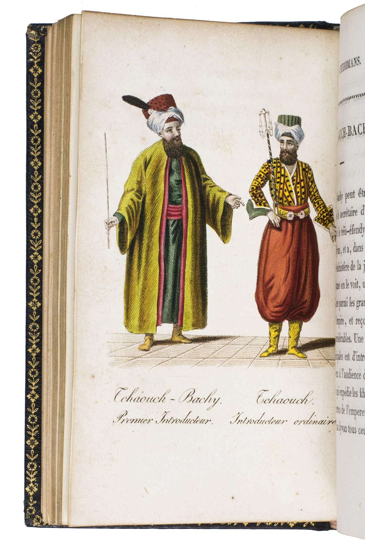 Colas, Lipperheide, Hage Chahine as well as Atabey and Blackmer (73) all mention copies with only 72 plates as is called for on the title-page; our copy has 75 plates. Two of the extra plates can be found in volume 3 (one depicting "Capydjy-Bachy Chef des Concierges" and one depicting "Bostandjy-Bachy Intendant des Jardins") and the other can be found in volume 4 (depicing a man on a camel with a portable canon by its side).
