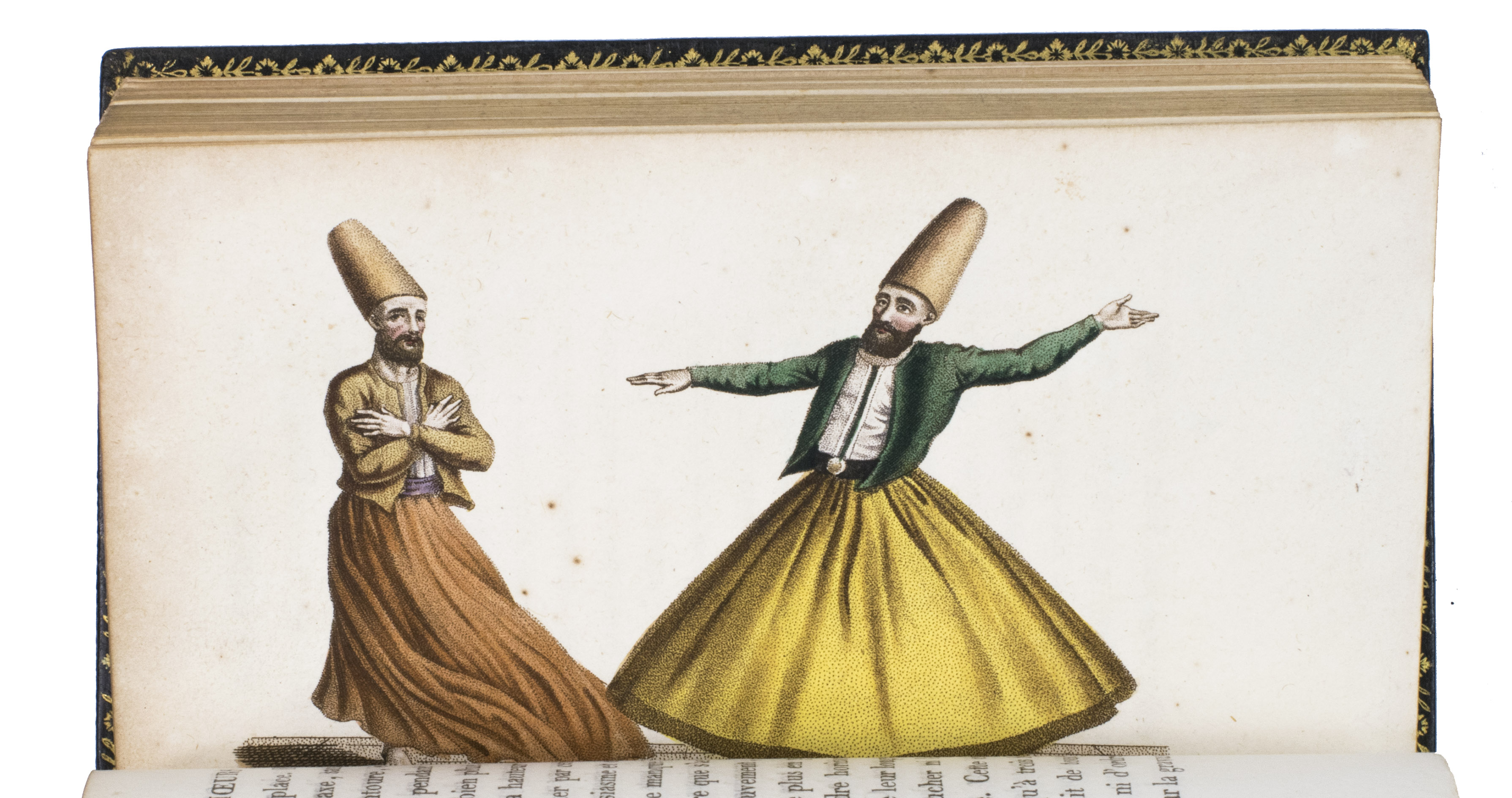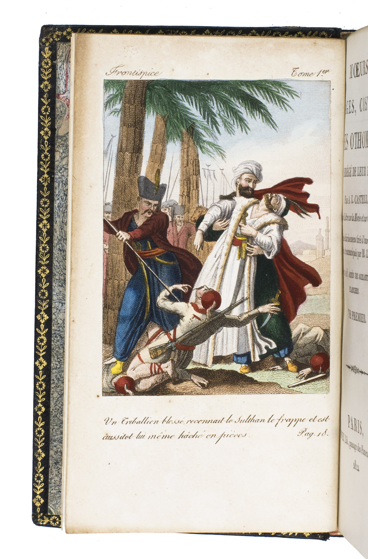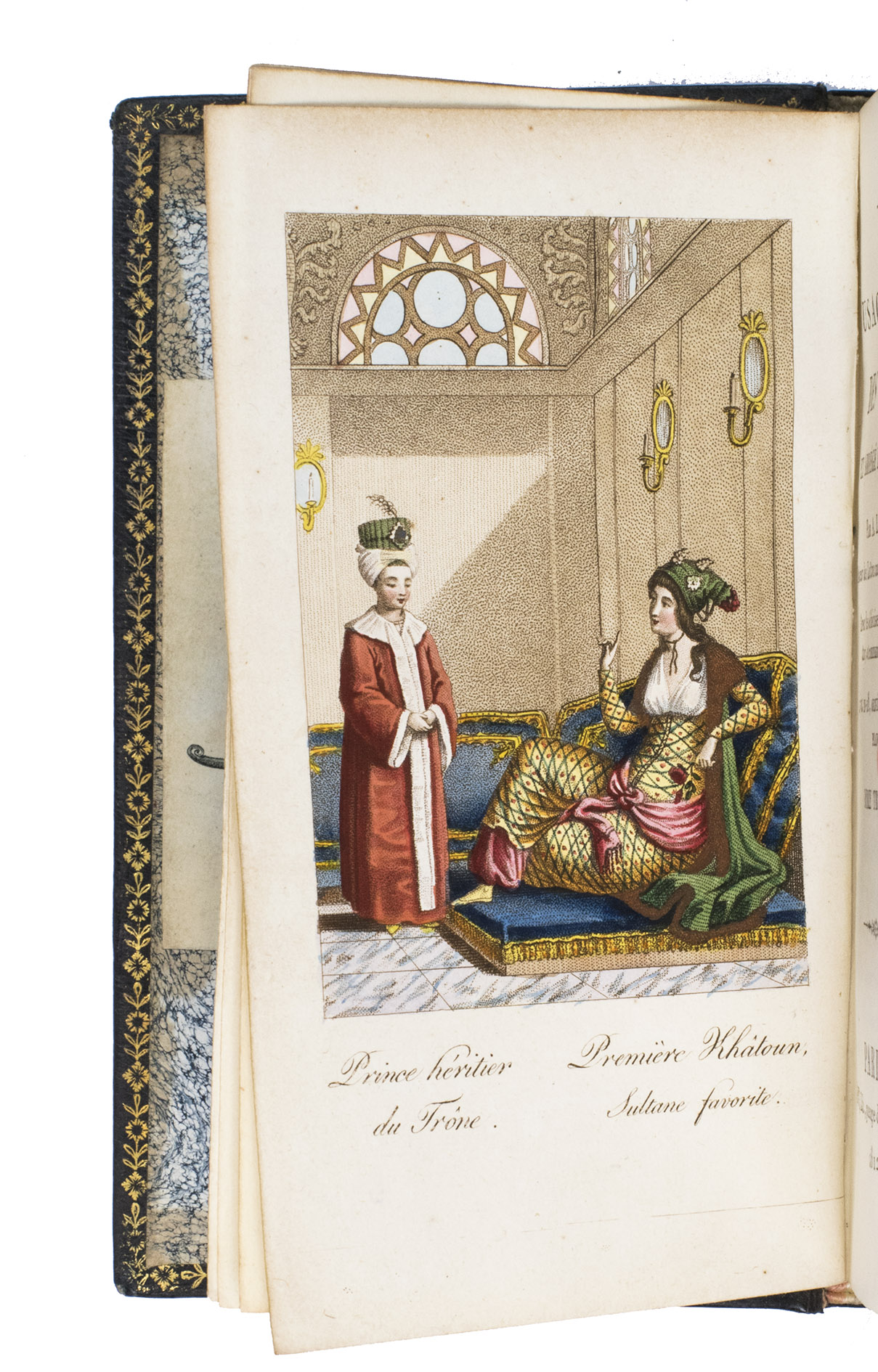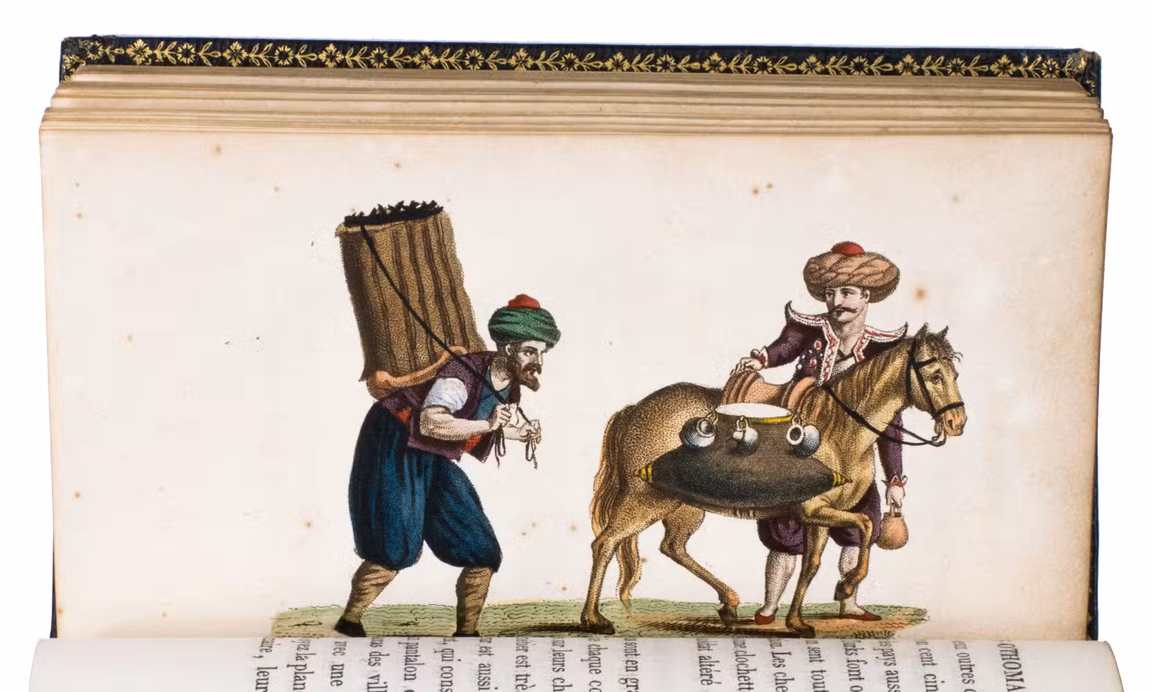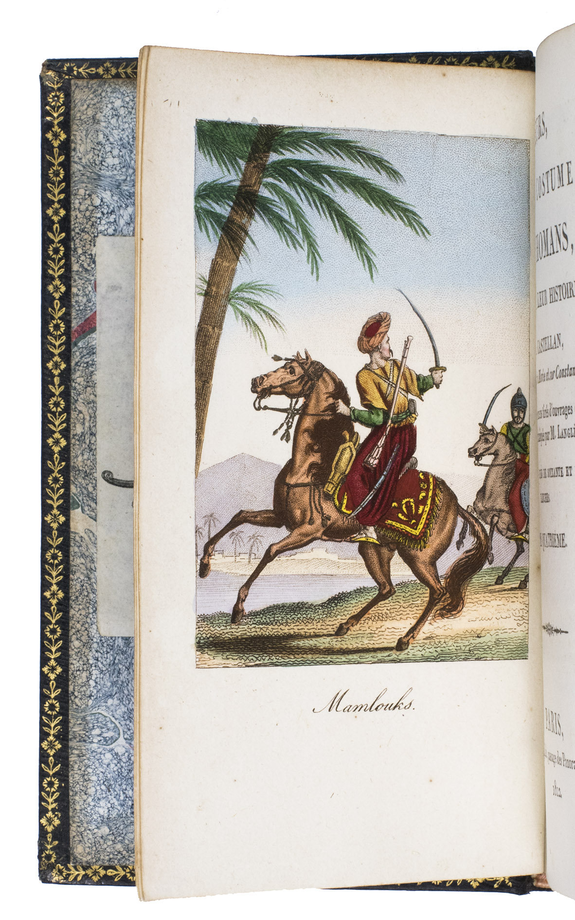 Colas, Lipperheide, Hage Chahine as well as Atabey and Blackmer (73) all mention copies with only 72 plates as is called for on the title-page; our copy has 75 plates. Two of the extra plates can be found in volume 3 (one depicting "Capydjy-Bachy Chef des Concierges" and one depicting "Bostandjy-Bachy Intendant des Jardins") and the other can be found in volume 4 (depicing a man on a camel with a portable canon by its side).