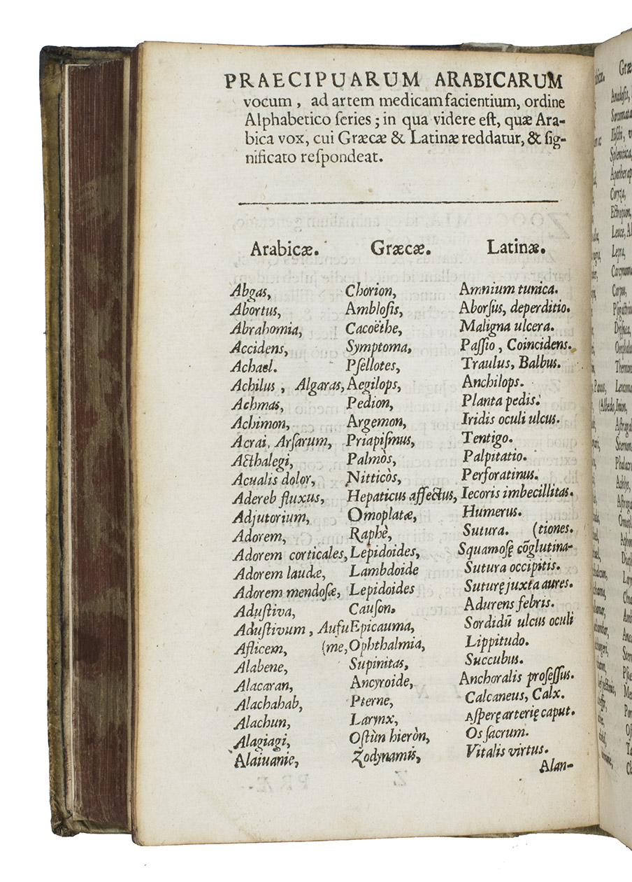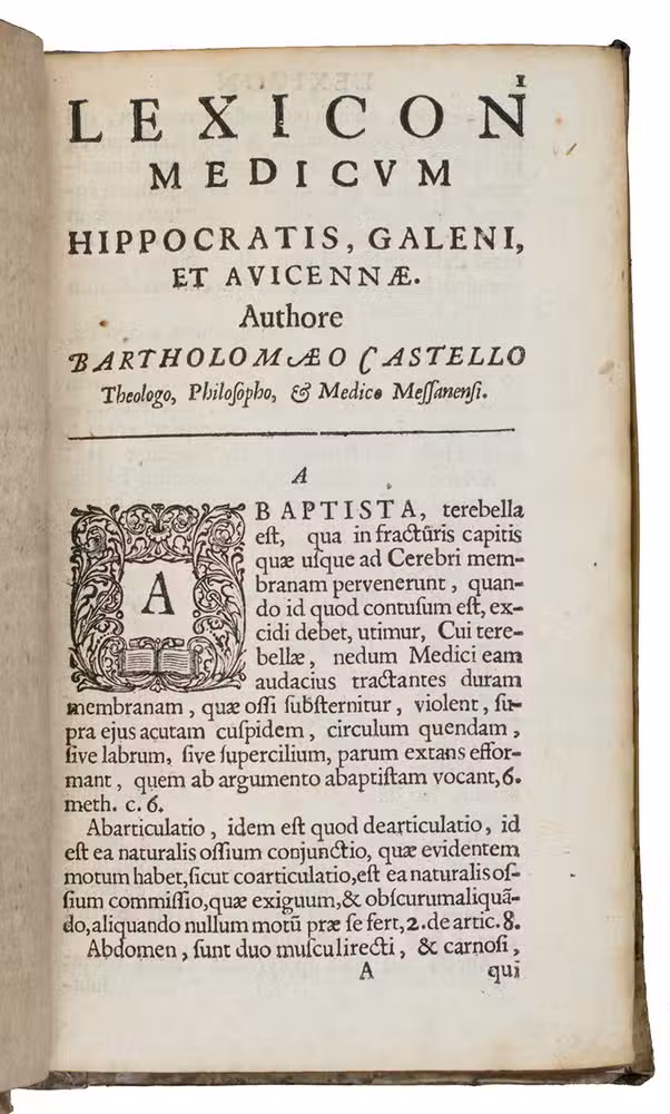 Rare first Netherlands edition (1644) of a medical dictionary first published in 1598 but expanded in later editions, giving a description and symptoms of various afflictions. "Many medical dictionaries were published in this period. The most remarkable were ... and the Greek and Latin lexica of Bartolommeo Castelli" (Garrison). Castelli (d. 1607) based much of his information on the works of Galen and Hippocrates. The main text is followed by a small dictionary translating some Arabic words into Greek and Latin, which can subsequently be looked up in the main text. Altogether an important and influential medical dictionary, functioning as main entry for doing research upon various diseases.