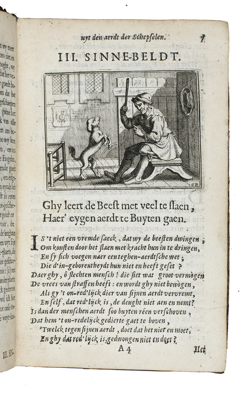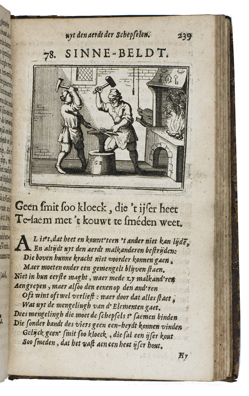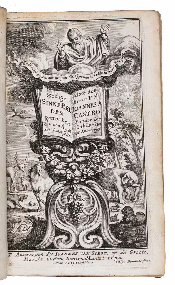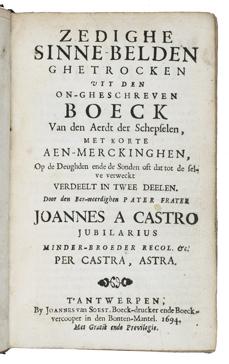 First and only edition of an educational emblem book by Johannes à Castro, or Jean van der Borcht, poet and Franciscan at Antwerp. According to the preface our author was 73 years old when he wrote the present work. He also states that he based all his emblems on nature as the teacher of men, and he claimed that even illiterate people could enjoy the book. But he clearly meant "nature" to include the human race, since many emblems are about men (and women) as well. Thus, several emblems have a merchant as the main figure, like the one with the motto: "Die ver'rijst met sijn wissel-brief, vindt buyten 'slands oock sijn gerief" (Who travels with his letter of exchange, will also find his comfort abroad), and another emblem warns against moths in the closet. He probably knew the emblems of Jacob Cats well. The printer, Joannes van Soest, set the two-page dedication to God the Father, the Son and the Holy Ghost, in about eight different types (roman, italic and textura), changing from line to line. All the emblems have a motto in the form of a distich and are accompanied by a long poem set in italic and an extensive prose explication set in roman type, with notes at the end giving the references to the scriptures. In addition to their religious and moral aspects, and their views of animals (most often in their contacts with people), the emblems show a wide variety of objects, activities and professions in scenes of daily life in 1694, including bloodletting and blacksmithing. They also show the rising interest in exotic lands, for example with two south Asian men attempting to capture an elephant, which seems to be capturing one of them. Although the text is nominally divided into two parts (emblems 1-57 in the first and 58-100 in the second), the second begins with only a drop-title on L7r, so the book could not reasonably be bound in two volumes. Gaspar Bouttats (1625-1695), a famous Antwerp engraver, provided the frontispiece (showing God the father looking down onto a landscape with a wide variety of animals, including an elephant) and all the emblems. An index of all mottoes is given at the end.