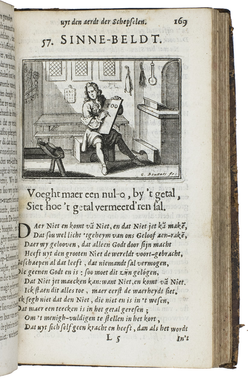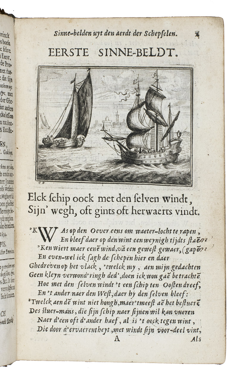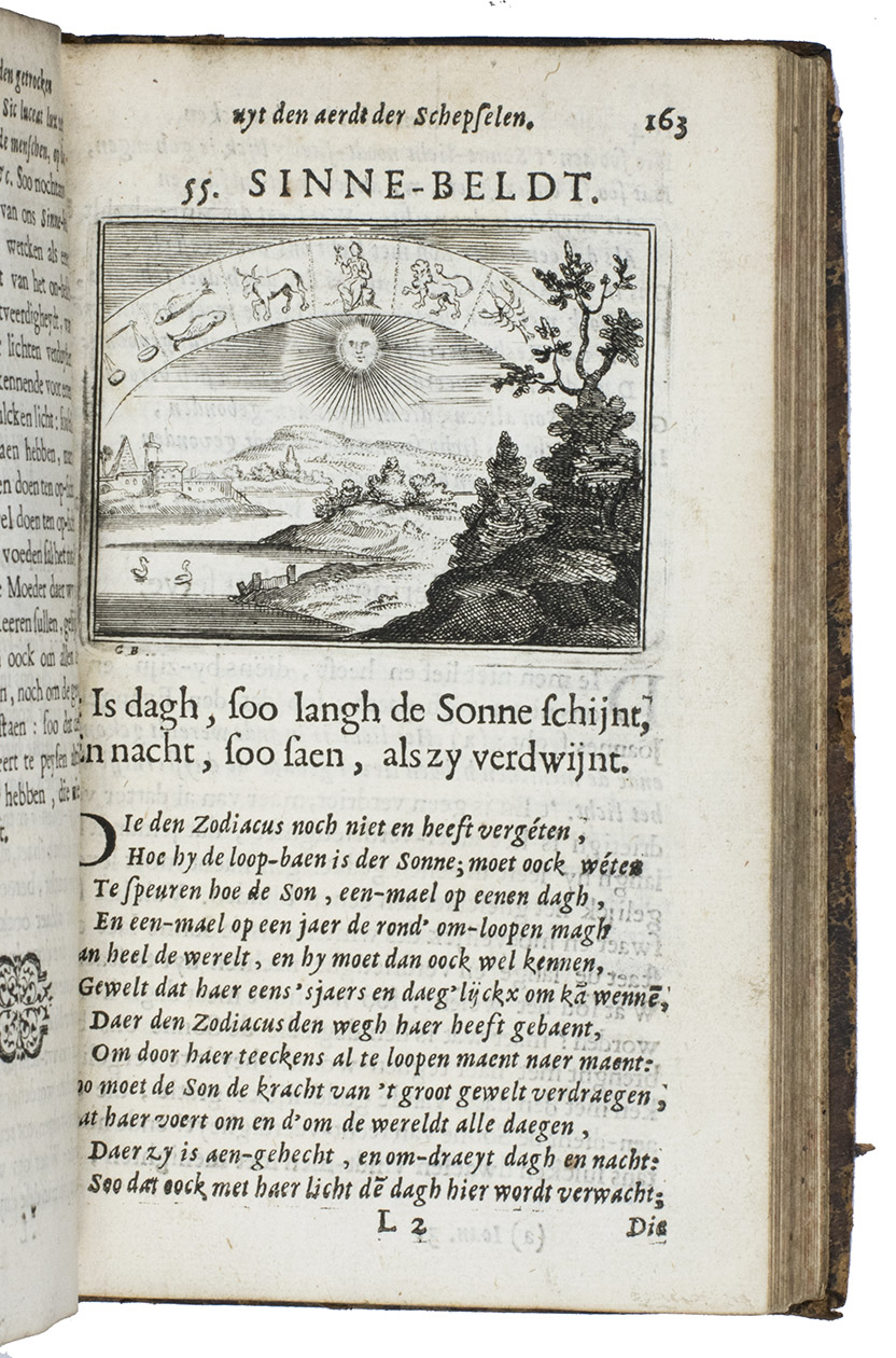 First and only edition of an educational emblem book by Johannes à Castro, or Jean van der Borcht, poet and Franciscan at Antwerp. According to the preface our author was 73 years old when he wrote the present work. He also states that he based all his emblems on nature as the teacher of men, and he claimed that even illiterate people could enjoy the book. But he clearly meant "nature" to include the human race, since many emblems are about men (and women) as well. Thus, several emblems have a merchant as the main figure, like the one with the motto: "Die ver'rijst met sijn wissel-brief, vindt buyten 'slands oock sijn gerief" (Who travels with his letter of exchange, will also find his comfort abroad), and another emblem warns against moths in the closet. He probably knew the emblems of Jacob Cats well. The printer, Joannes van Soest, set the two-page dedication to God the Father, the Son and the Holy Ghost, in about eight different types (roman, italic and textura), changing from line to line. All the emblems have a motto in the form of a distich and are accompanied by a long poem set in italic and an extensive prose explication set in roman type, with notes at the end giving the references to the scriptures. In addition to their religious and moral aspects, and their views of animals (most often in their contacts with people), the emblems show a wide variety of objects, activities and professions in scenes of daily life in 1694, including bloodletting and blacksmithing. They also show the rising interest in exotic lands, for example with two south Asian men attempting to capture an elephant, which seems to be capturing one of them. Although the text is nominally divided into two parts (emblems 1-57 in the first and 58-100 in the second), the second begins with only a drop-title on L7r, so the book could not reasonably be bound in two volumes. Gaspar Bouttats (1625-1695), a famous Antwerp engraver, provided the frontispiece (showing God the father looking down onto a landscape with a wide variety of animals, including an elephant) and all the emblems. An index of all mottoes is given at the end.