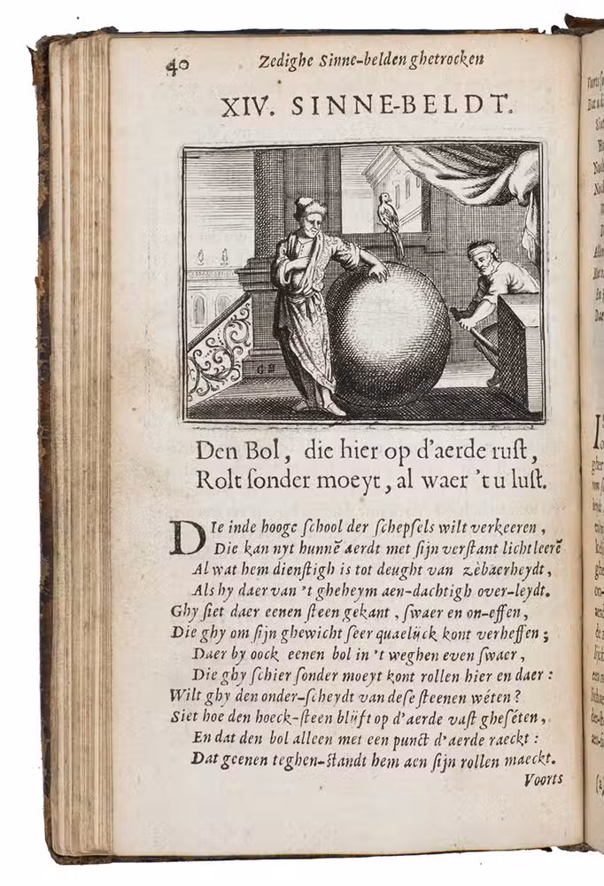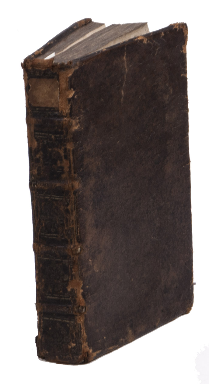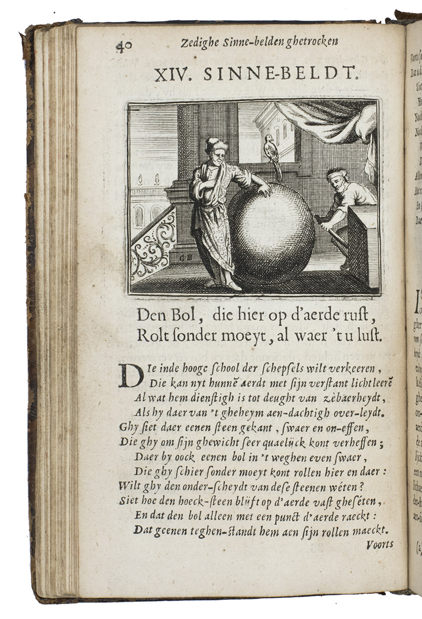 Antwerp, Joannes van Soest, 1694. 8vo. With richly engraved allegorical frontispiece and 100 finely engraved half-page emblems, all by Gaspar Bouttats. Further with 3 woodcut tailpieces, three woodcur decorated initials (1 series) and an occasional decoration built up from typographic ornaments Contemporary mottled tanned sheepskin. [24], 316, [10], [2 blank] pp.