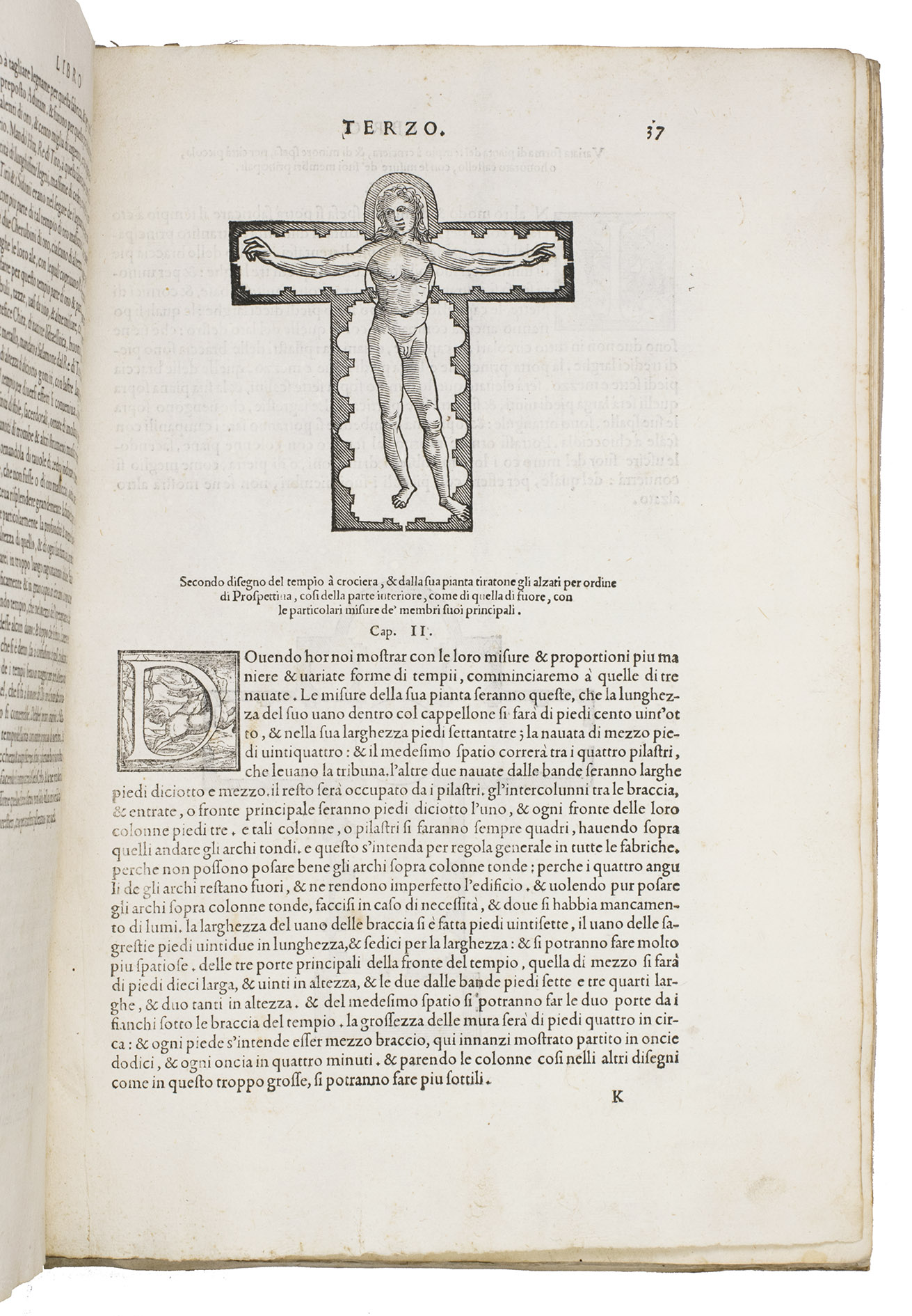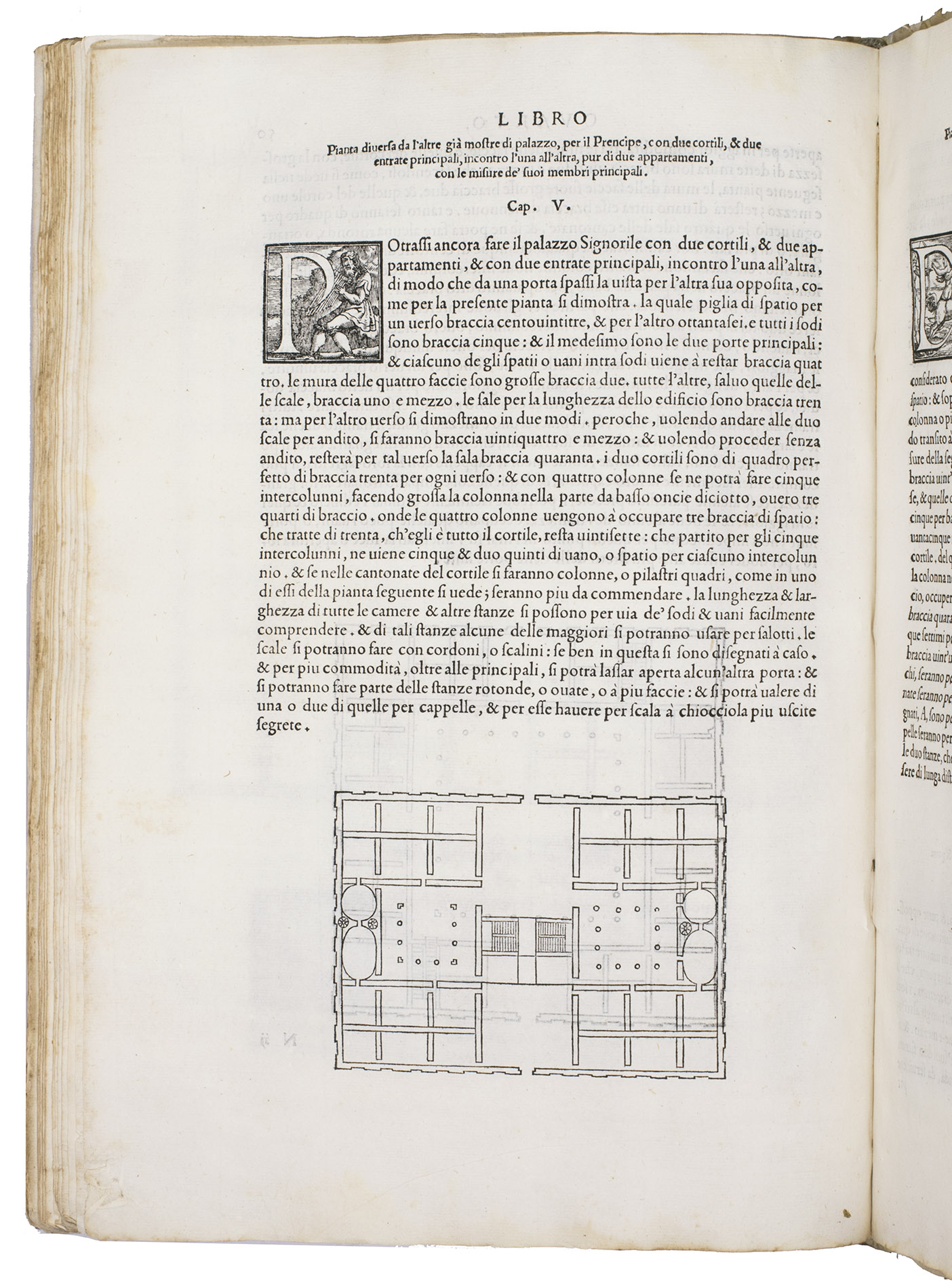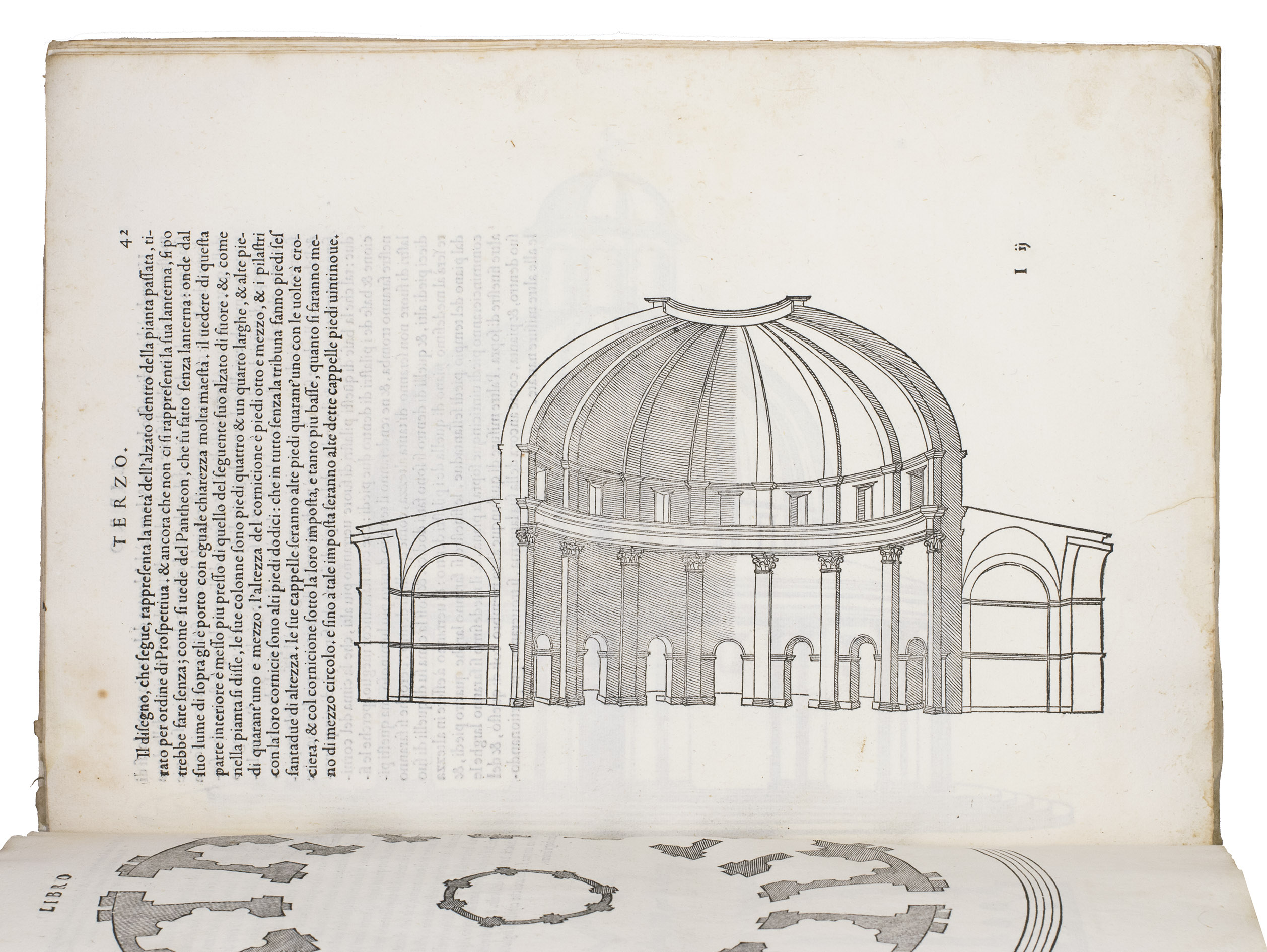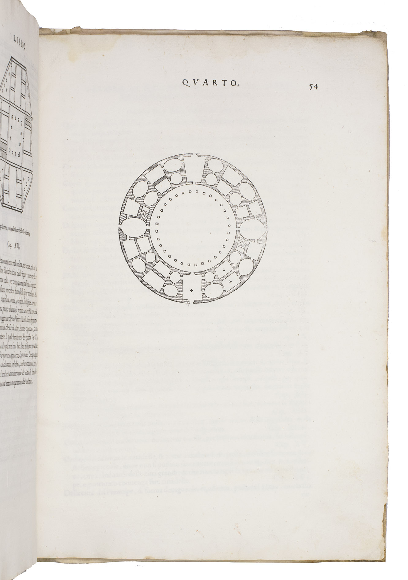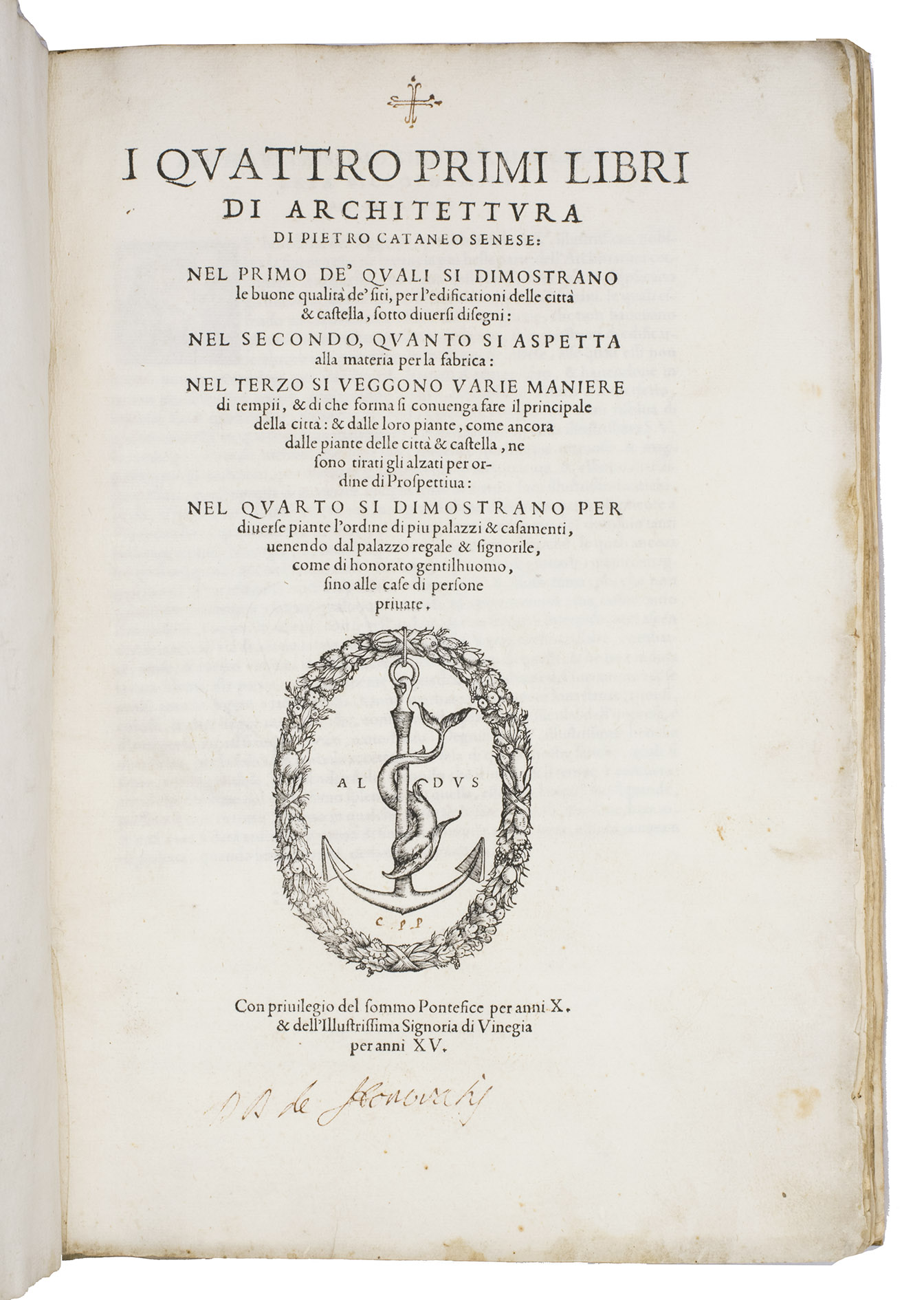 Rare first edition of a beautiful Renaissance woodcut book on architecture and perspectival design by Pietro Cataneo (died 1569), architect in Siena, where he built the Palazzo Franceschini and other important buildings in the Republic of Siena.