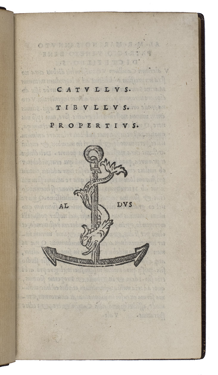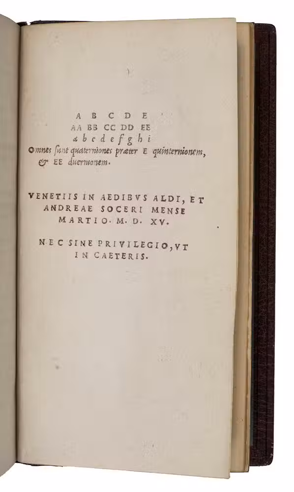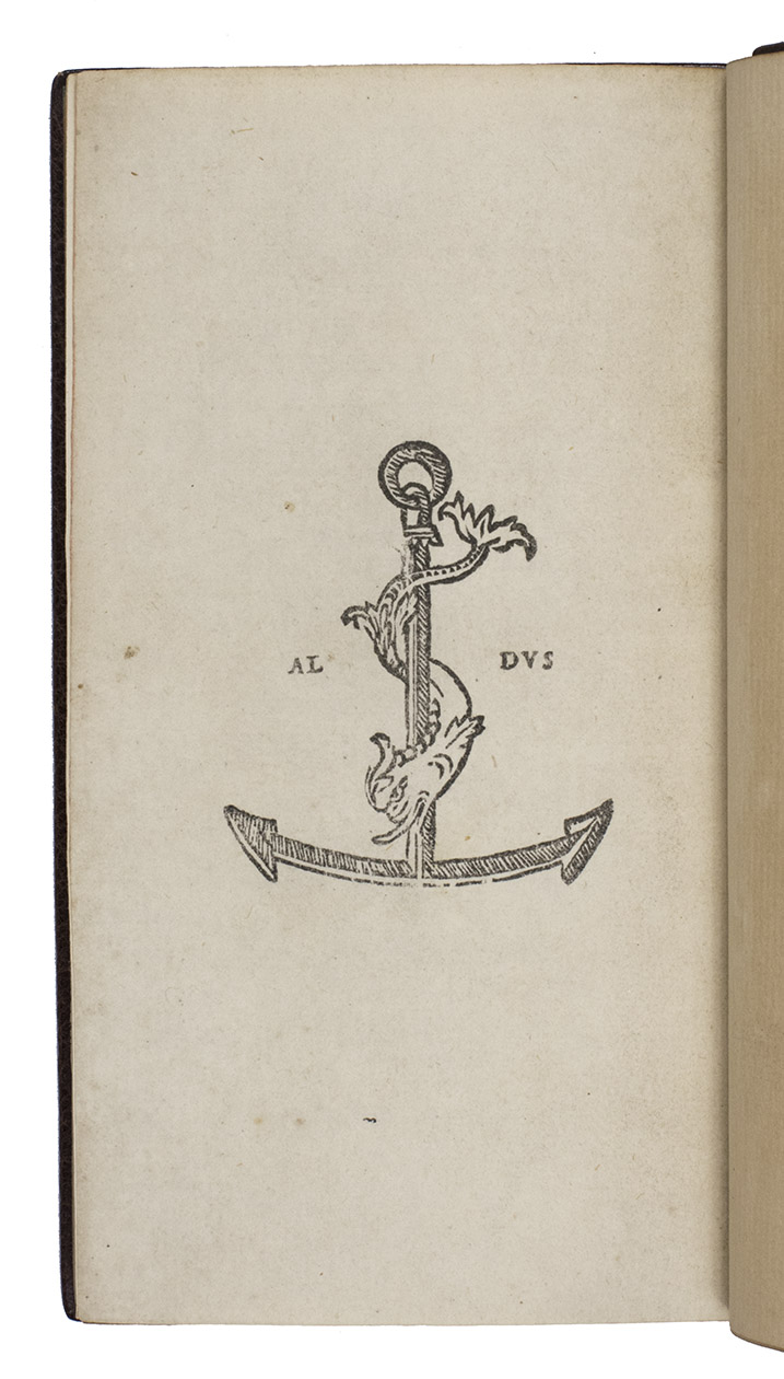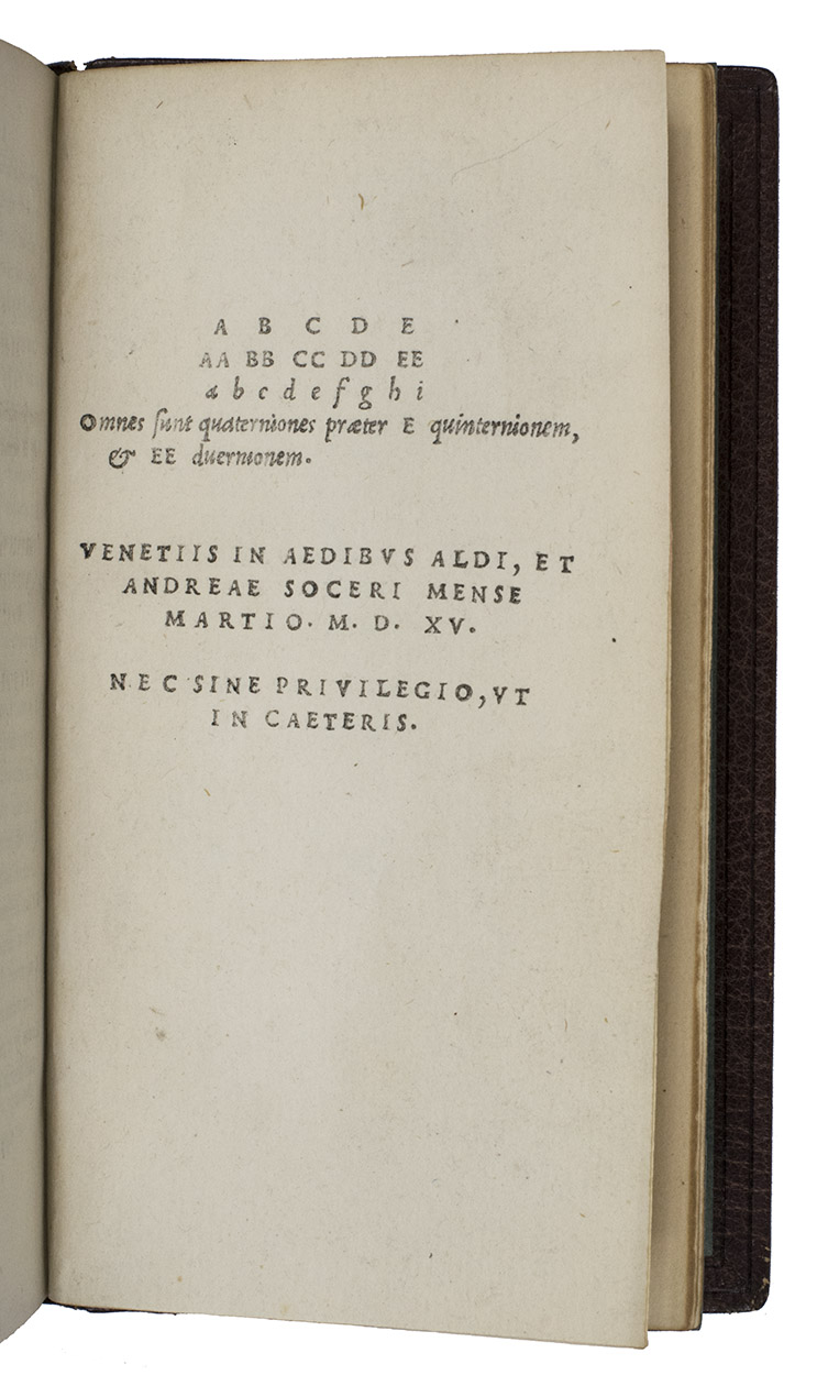 [colophon:] Venice, the heirs of Aldo I Manuzio & Andrea I Torresano, March 1515. 8vo. With Aldos woodcut anker and dolphin device on the title-page and on the verso of the last leaf, each flanked by "AL ... DVS" in letterpress capitals. Set in Aldos italic type (with upright capitals), the first italic printing type. Blind-tooled brown goatskin morocco (early 20th-century) by the Paris bookbinder G. Vignal (active ca. 1890-ca. 1930), signed with a blind stamp in the foot of the front turn-in ("G. VIGNAL REL. DOR.". 148, [2] ll.