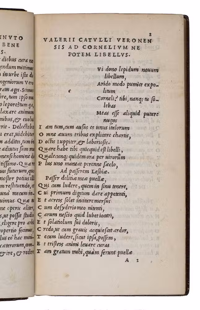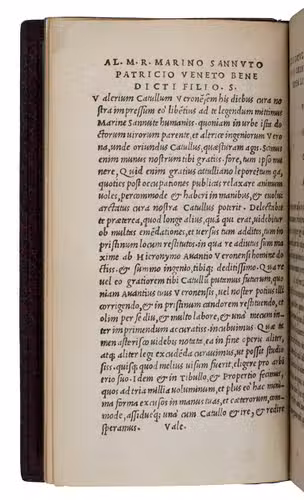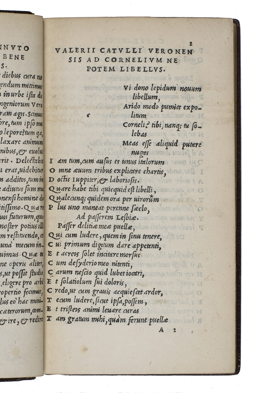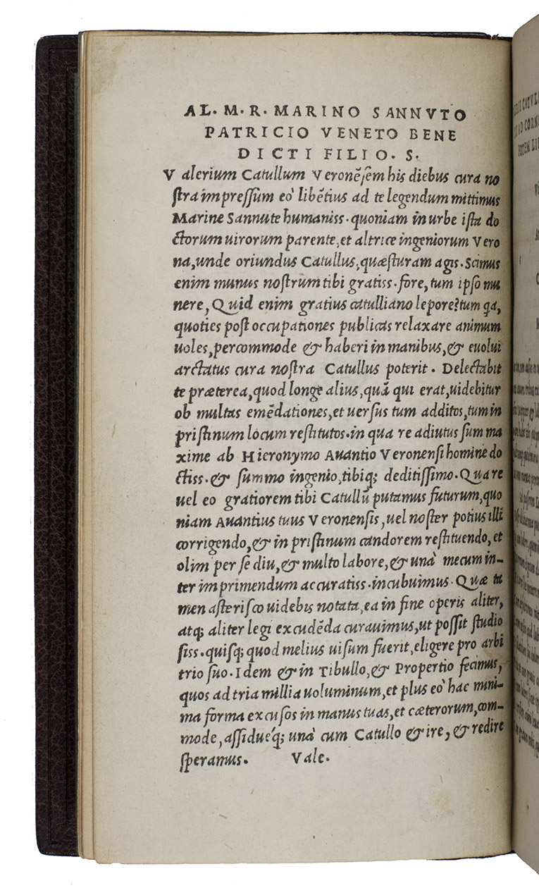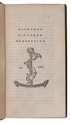 [colophon:] Venice, the heirs of Aldo I Manuzio & Andrea I Torresano, March 1515. 8vo. With Aldos woodcut anker and dolphin device on the title-page and on the verso of the last leaf, each flanked by "AL ... DVS" in letterpress capitals. Set in Aldos italic type (with upright capitals), the first italic printing type. Blind-tooled brown goatskin morocco (early 20th-century) by the Paris bookbinder G. Vignal (active ca. 1890-ca. 1930), signed with a blind stamp in the foot of the front turn-in ("G. VIGNAL REL. DOR.". 148, [2] ll.