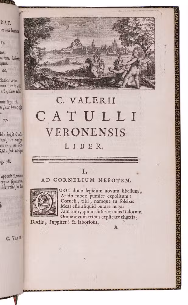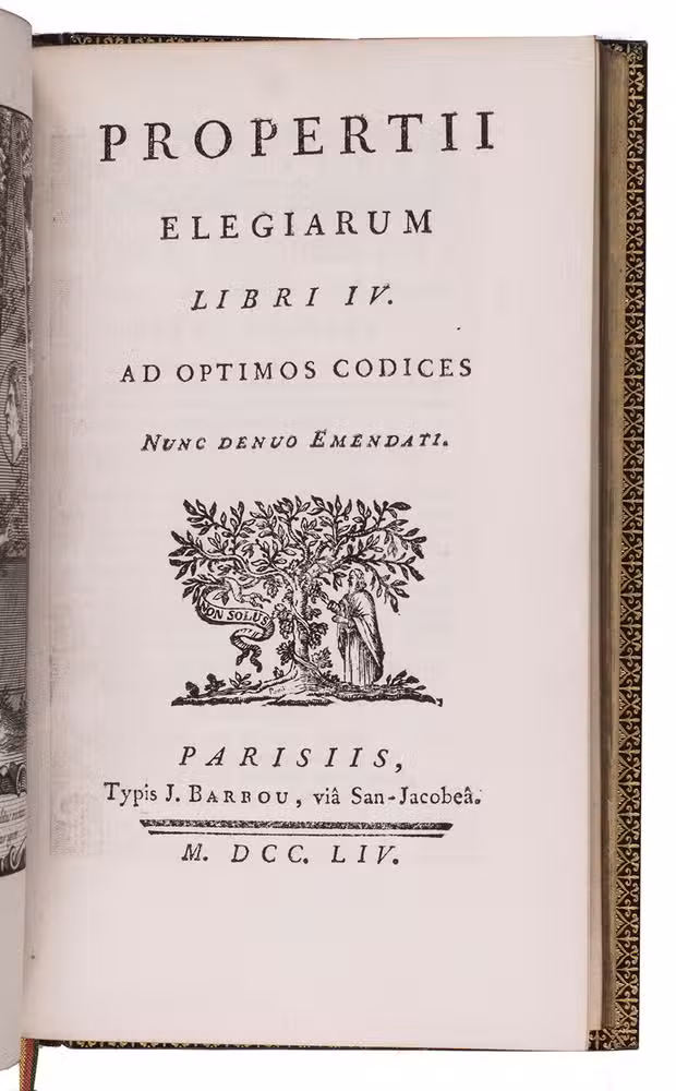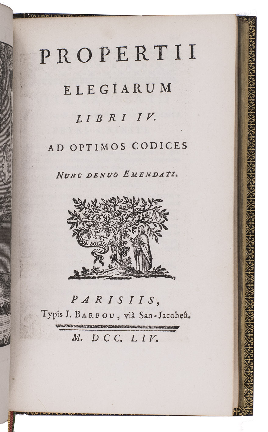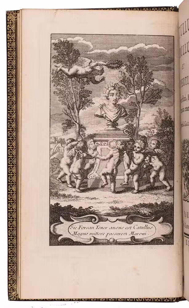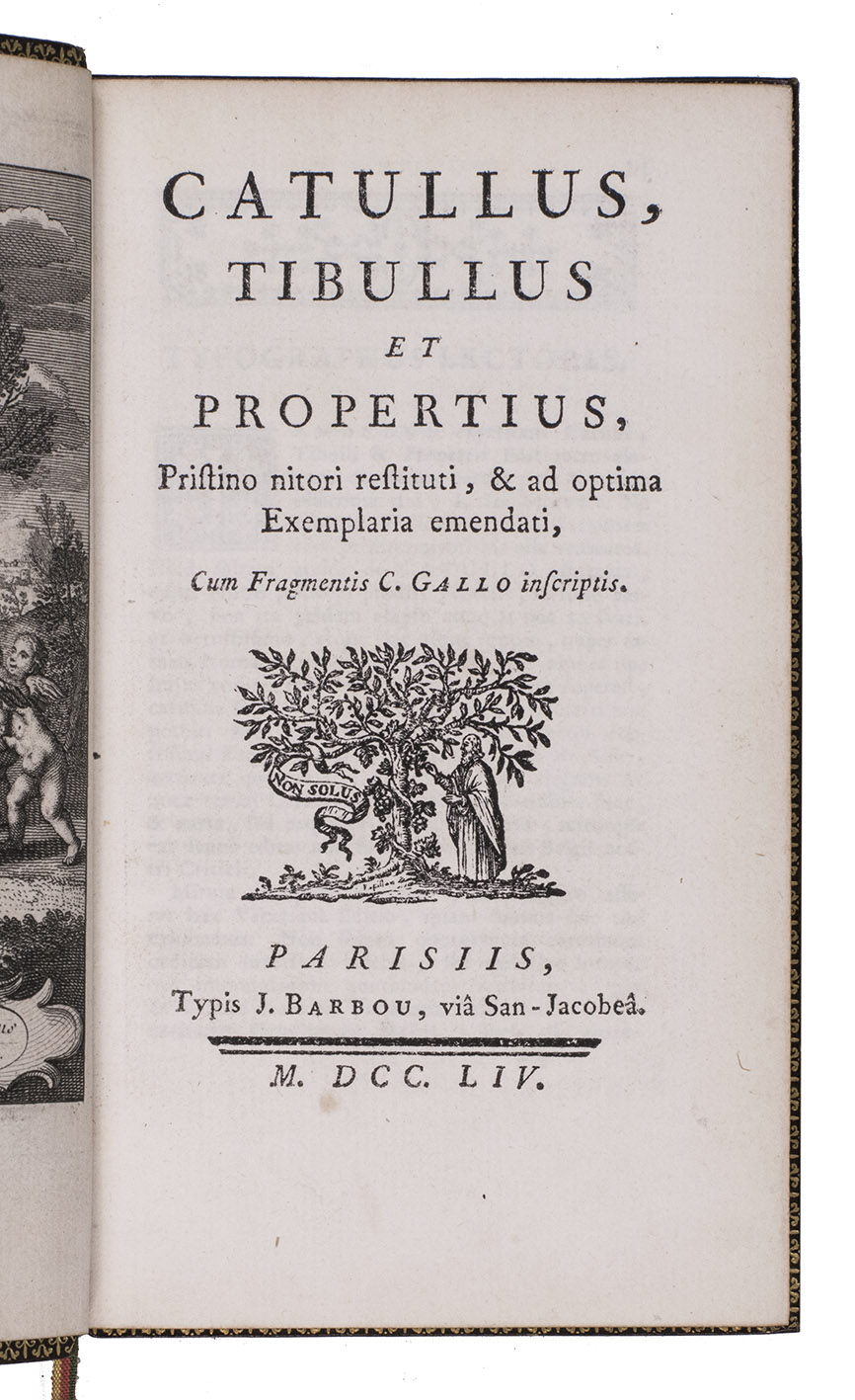 Collection of the works of the three most important Roman lyrical and elegiac poets of the first century BC: Gaius Valerius Catullus (84-55 BC), Albius Tibullus (54-19 BC), and Sextus Propertius (50-15 BC), as edited by Avantius. The first edition of these works as edited by Nicolas Lenglet Dufresnoy (1674-1755) had appeared in 1742 with the same publisher.