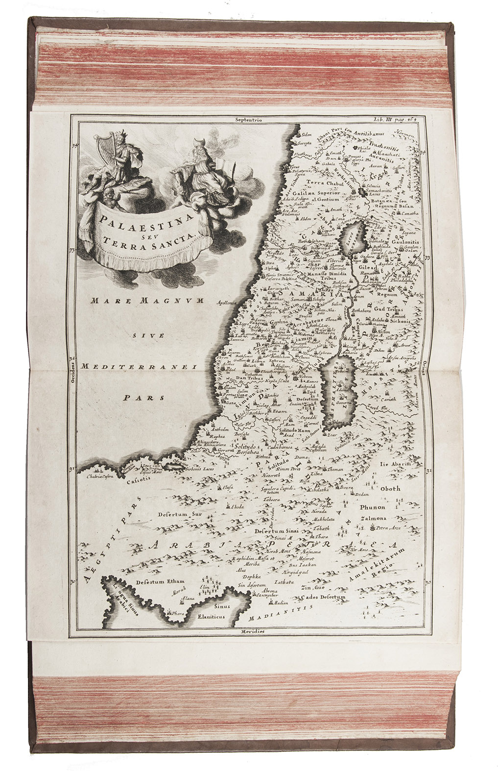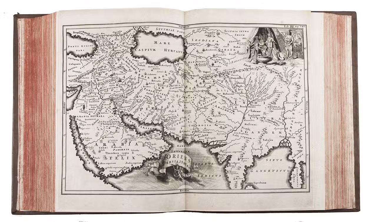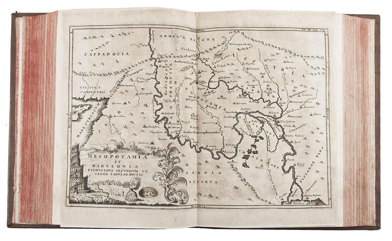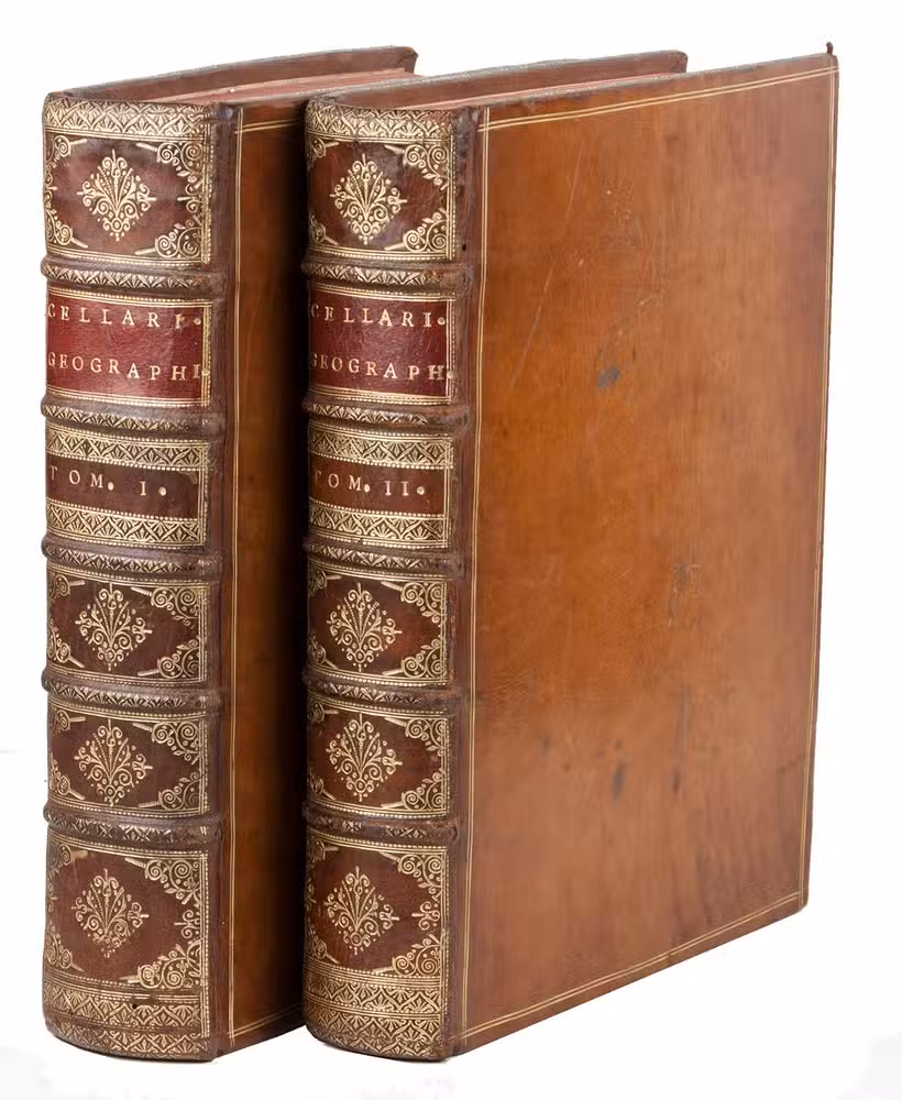 Second edition of a geographical description/atlas of Europe, Asia, the Middle East and North Africa on the basis of classical and other sources (such as medieval Hebrew), with 33 detailed maps. Volume two opens with a part on Asia, including the Middle East, with chapters describing Syria, Palestine, Arabia and Mesopotamia, each with a detailed engraved map. Sandys considered Notitia orbis antiqui Cellarius's most important work. At the end of the second volume there are three pages of American interest, Additamentum de nove orbe.