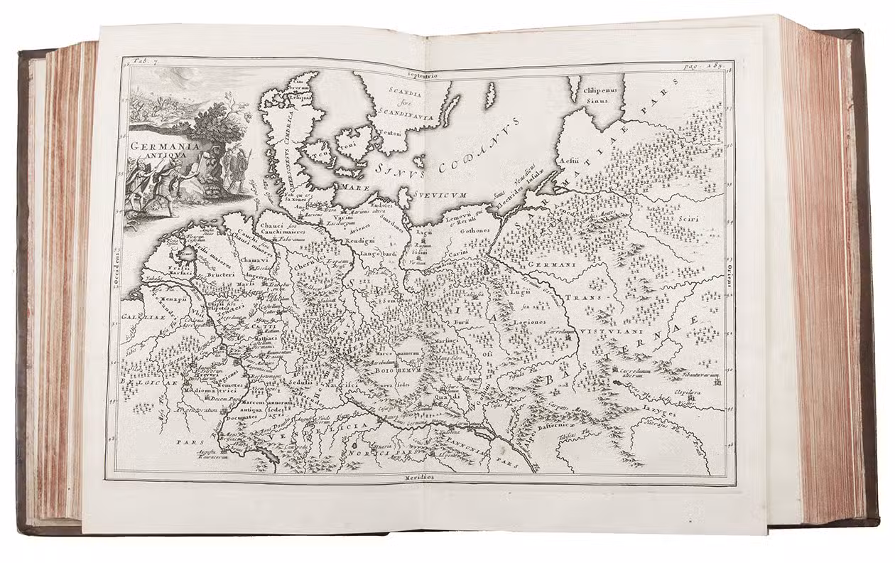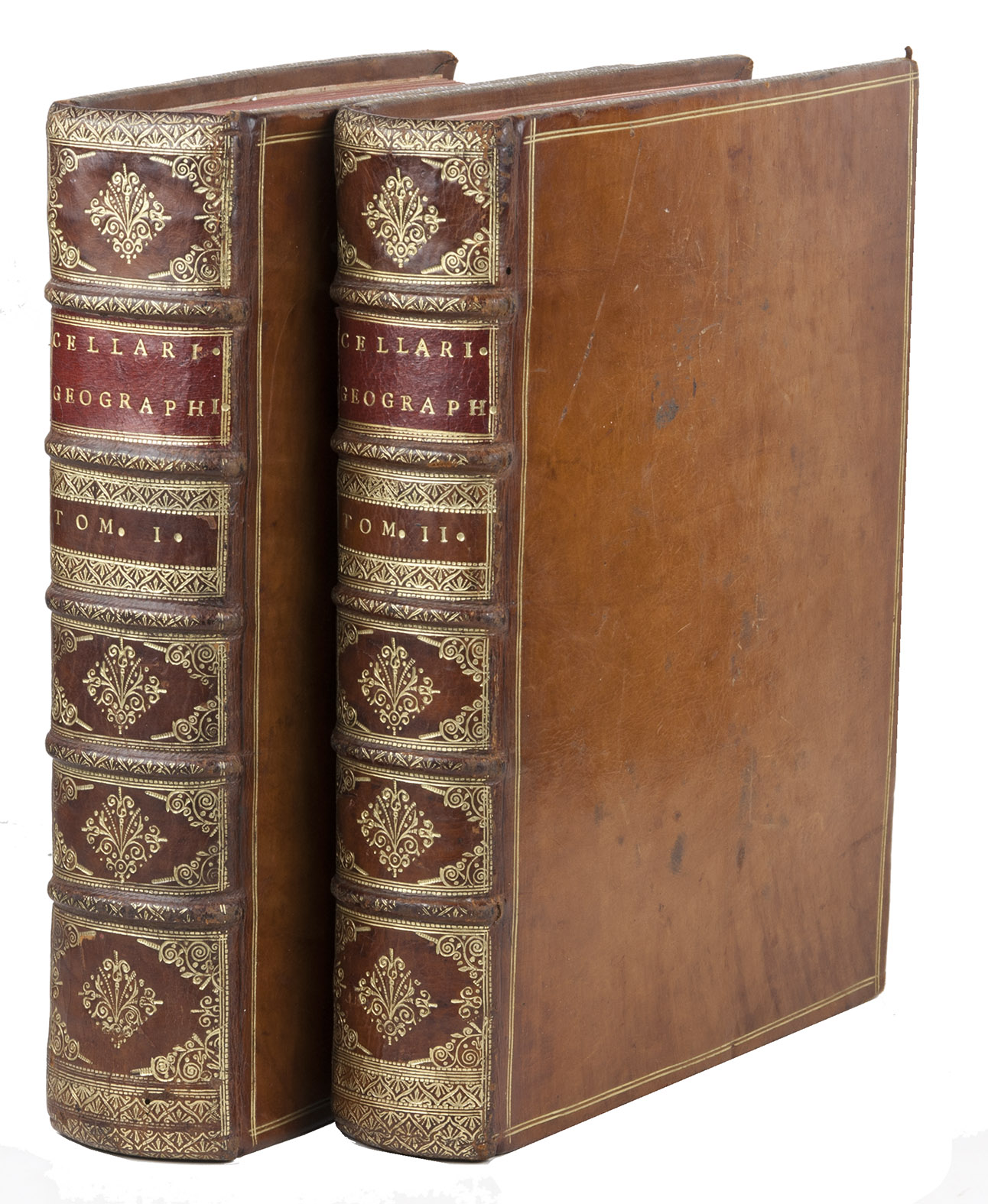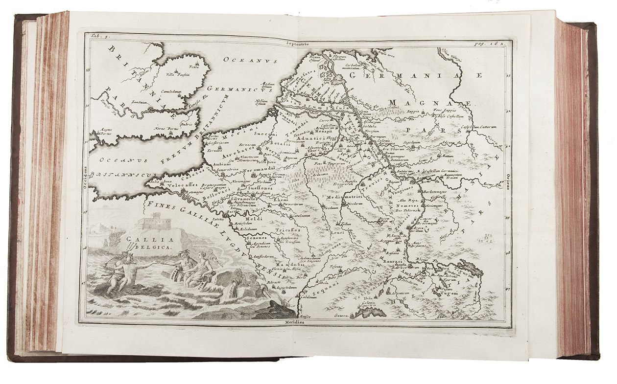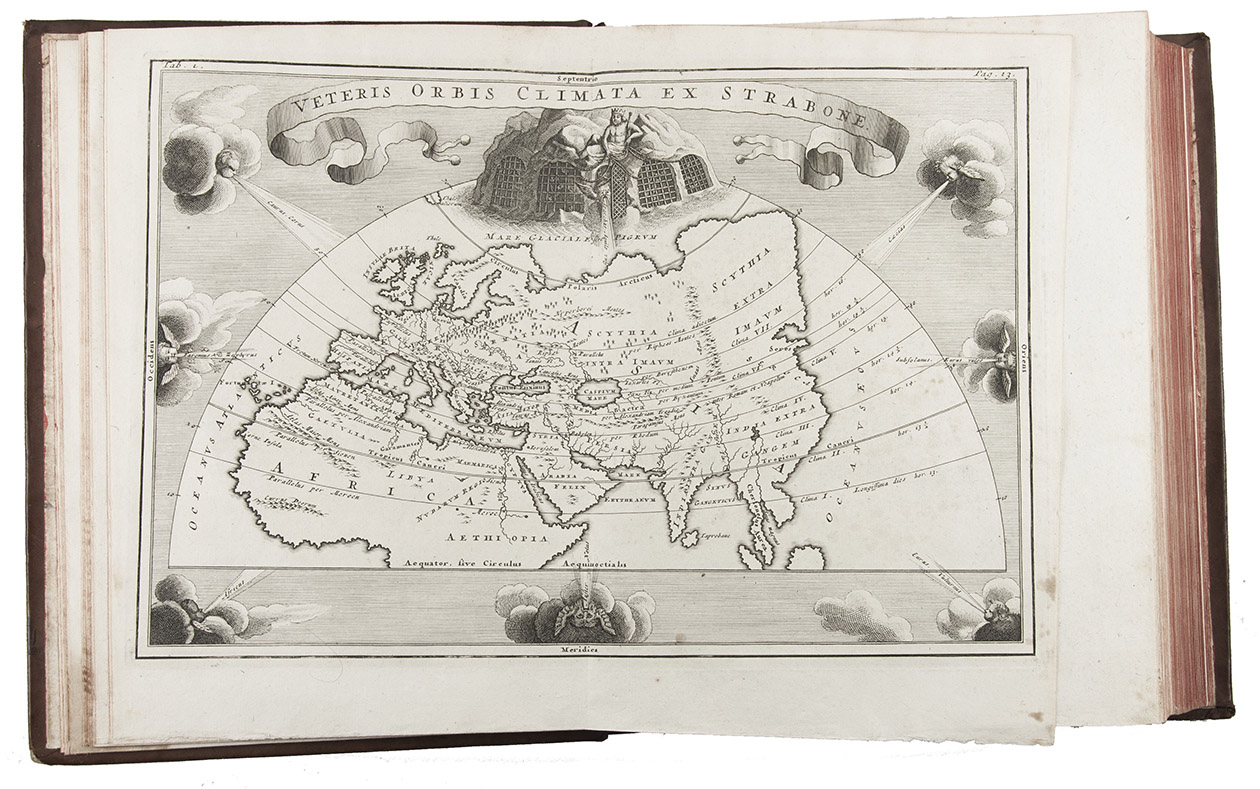 (Volume 1:) Cambridge, John Owen, 1703; (volume 2:) Amsterdam, Caspar Fritsch, 1706. 2 volumes. 4to. With engraved author's portrait, 33 engraved double-page maps and 1 engraved double-page plate. Contemporary calf, richly gold tooled spines and binding edges, double gilt fillets on sides. [16], 862, [38]; [12], 544; 166, [38] pp.