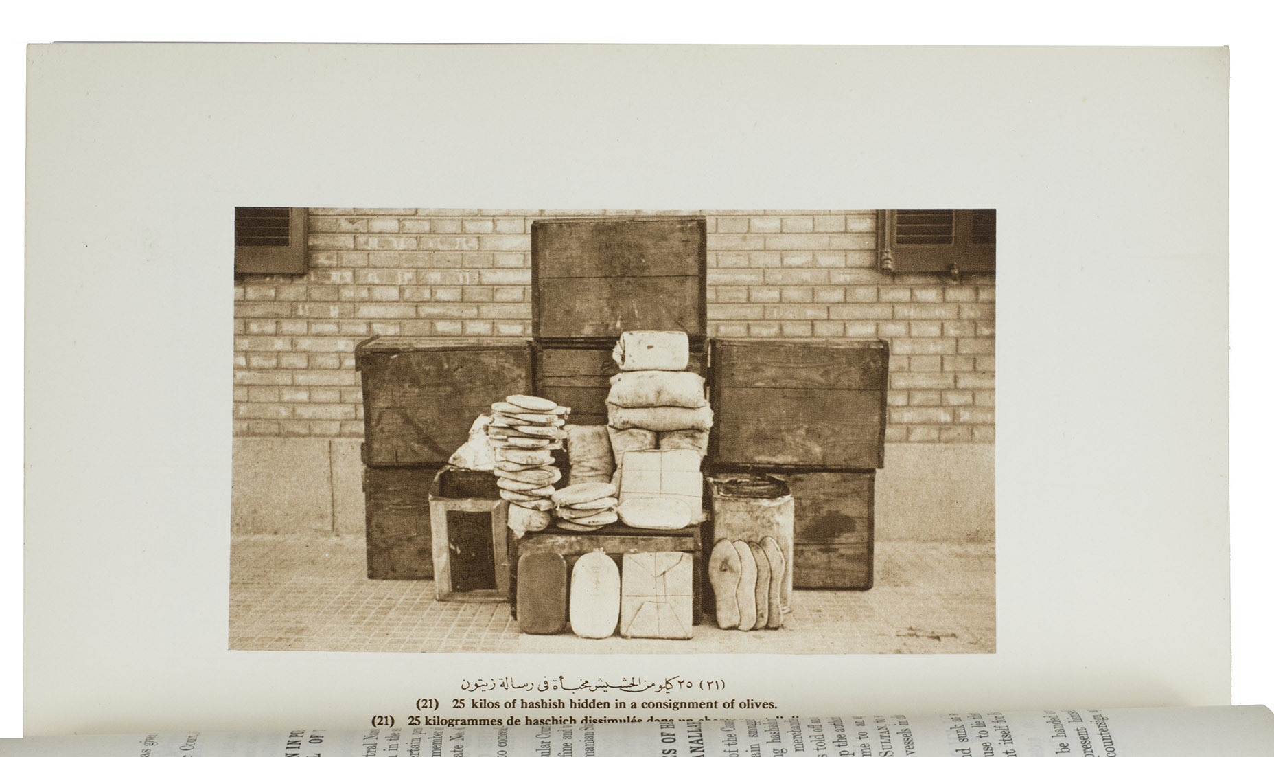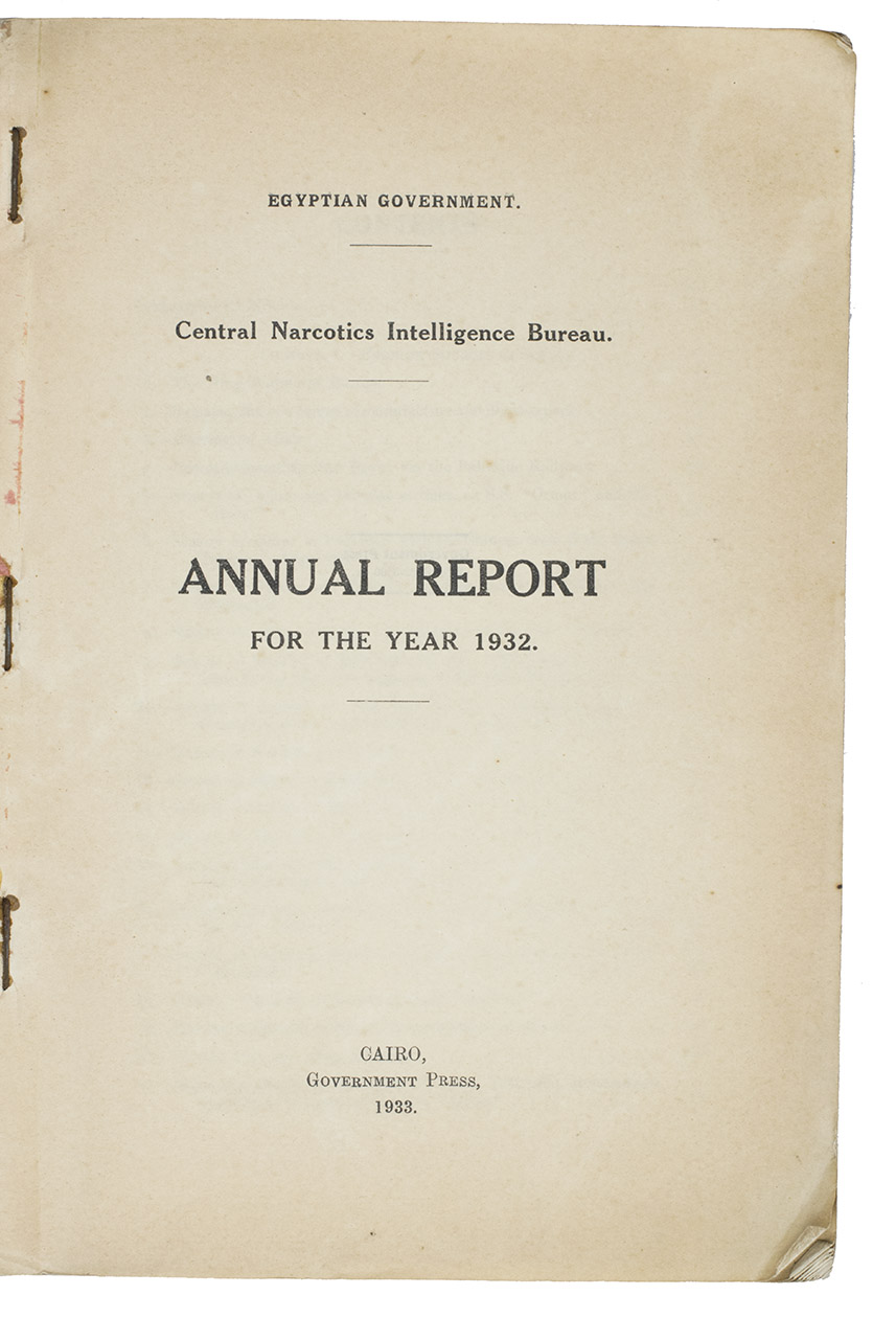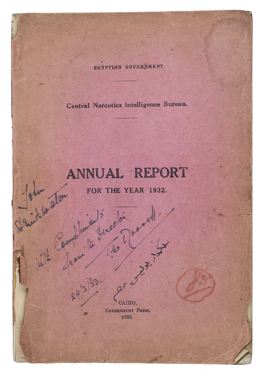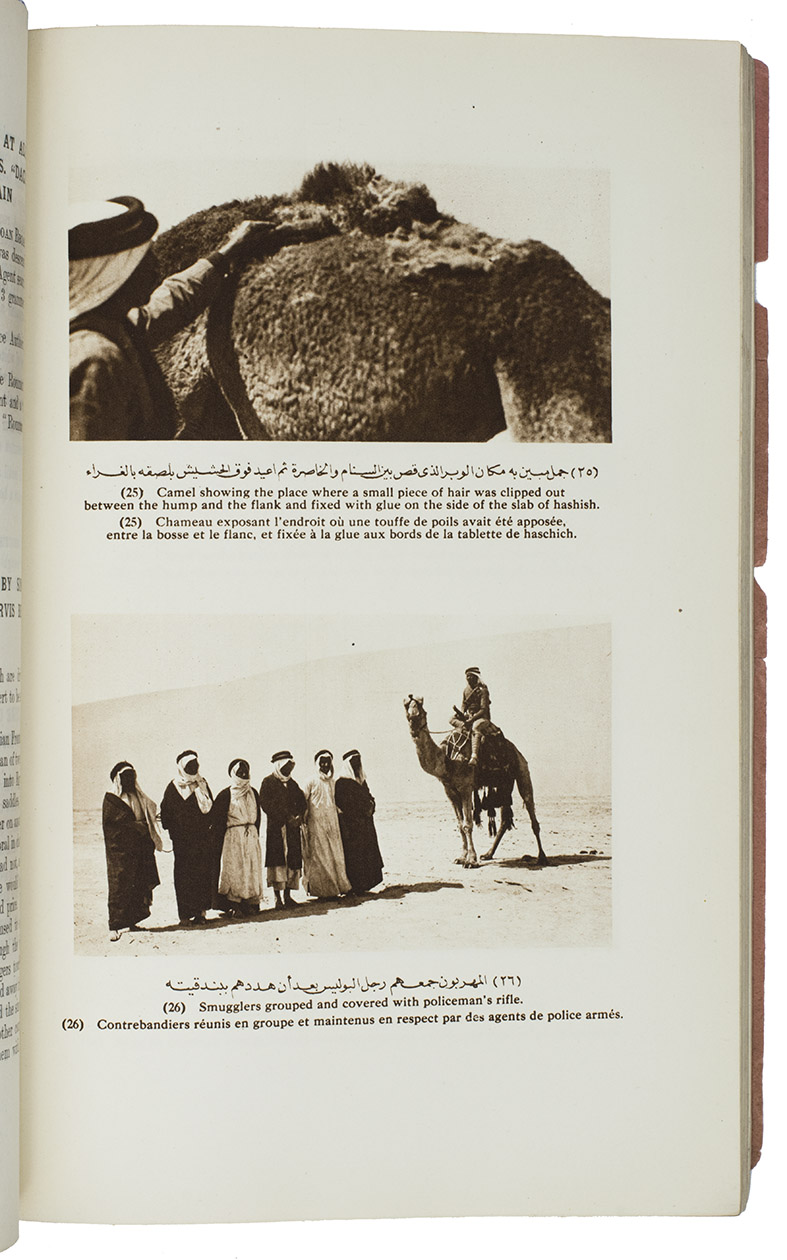 Rare work on drug trafficking in Egypt in the 1930s and an important example of the authors "war on drugs": he was director of the Central Narcotics Intelligence Bureau. Thomas Wentworth Russell (1879-1954), sometimes better known as Russell Pasha, was a police officer in service of Egypt who was appalled by the increasing drug trafficking in Egypt and the large number of drug addicts in the country. He founded the Central Narcotics Intelligence Bureau (CNIB), making it his mission to rid Egypt of drugs, especially what he called "white drugs" (cocaine, morphine, heroin), but also of "black drugs" (hashish, opium). Russell was one of the most important anti-drug campaigners in Egypt in his time and after, greatly raising awareness of the rising problem. Here he describes how drugs are smuggled in large quantities from abroad to Egypt. In many chapters, he extensively describes the foreign sources of supply (discussing not only important drug barons, but also mentioning specific ships and other means of transport used to smuggle drugs), notes cases where weapons were used by traffickers, discusses people involved in the trade, traffickers and their methods of smuggling (in shoes, camel saddles, etc.), addiction and its social effects and death rates, and much more. Although 3000 copies were printed (the printers code for the job is printed on the back of the title-page: "10506-1932-3000 ex.") it is a scarce and outstanding example of Russell's anti-drug campaign, extensively describing drug trafficking in Egypt in the 1930s, being well-illustrated with photographs of drug barons, users, traffickers and methods of concealment. We have located only four other copies, but due to ambiguity between the year covered (1932) and the year of publication (1933), three further locations are uncertain.