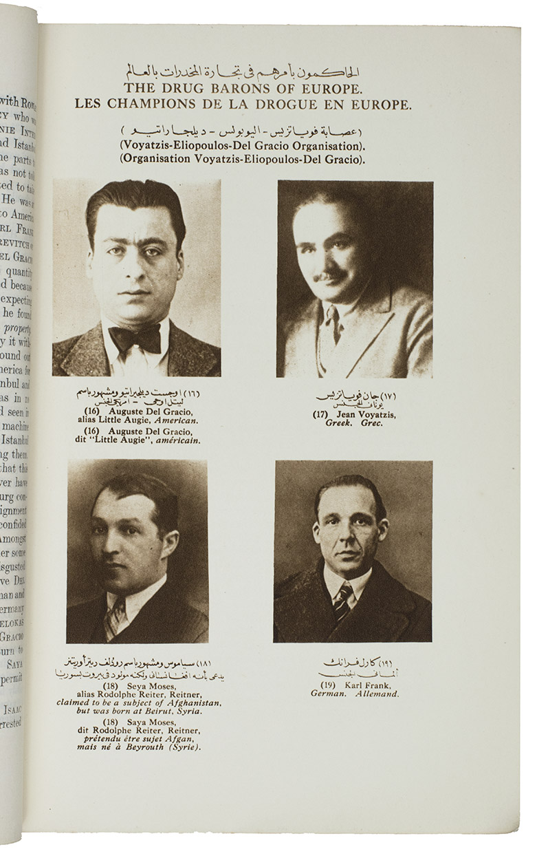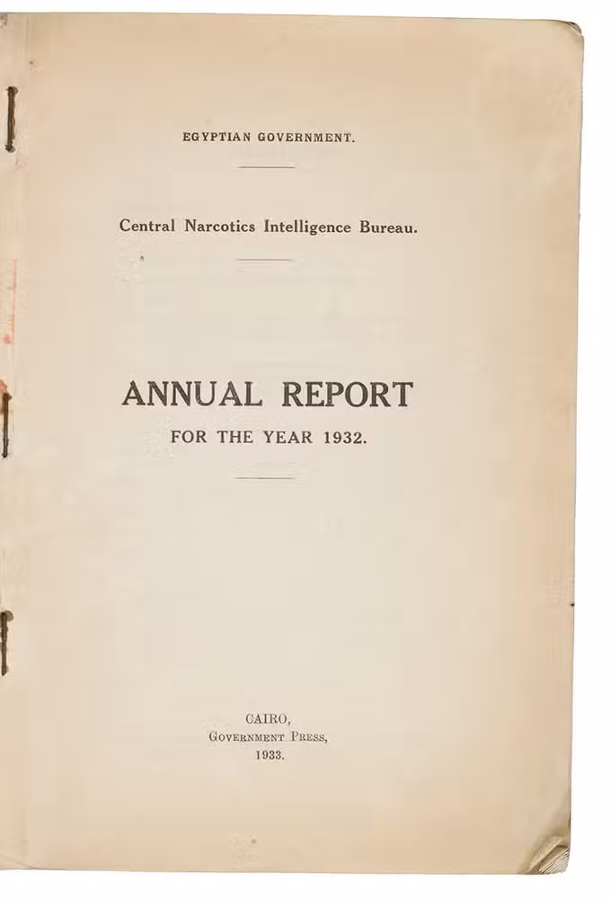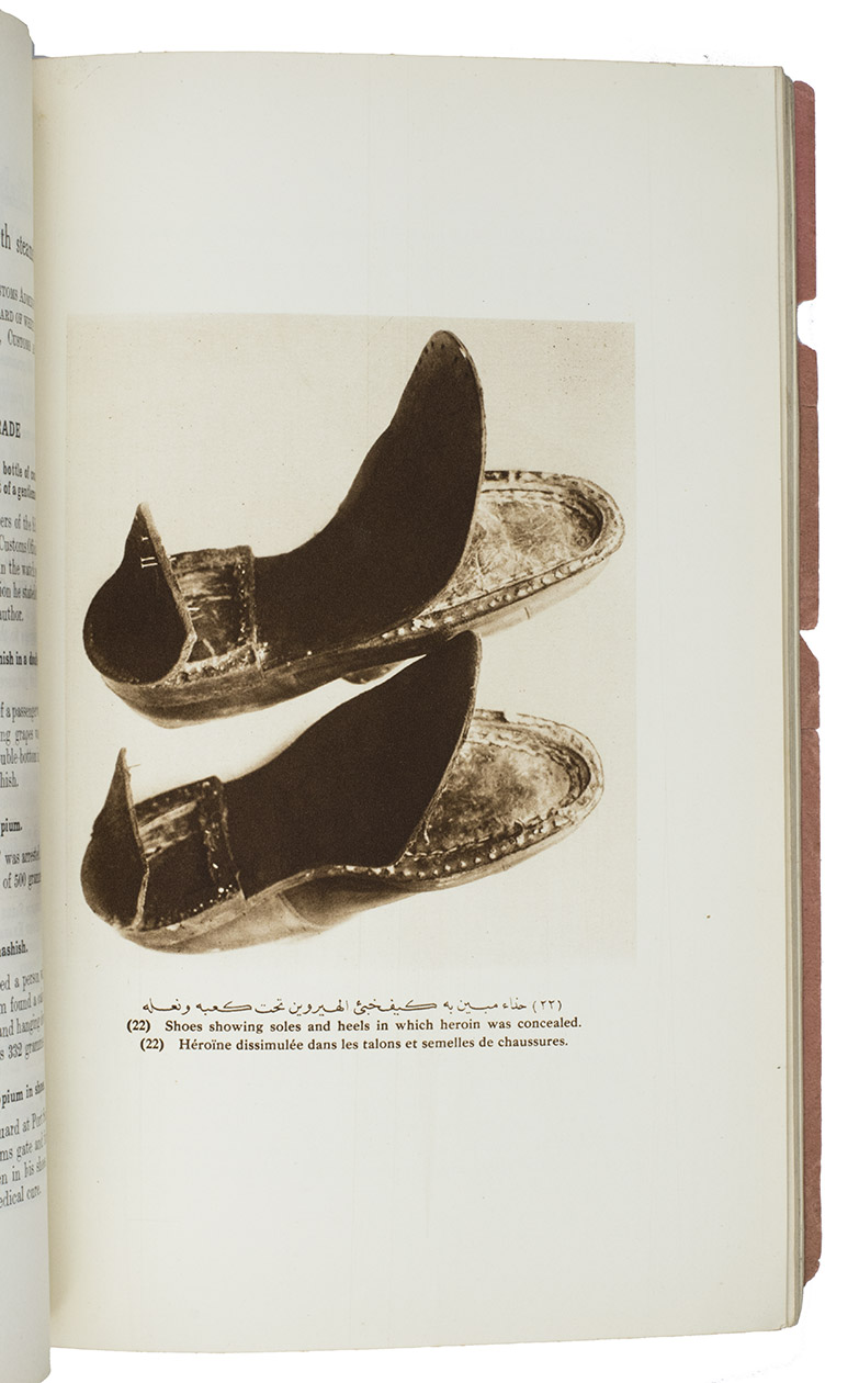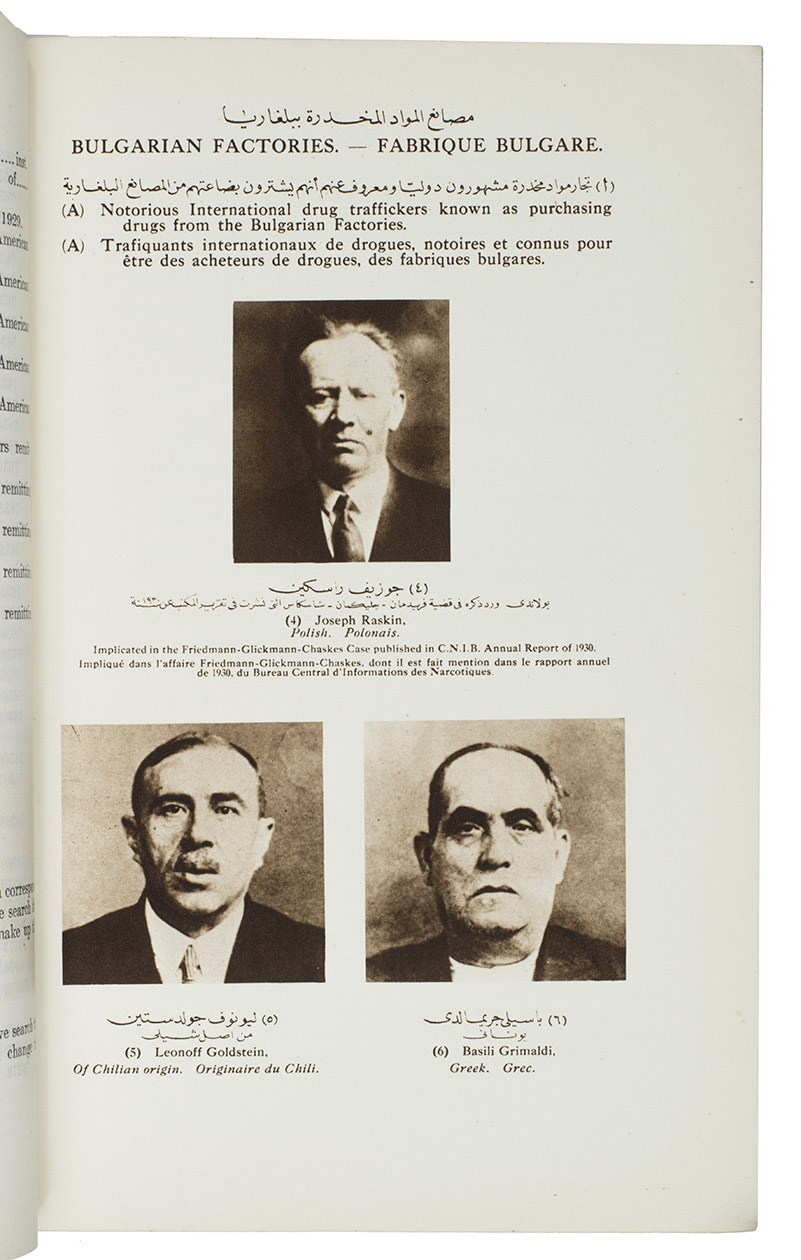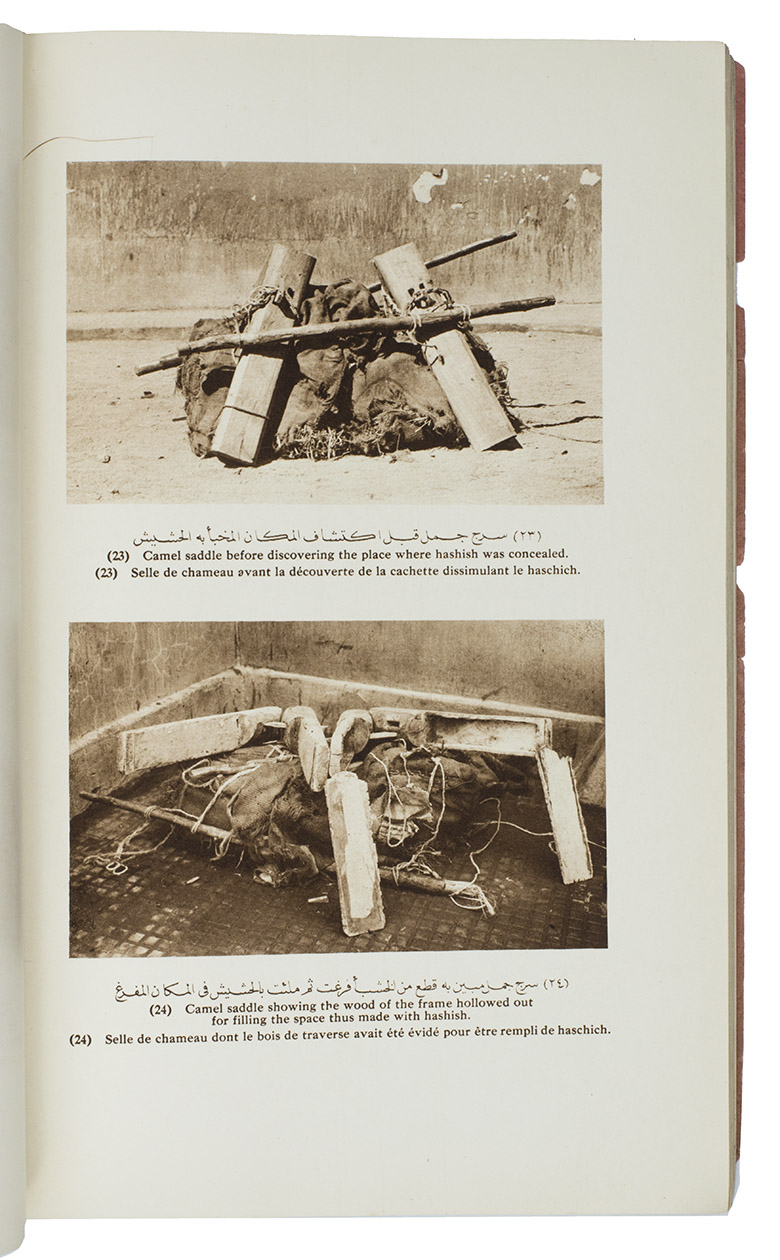 Rare work on drug trafficking in Egypt in the 1930s and an important example of the authors "war on drugs": he was director of the Central Narcotics Intelligence Bureau. Thomas Wentworth Russell (1879-1954), sometimes better known as Russell Pasha, was a police officer in service of Egypt who was appalled by the increasing drug trafficking in Egypt and the large number of drug addicts in the country. He founded the Central Narcotics Intelligence Bureau (CNIB), making it his mission to rid Egypt of drugs, especially what he called "white drugs" (cocaine, morphine, heroin), but also of "black drugs" (hashish, opium). Russell was one of the most important anti-drug campaigners in Egypt in his time and after, greatly raising awareness of the rising problem. Here he describes how drugs are smuggled in large quantities from abroad to Egypt. In many chapters, he extensively describes the foreign sources of supply (discussing not only important drug barons, but also mentioning specific ships and other means of transport used to smuggle drugs), notes cases where weapons were used by traffickers, discusses people involved in the trade, traffickers and their methods of smuggling (in shoes, camel saddles, etc.), addiction and its social effects and death rates, and much more. Although 3000 copies were printed (the printers code for the job is printed on the back of the title-page: "10506-1932-3000 ex.") it is a scarce and outstanding example of Russell's anti-drug campaign, extensively describing drug trafficking in Egypt in the 1930s, being well-illustrated with photographs of drug barons, users, traffickers and methods of concealment. We have located only four other copies, but due to ambiguity between the year covered (1932) and the year of publication (1933), three further locations are uncertain.