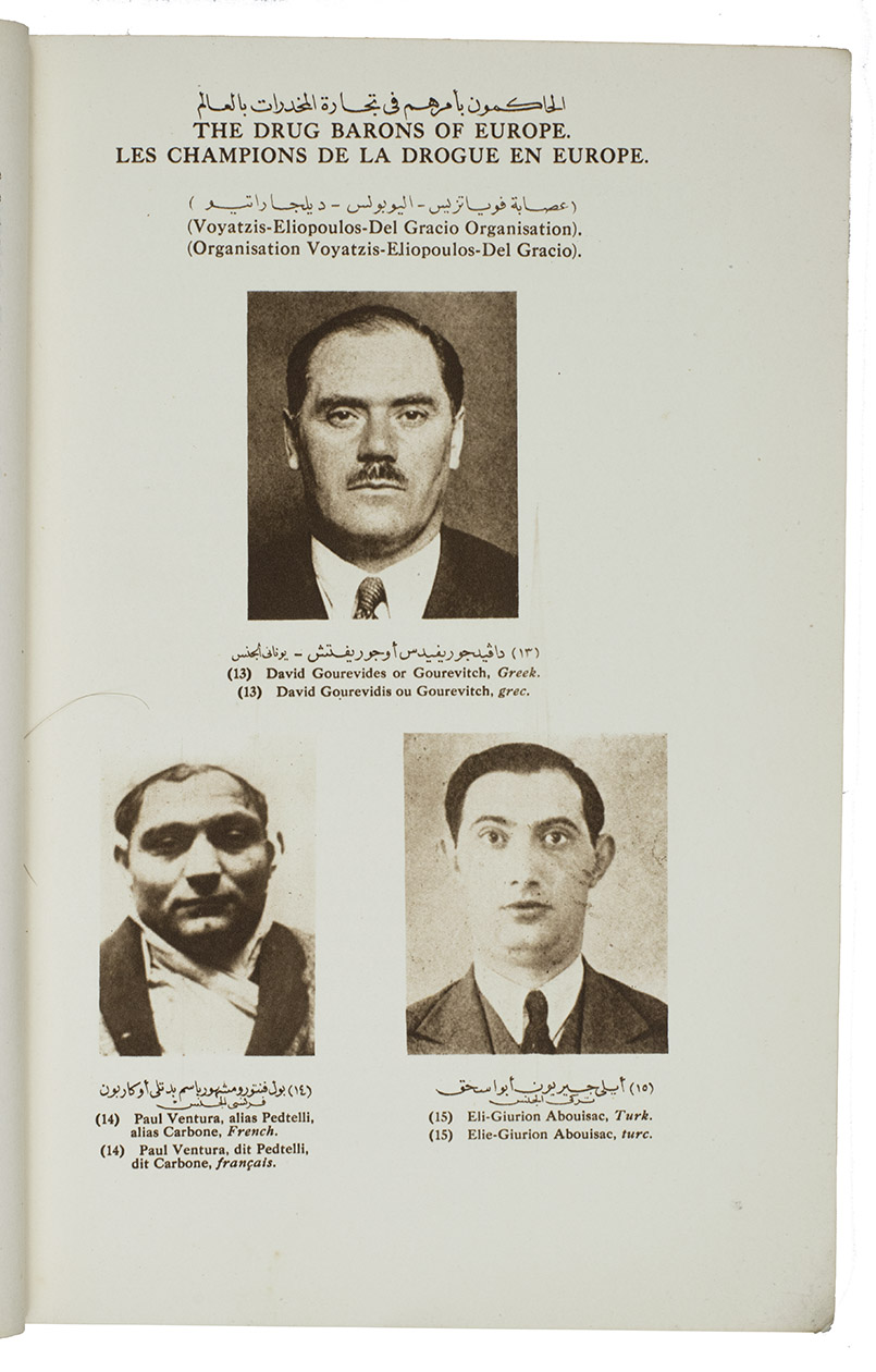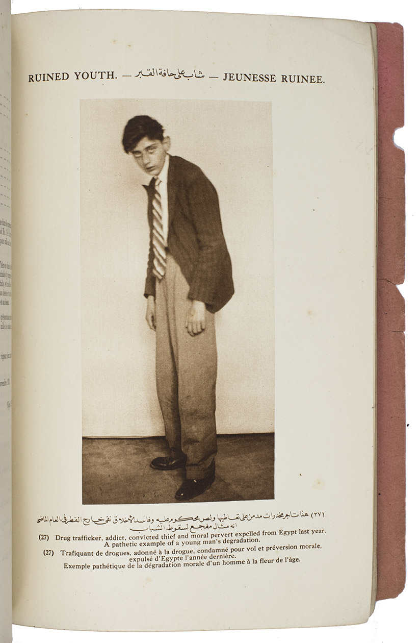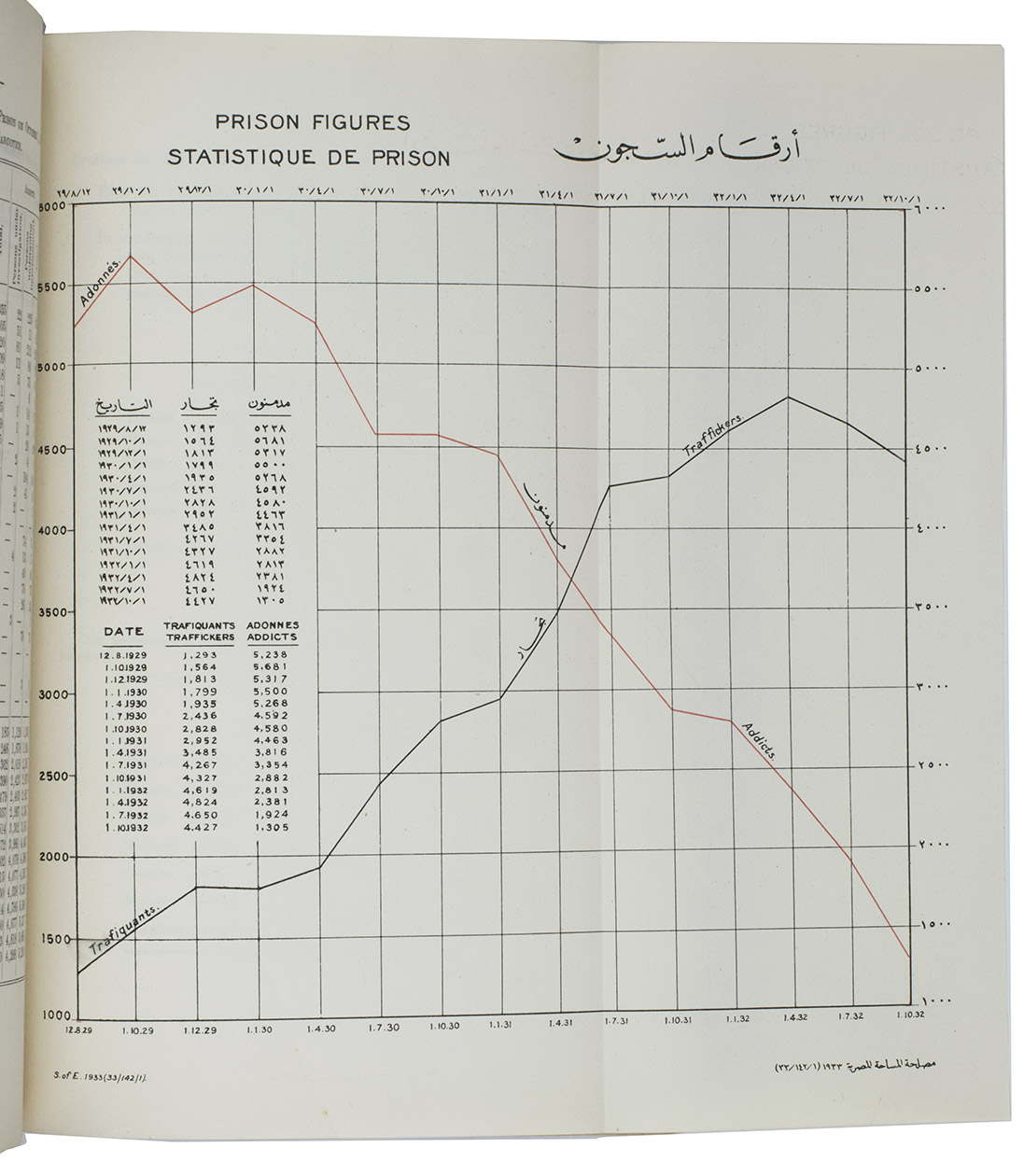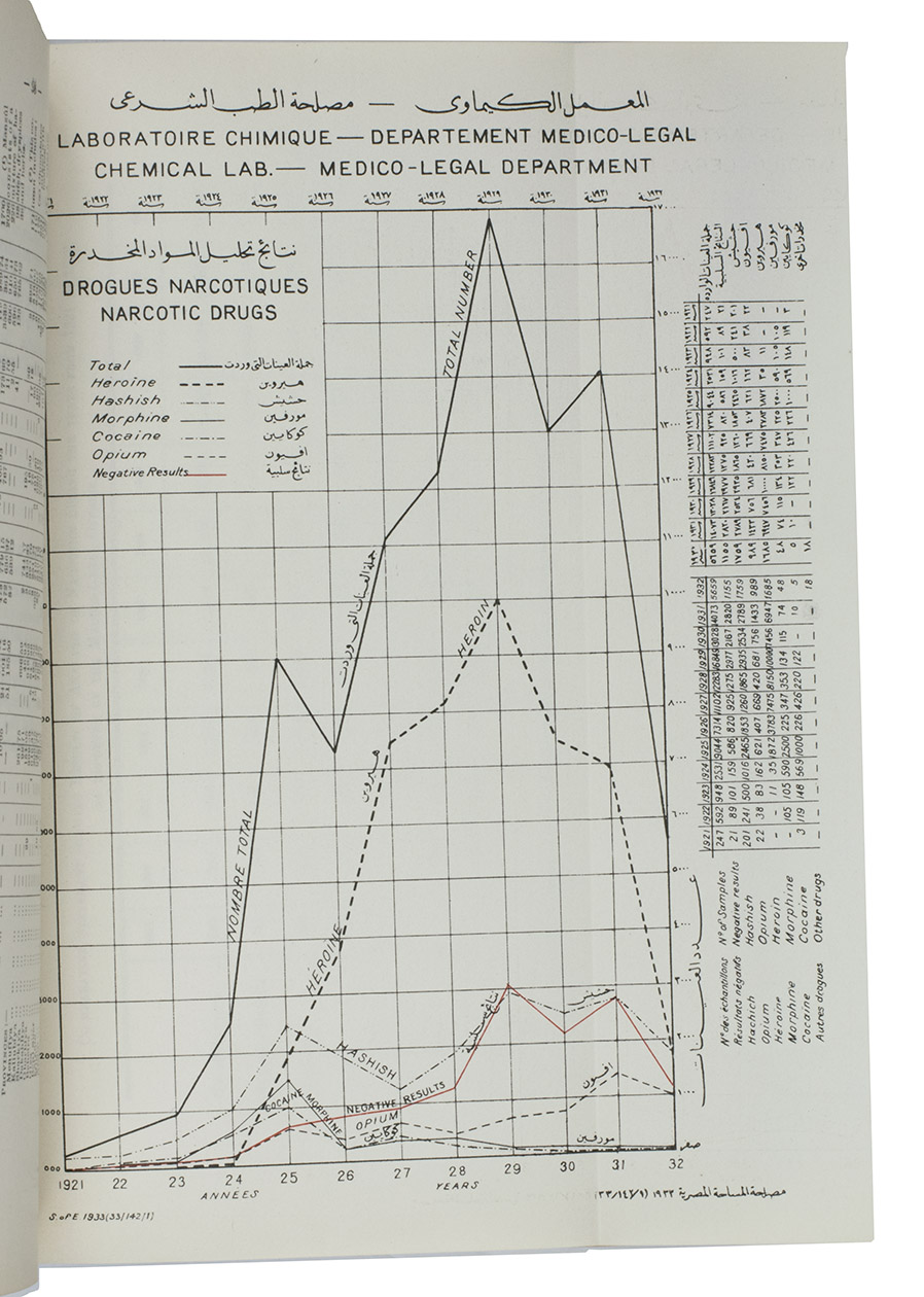 Rare work on drug trafficking in Egypt in the 1930s and an important example of the authors "war on drugs": he was director of the Central Narcotics Intelligence Bureau. Thomas Wentworth Russell (1879-1954), sometimes better known as Russell Pasha, was a police officer in service of Egypt who was appalled by the increasing drug trafficking in Egypt and the large number of drug addicts in the country. He founded the Central Narcotics Intelligence Bureau (CNIB), making it his mission to rid Egypt of drugs, especially what he called "white drugs" (cocaine, morphine, heroin), but also of "black drugs" (hashish, opium). Russell was one of the most important anti-drug campaigners in Egypt in his time and after, greatly raising awareness of the rising problem. Here he describes how drugs are smuggled in large quantities from abroad to Egypt. In many chapters, he extensively describes the foreign sources of supply (discussing not only important drug barons, but also mentioning specific ships and other means of transport used to smuggle drugs), notes cases where weapons were used by traffickers, discusses people involved in the trade, traffickers and their methods of smuggling (in shoes, camel saddles, etc.), addiction and its social effects and death rates, and much more. Although 3000 copies were printed (the printers code for the job is printed on the back of the title-page: "10506-1932-3000 ex.") it is a scarce and outstanding example of Russell's anti-drug campaign, extensively describing drug trafficking in Egypt in the 1930s, being well-illustrated with photographs of drug barons, users, traffickers and methods of concealment. We have located only four other copies, but due to ambiguity between the year covered (1932) and the year of publication (1933), three further locations are uncertain.