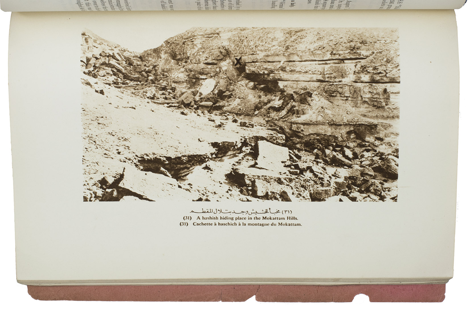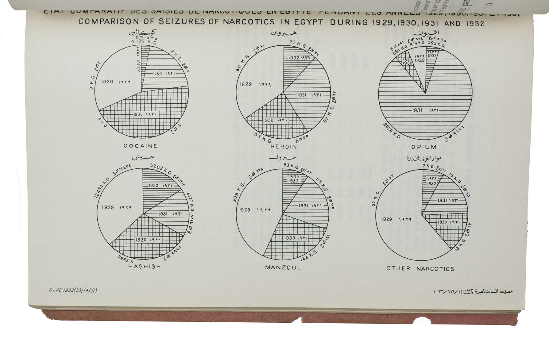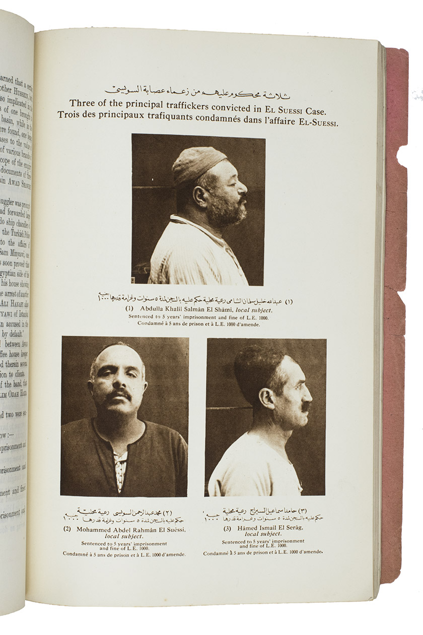 Cairo, Government Press, 1933. Imperial 8vo (27 x 18.5 cm). With 14 rotogravure(?) plates, printed in sepia, 1 folding facsimile letter, 2 folding graphs, a plate with 6 pie charts and 1 illustration (also in red) showing schematically a smuggling box. Original publisher's pink paper wrappers, printed letterpress. XVII, [1 blank], 170 pp. (pp. VI and XVIII blank)