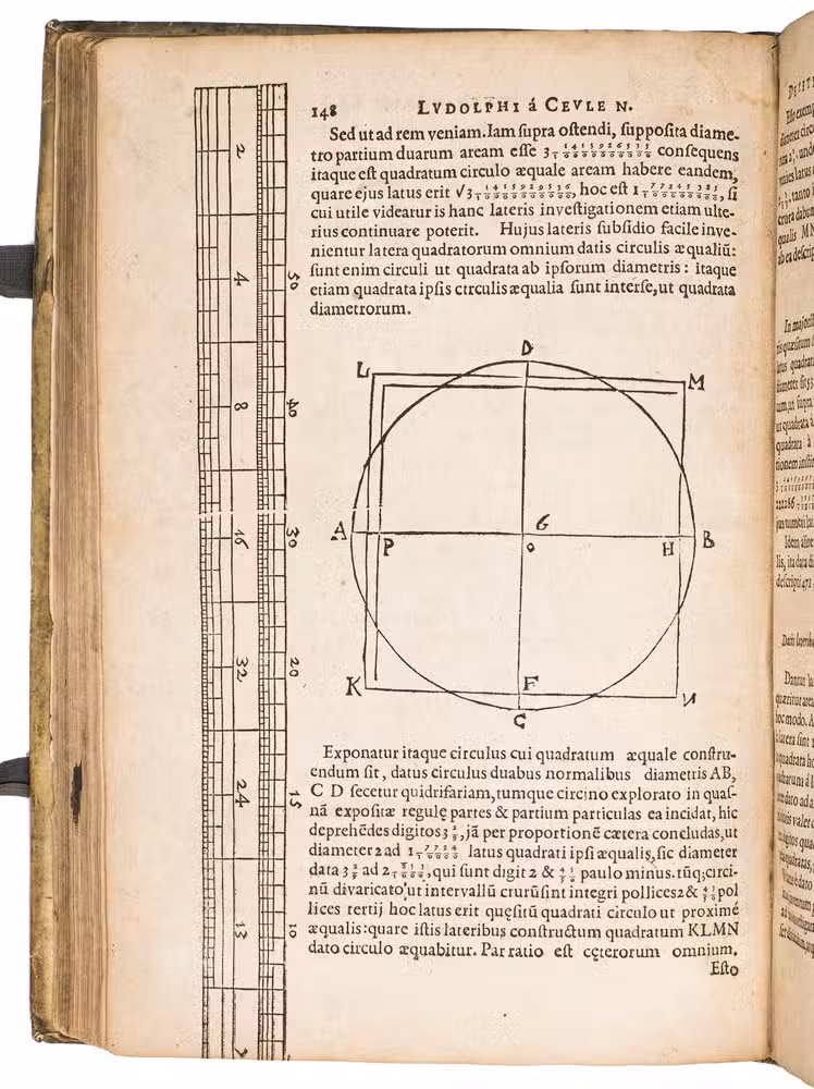 First Latin edition of two important mathematical treatises by Ludolf van Ceulen (1539-1610) both translated by Van Ceulen's pupil, Willebrord Snell (1580-1626). There are at least three and perhaps more issues of the present edition. Apparently with all leaves ever present in this issue, whereas most copies lack one or more. The present Van Colster issue is clearly intended for the Dutch Republic and its supporters while the Van der Marsce issue is clearly aimed at the Spanish-controlled Southern Low Countries and its supporters. The Marcus issue is more neutral.