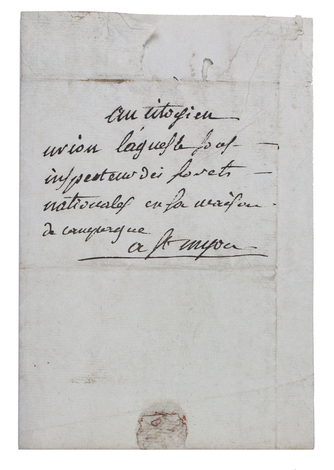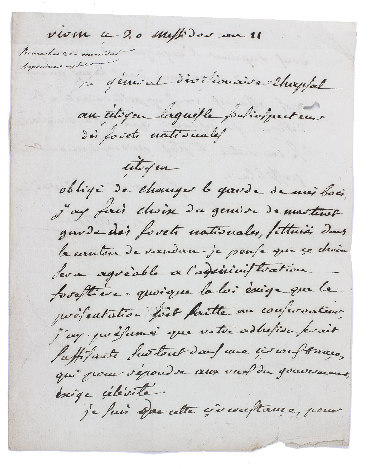Autograph letter by the French lieutenant Jean-Antoine Chapsal (1753-1834), addressed to Urion Laguesse, "sous-inspecteur des forets nationales", concerning the appointment of a forester to oversee his woods. He tells Laguesse that, since a forest ranger is required by law, he can appoint someone he thinks appropriate without consulting Chapsal.