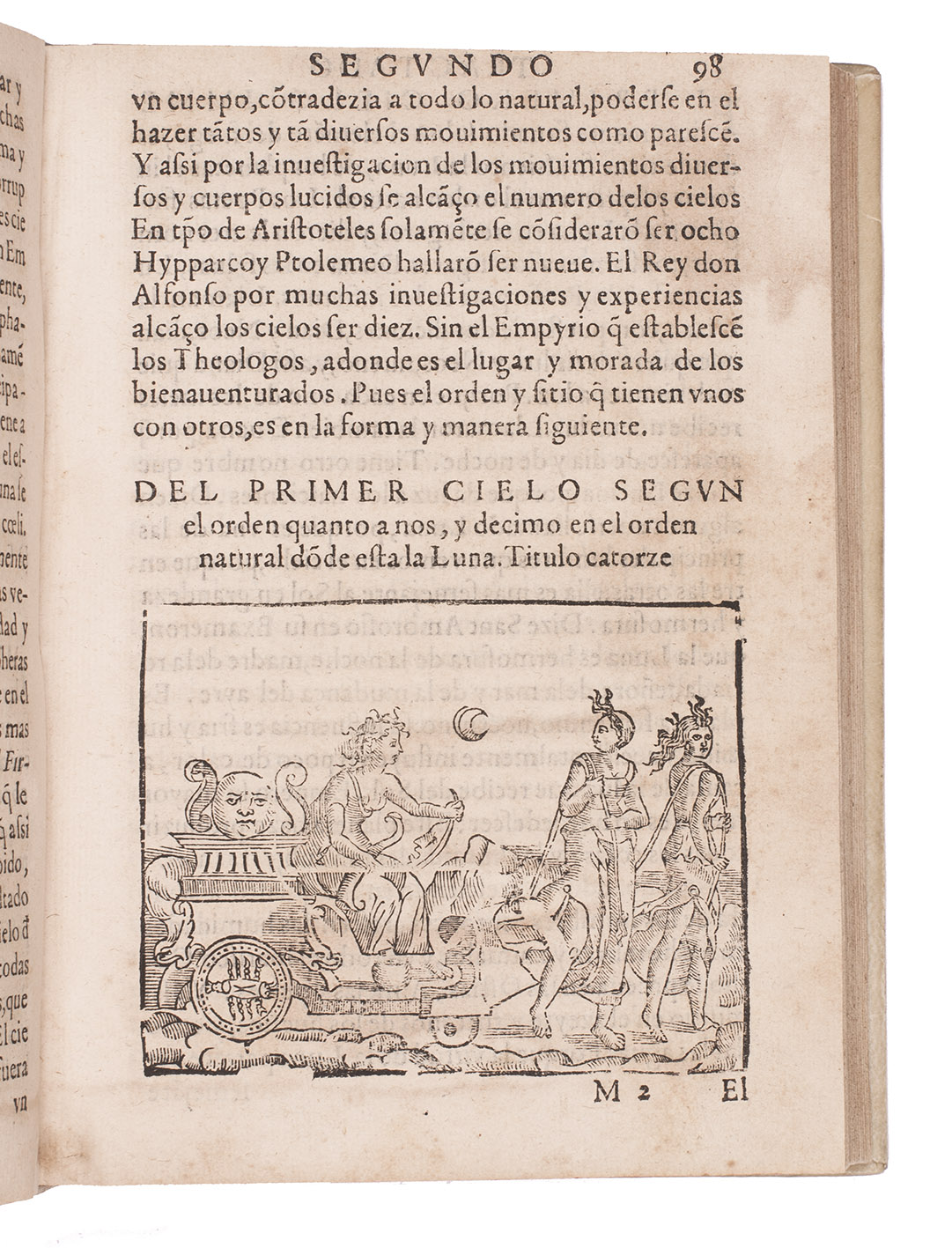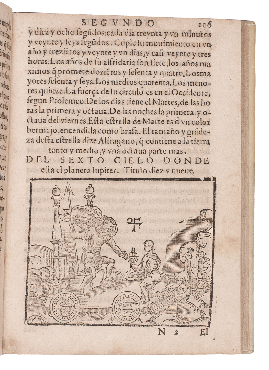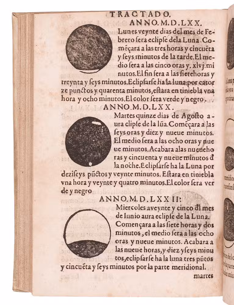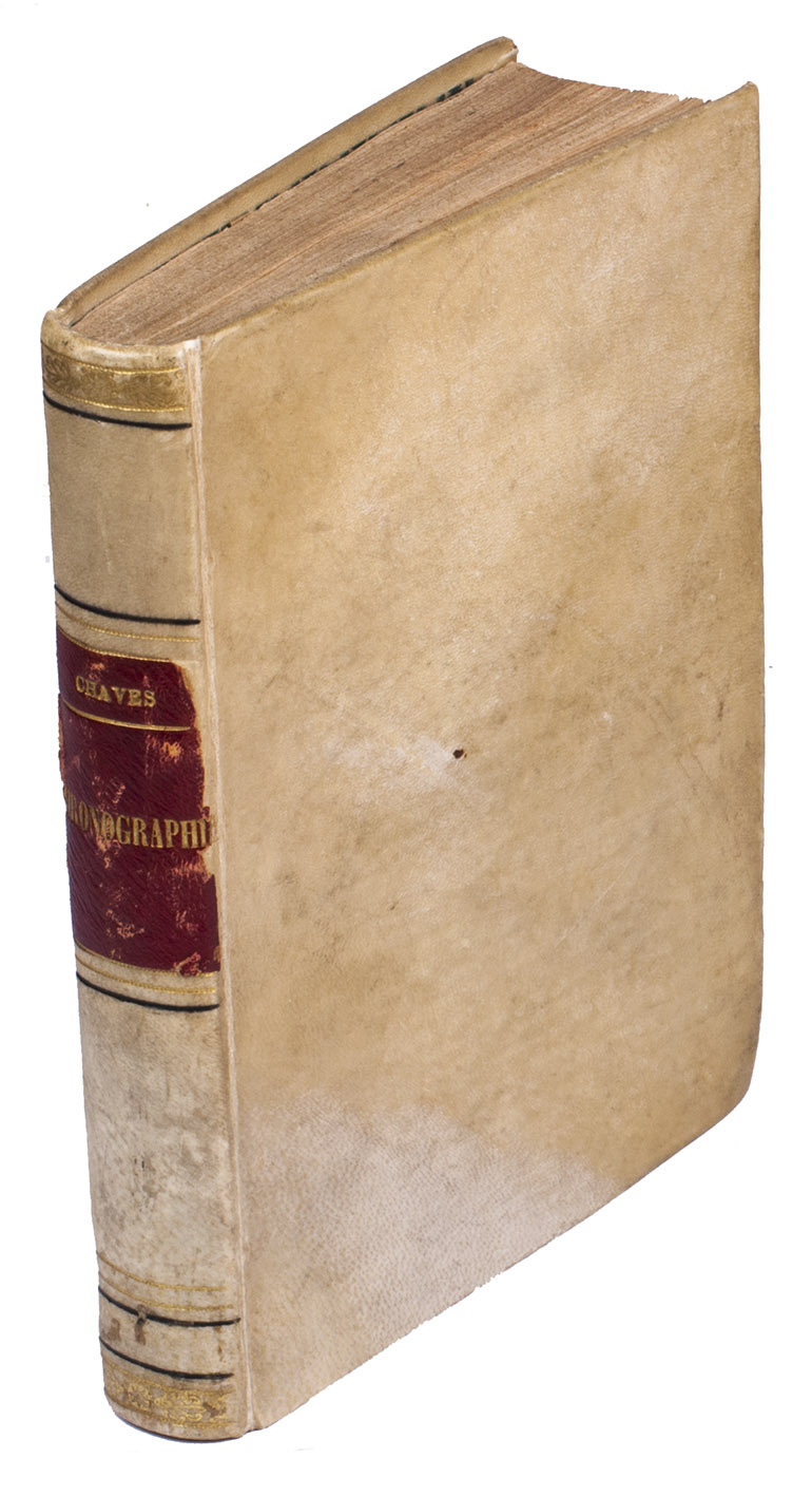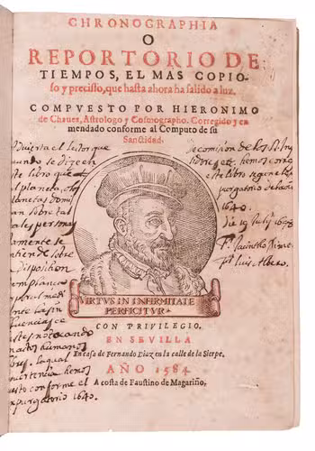 Sevilla, Fernando Diaz, Faustino de Magarino (colophon: printed by Fernando Diaz), 1584. 4to. With title printed in red and black with woodcut portrait of the author, Diaz's woodcut printer's device below the colophon on the last page, 2 full- or nearly full-page woodcuts, 19 half-page woodcuts, 7 half-page round woodcuts, and 43 small round woodcuts of phases of the moon. Many letterpress tables of the positions of the sun and moon, calendars, movable feasts, etc. Sheepskin parchment by Domingo V. Folch of the national bindery in Valencia (2nd half of 19th century), gold-tooled spine. 192, 201-"163" [= 263] ll.