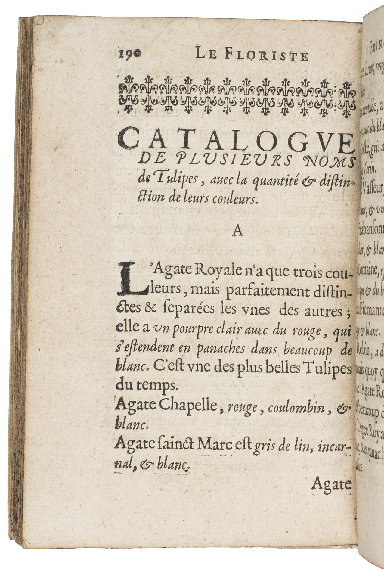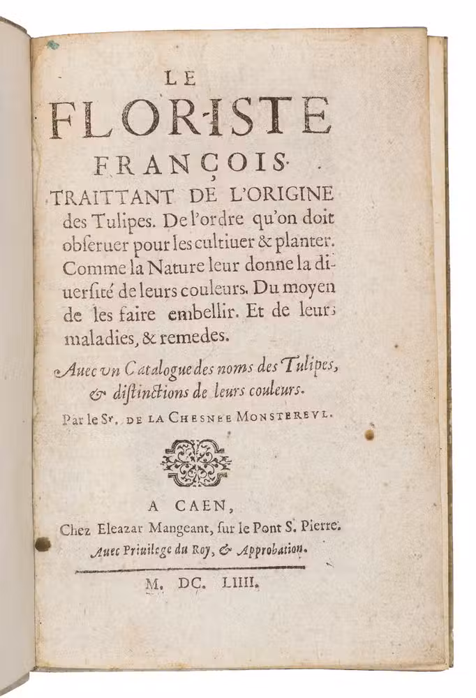 Very rare first edition of the first French treatise on the cultivation of tulips, written by a gentleman-gardener. It one of the earliest treatises on tulips published after the well-known bubble-burst in Holland in 1637. Although interest in cultivating exotic and distinguished gardens increased during the 17th-century, the tulip remained an elite commodity, and took on new meanings as a symbol of personal distinction and connoisseurship. The catalogue included at the end of the present work lists 438 variants of tulips, including the "Monstereulle" and the "Panacée de Caen", with descriptions of their colouration.