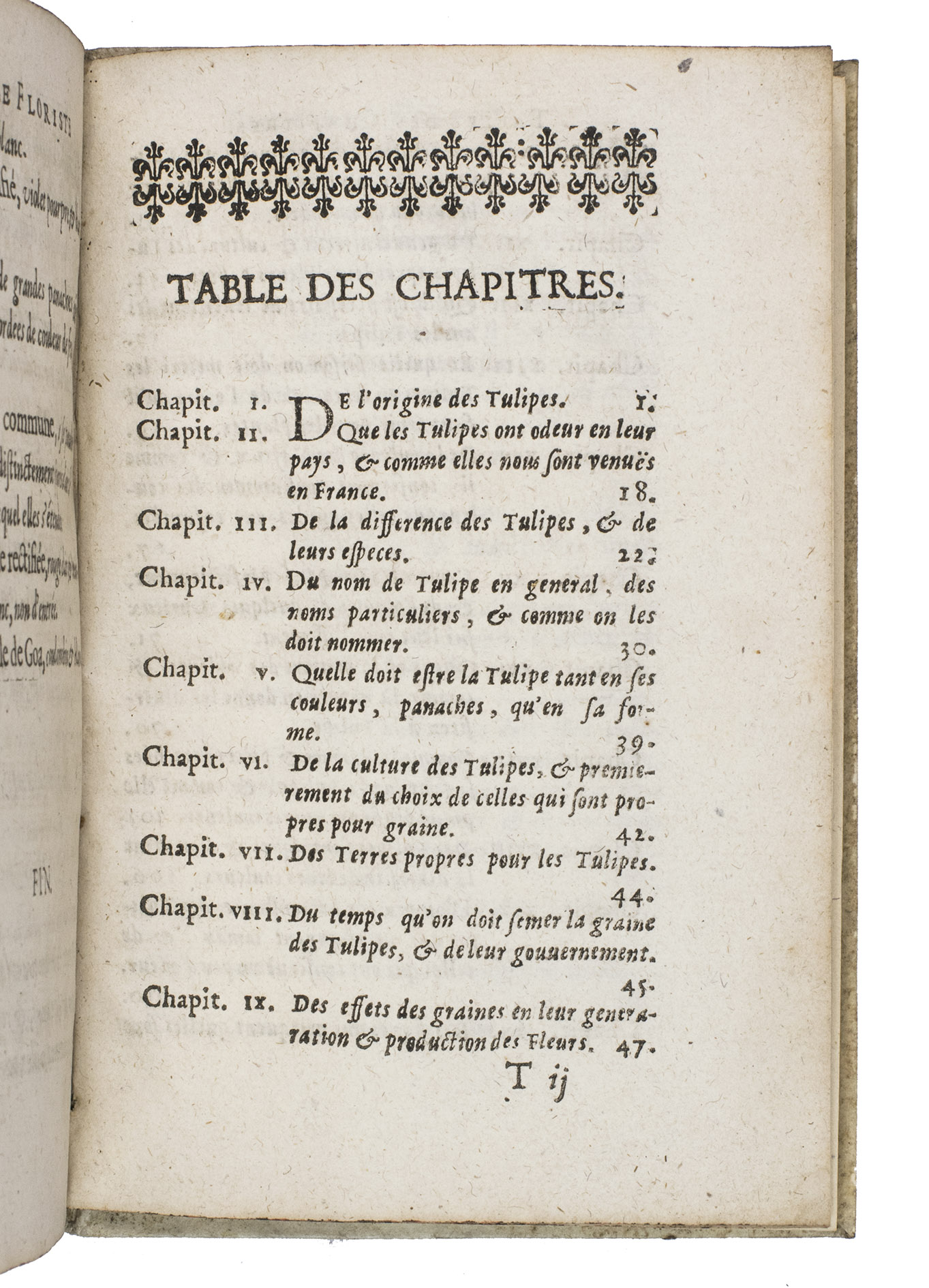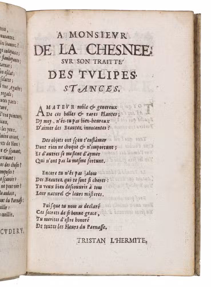 The text contains a history of the tulip, how to cultivate the flower, a catalogue of tulip names, and, most importantly, the first serious consideration of the nature and causes of "tulip breaking", a phenomenon in which multi-coloured streaks appear in the petals of the tulip. This variation, which was caused by a virus, was incredibly rare and highly sought after. In the 17th-century the cause of this variation was unknown, but the author, gardener Charles de la Chesnée Monstreul (1623-ca.1700) claimed to have discovered the secret, which he encoded in a poem in the present work.