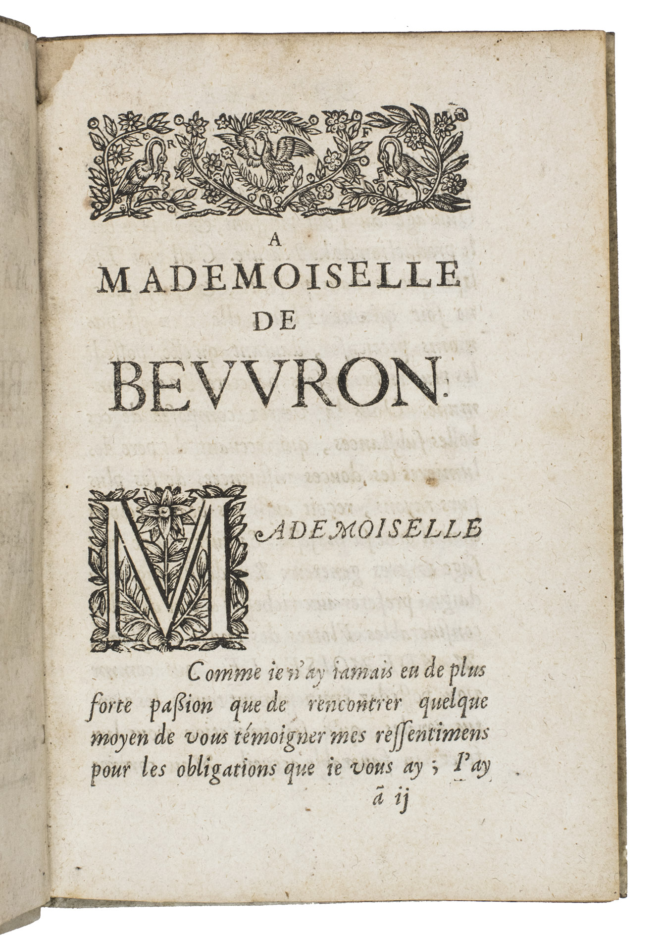 Caen, Eleazar Mangeant, 1654. 8vo. With a woodcut vignette on the title page, 2 decorated woodcut initials, and numerous head- and tailpieces, both woodcut and made up of typographical ornaments. Contemporary vellum, with the title printed in red on the spine, red and blue sprinkled edges. [44], 250, [4], [2 blank] pp.
