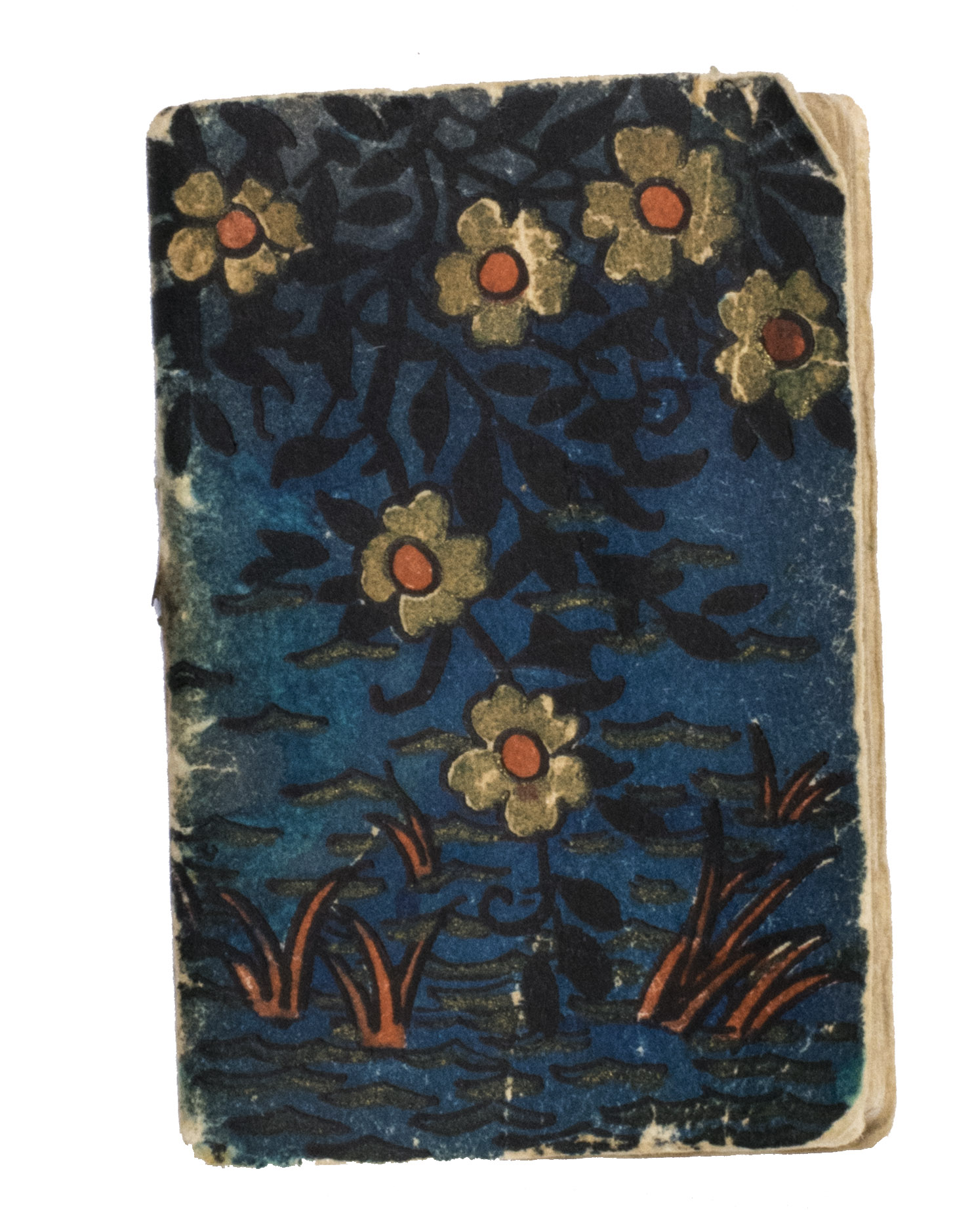 Paris, (colophon:) Duffit, 1922 Ca. 5.8 x 4 cm. The calendar has been printed in red and black. Contemporary wrappers stapled to the bookblock, with a blue floral design on the front. [20] ll.