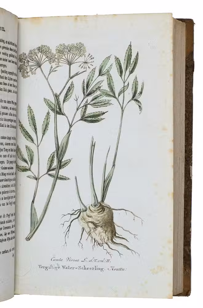 Amsterdam, Johannes Allart, 1800-1803. 4 volumes. Large 8vo. With 24 hand-coloured engraved plates of different plants, herbs, mushrooms, flowers, trees and animals. All volumes bound in contemporary half goatskin with marbled sides, gold-tooled spine with an orange and blue morocco label. XII, 560; [4], 584; [4], 568; [4], 598 pp.