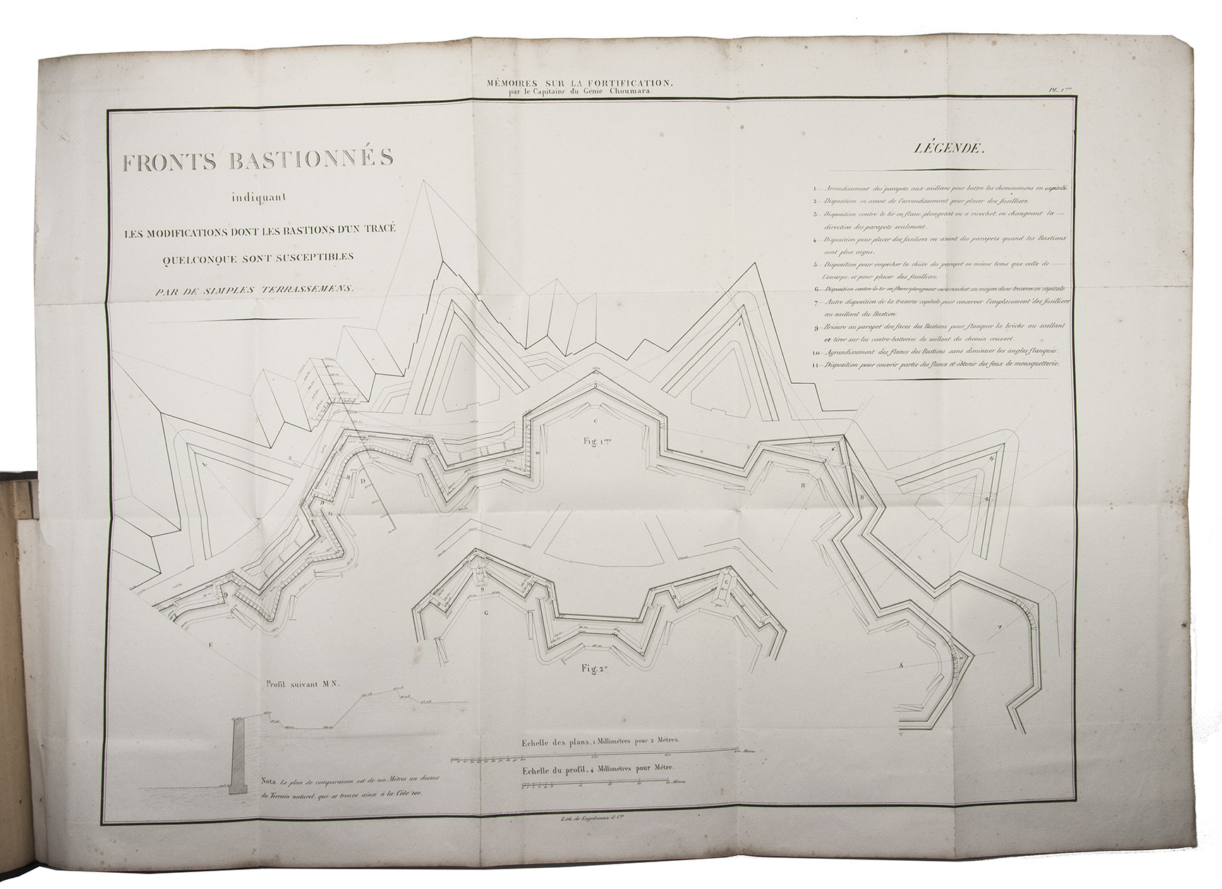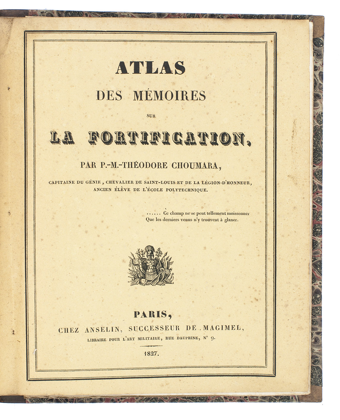 First edition of a work on fortification by the French military engineer Pierre-Marie Théodore Choumara (1787-1870). It examines the characteristics and shortcomings of various French forts, giving suggestions for improvement at low cost. "That which distinguishes Choumara from other writers on the science, is the objection he has to supersede everything by the introduction of a new system; his constant endeavour is to modify the fortresses already extant, in order to increase their power and resistance" (Lendy). Other chapters deal with the attack and defence of an hexagon-shaped fort, the number of soldiers needed to defend a fort and the type of armour required. The atlas volume contains three large folding lithographed plates, showing different types of bastions and an attack plan.