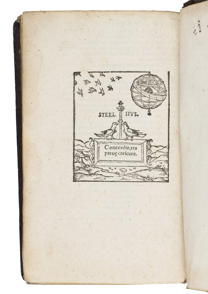2 works in 1 volume. 8vo. Ad 1: with two woodcut initials at the beginning of the introduction and the prologue, of 2 different series, and a large woodcut printer's device on the last page, showing a staff, surrounded by doves and the text 'steelsius', stuck in a plaquette that says 'concordia, res parue crescunt'. Ad 2: with a woodcut initial on the first leaf. Contemporary Flemish blind-tooled, panel-stamped calf, with a tripartite panel on both sides and remnants of ties. [8],"313" [=314], [1]; 47, [1] ll.