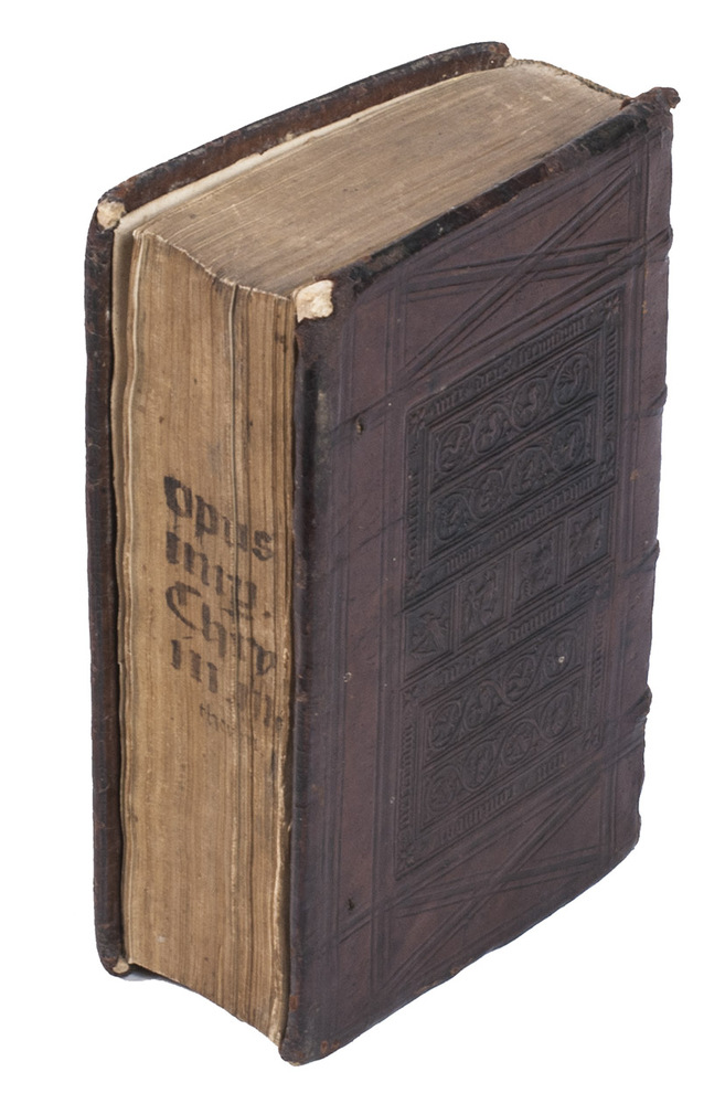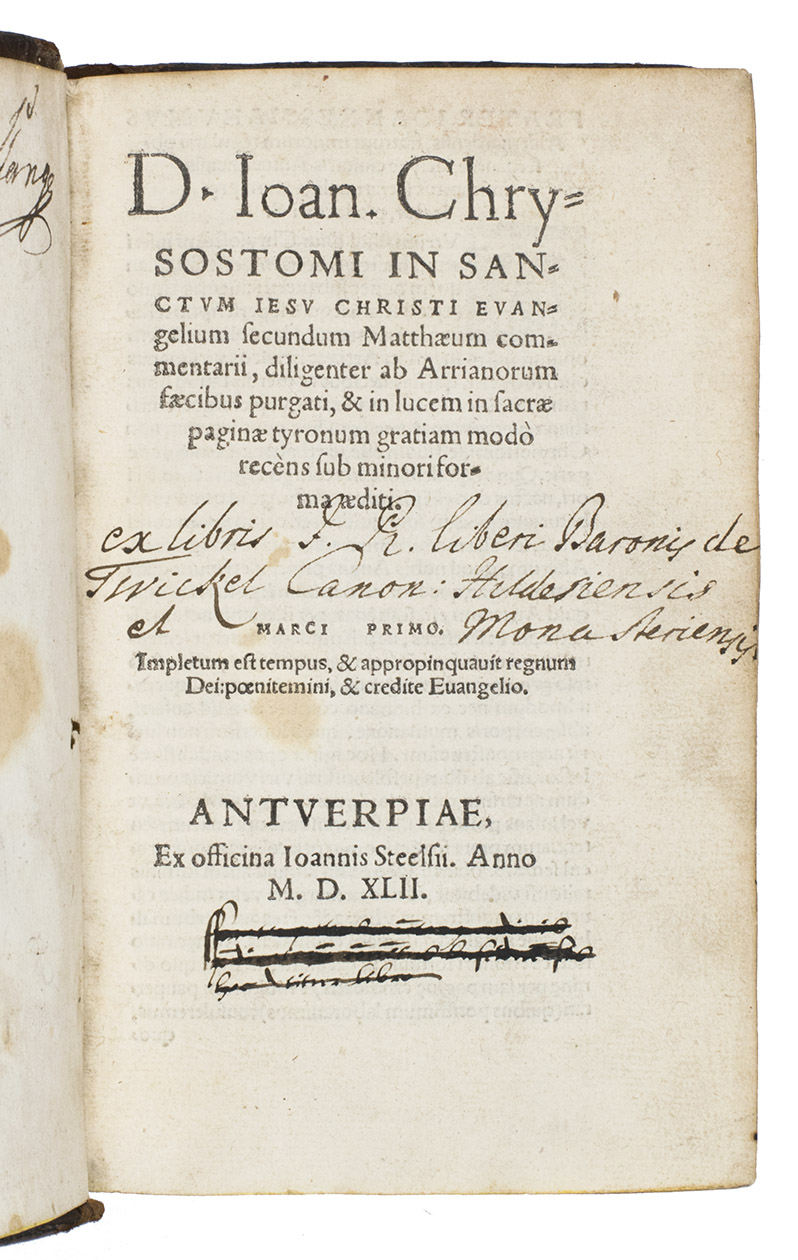 With a manuscript owner's inscription on the recto of first flyleaf, one on the verso of the first flyleaf and two on the title page (one crossed out). The blind-tooling on the boards is very clear. Some loss of leather, mainly at the head of the spine and the corners of the back board. The pastedowns are missing, showing the boards and the manuscript waste used to reinforce the spine. Small brown stains on the first flyleaf and title page, occasionally slightly browned. Otherwise in good condition. Ad 1: Adams C 1531; Belg. Typ. 1608; STCV 12916258 (3 copies); USTC 408234 (15 copies, only 8 with a known shelfmark); WorldCat 69054696, 312713362, 901134465, 67580012, 69058371 (13 copies); Ad 2: Adams C 1533; Belg. Typ. 6076; STCV 12923552 (1 copy); USTC 408266 (16 copies, only 8 with a known shelfmark); cf. for the author: Baur, Catholic Encyclopedia vol. 8, "St. John Chrysostom"; for the binding: Fogelmark, Flemish and related panel-stamped bindings, pp. 32-44; Goldschmidt, Gothic & Renaissance bookbindings, p. 216 plate 45.