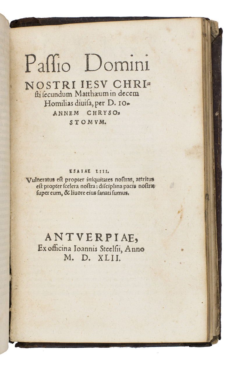 Rare second edition of a devotional work by Saint John Chrysostom (347-407 CE). The contents of this second edition are more extensive than those of the first edition, published 5 years earlier, which only contains the first two-thirds of the work. The last third was published separately as Passio Domini in 1542 and added to this copy. The present work very rarely appears on the market.
