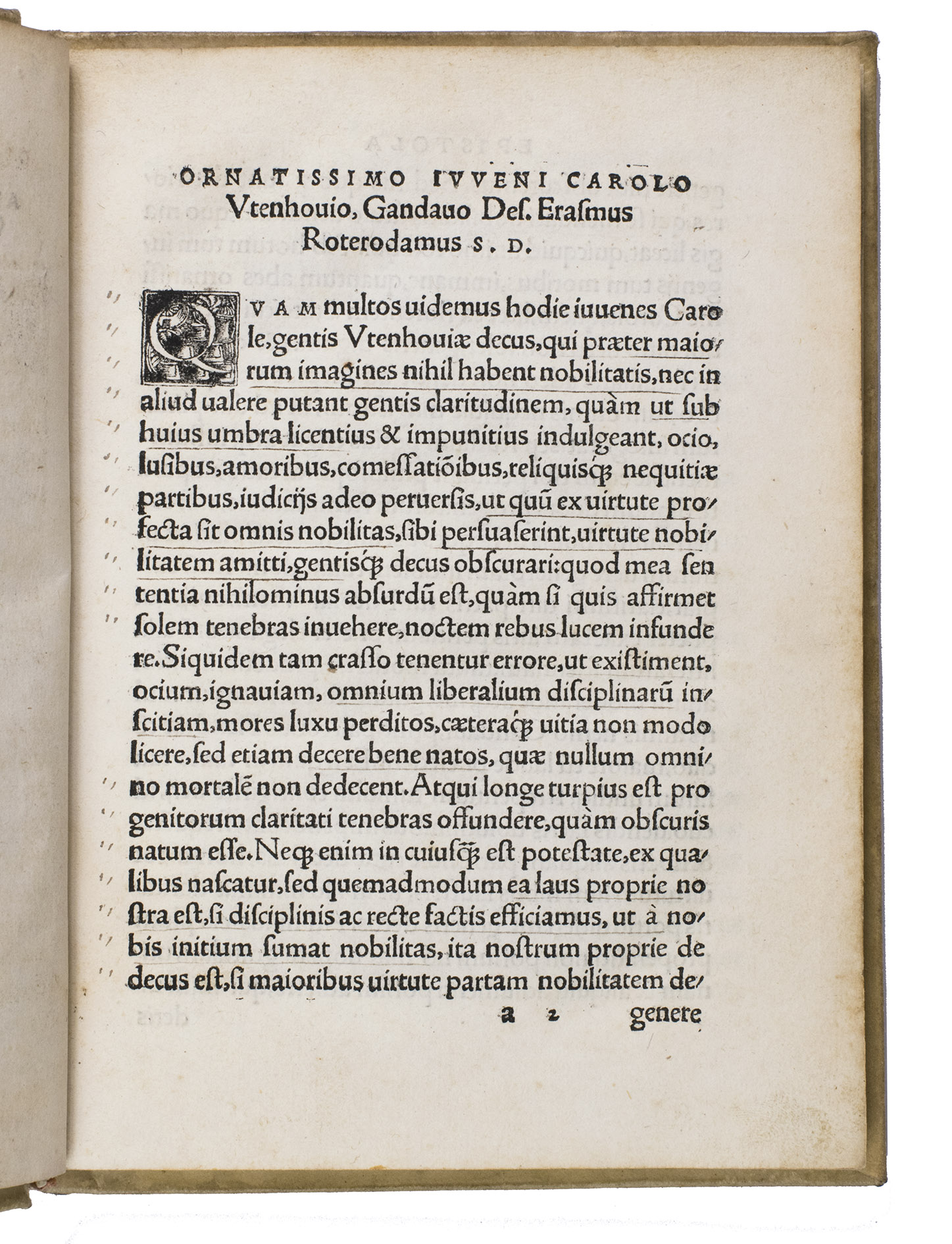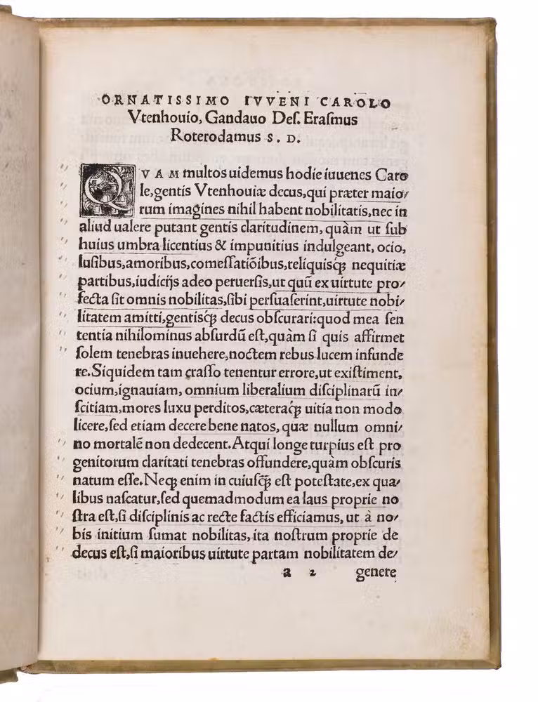 With a contemporary annotation on the title page ("Epist. ad Carol Utenhove"), a later ownership inscription ("Olof Wallqui[s]t(?)") and a faded inscription in Greek, slightly later annotations in Latin between the lines and in the margins of some of the leaves. The work has been recased in 17th-century vellum, which is slightly stained and rubbed. The work is lightly browned, with a water stain in the outer margin of page 9-25. Otherwise in good condition. Adams C 1522; USTC 608511; VD16 J 411; cf. Allen, Opus epistolarum Erasmi, 2093; Erasmus Online 4405 (other issue); not in BM STC German; De Reuck.