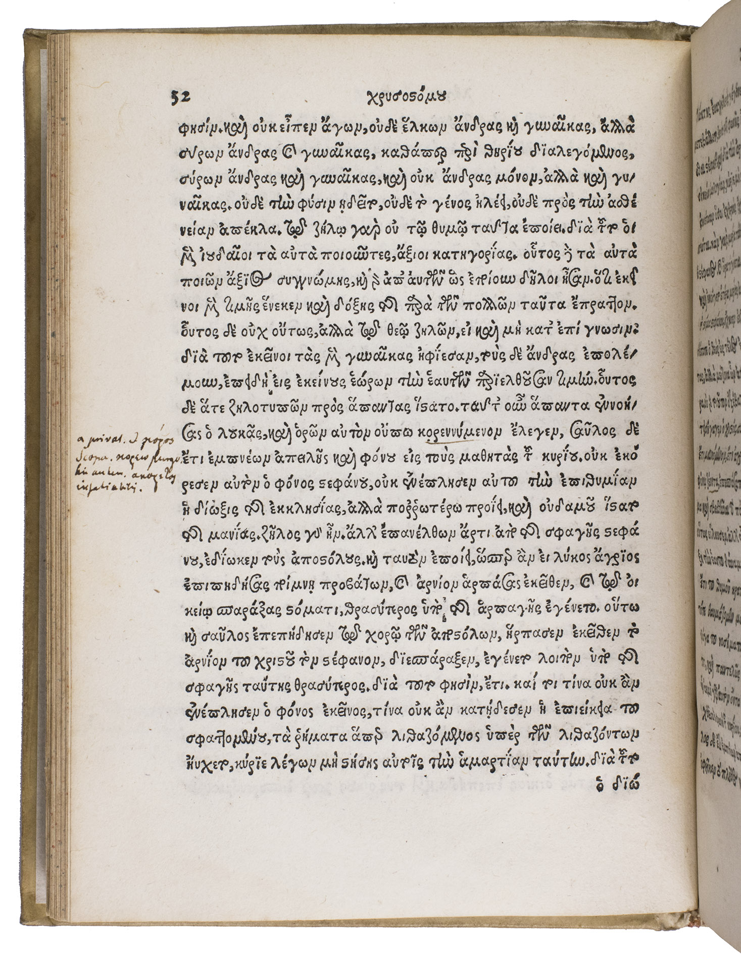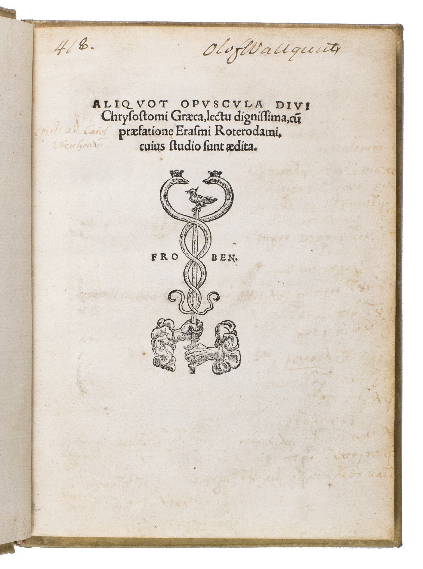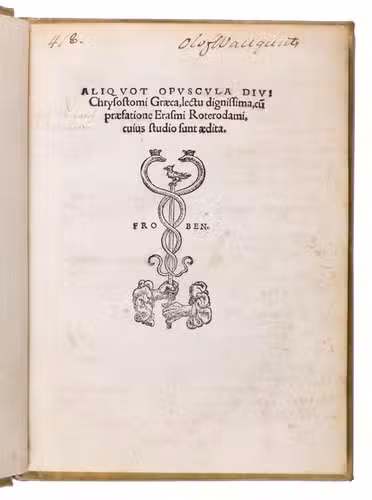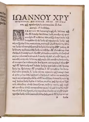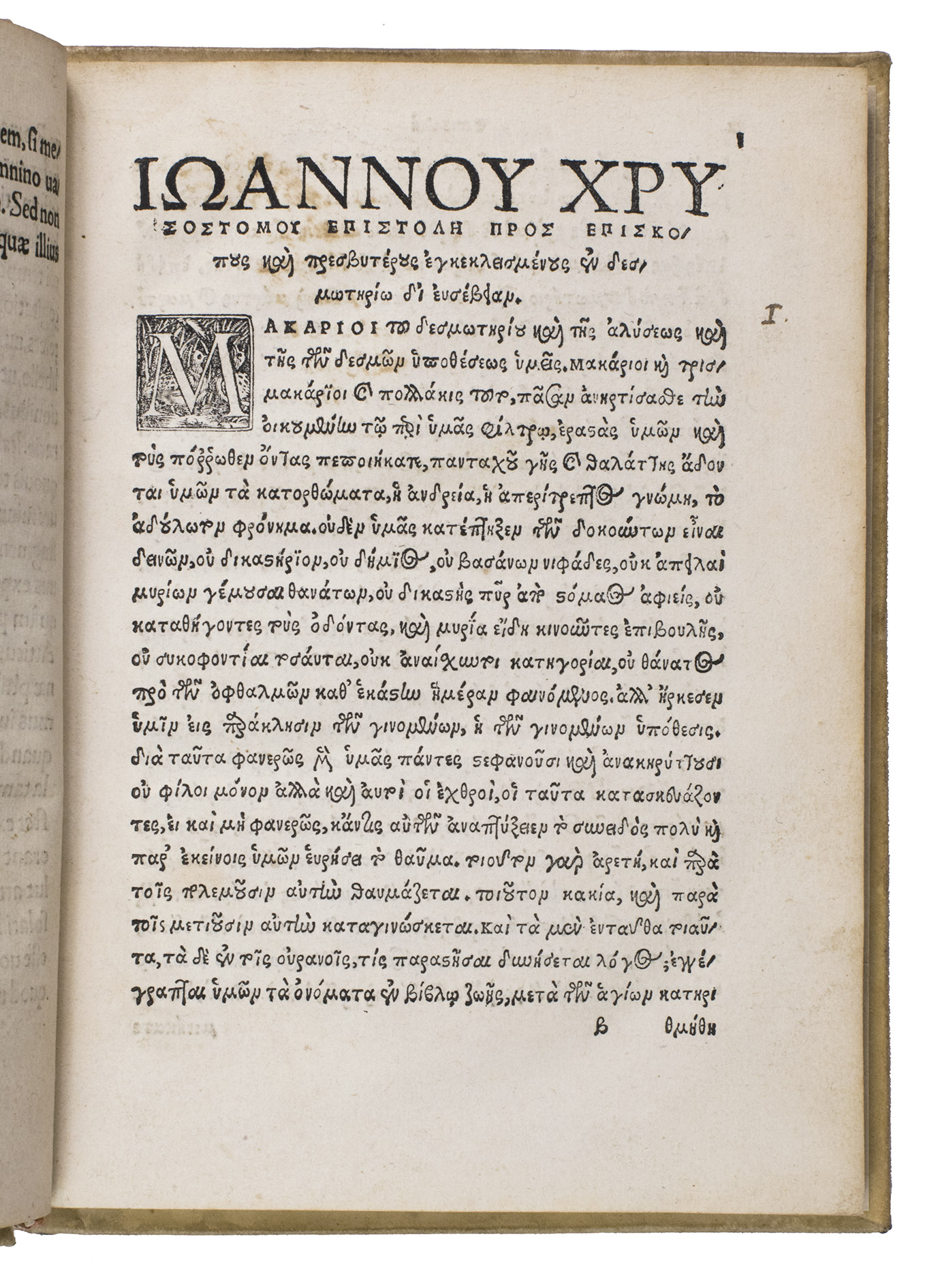 Rare first edition of various letters and other short works by John Chrysostom in Greek, edited by Erasmus. Erasmus greatly admired the Church Fathers, as he considered their work to be indispensable for church reform. Earnest Christians could use their texts to liberate themselves from the dead language of current theology and find the living words of the true philosophia Christi. Erasmus not only considered the works of the Church Fathers to be important, but also their character, and wrote biographies about several of them, including Jerome (1516), Chrysostom (1530) and Origen (1536), so their lives could serve as an example. The present work was likely also meant for this purpose. It comprises ten of Chrysostom's shorter work and letters, including a letter to Pope Innocent I, appealing for support during his exile, and a text against anathemas. In the foreword, Erasmus dedicates the work to the humanist and nobleman Karel Utenhove of Ghent (ca. 1500-1580).