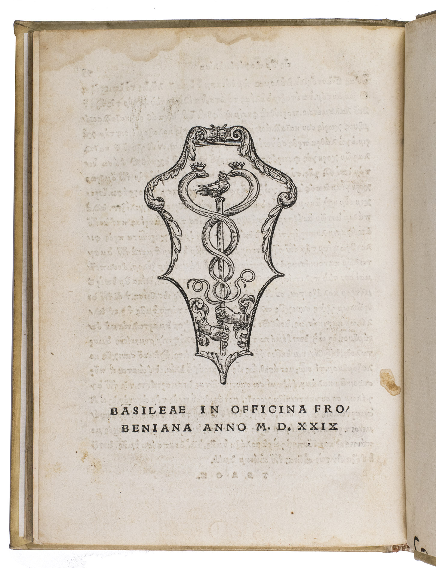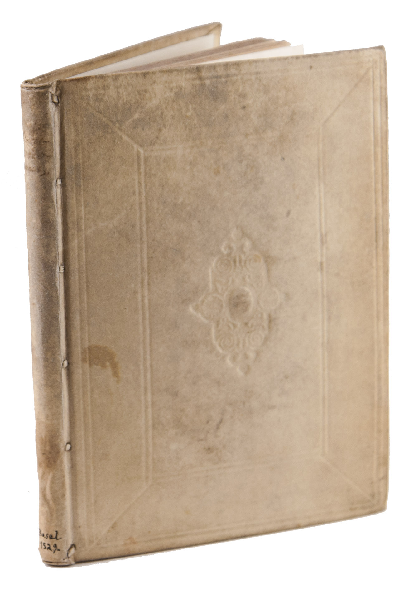 (Colophon:) Basel, Froben Office, 1529. 4to. With Froben's printer's device on the title page and last leaf, and 10 decorated woodcut initials. 17th-century blind-tooled vellum [8], 95, [1] pp.
