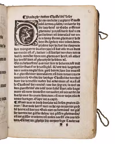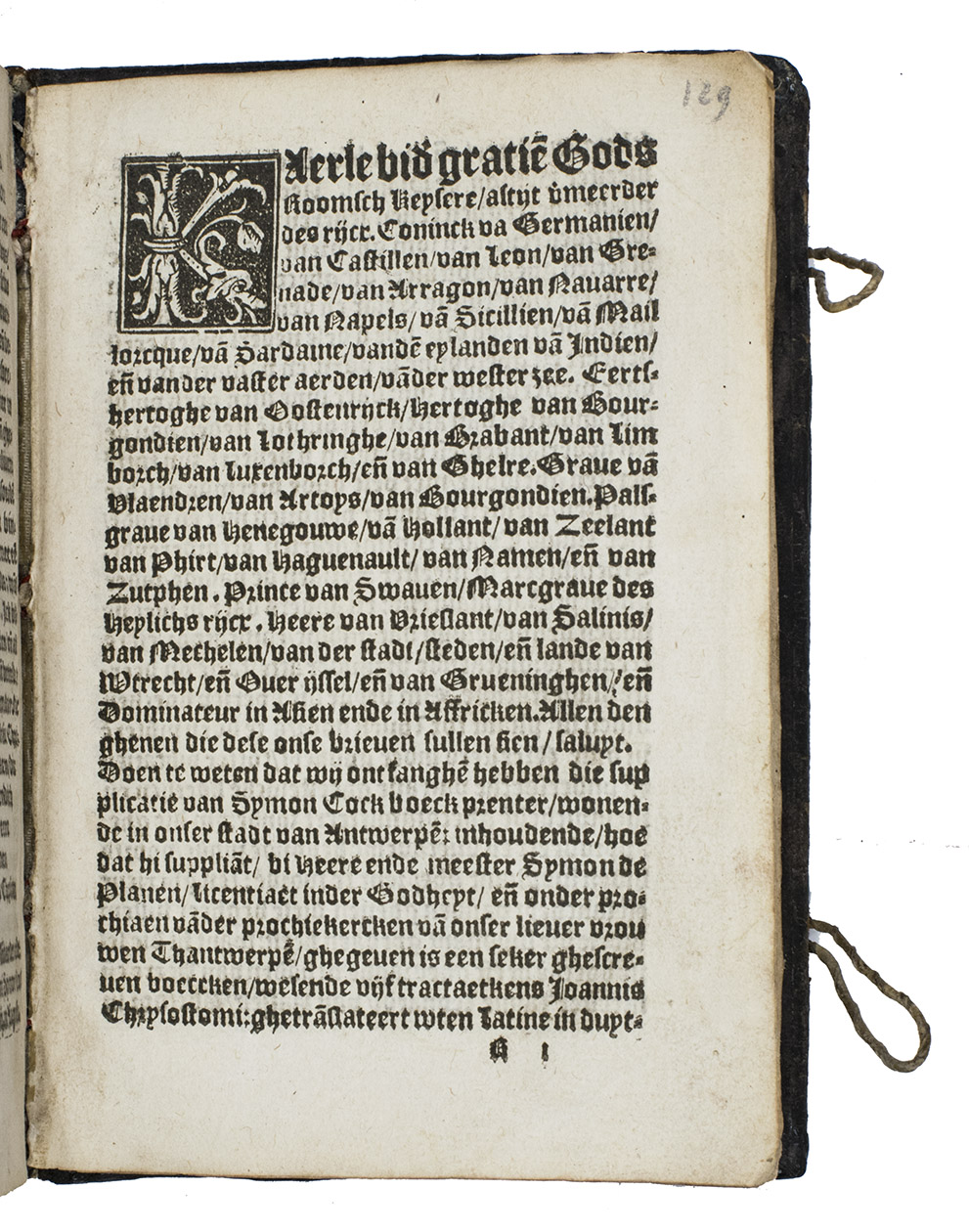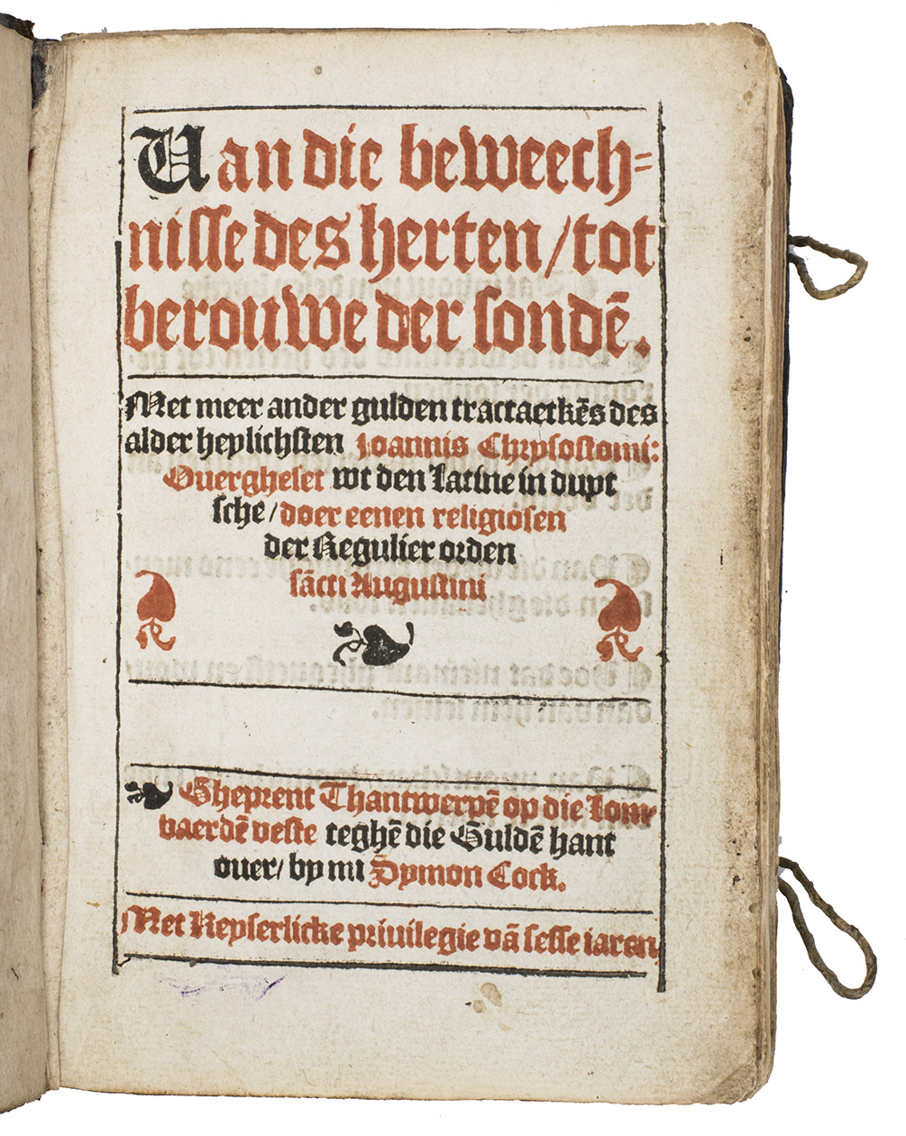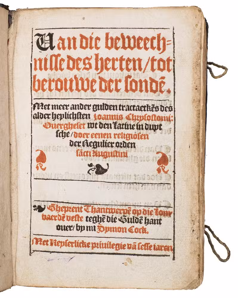 Rare first and only edition (apparently one of two copies known to include the final quire R, with the Imperial privilege noted on the title-page) of the Dutch translation of devotional tracts and sermons by Johannes Chrysostomus (ca. 347-407), Archbischop of Constantinople and an important Greek Church Father and preacher, sometimes known in English as Saint John Chrysostom. After the title-page, table of contents and translators prologue follow the main work noted in the title and three additional works: Van die weder rechtinghe eens menschen, die ghevallen was; Hoe dat niement ghequetst en wort, dan van hem selven and Van vyantschap, toornicheyt, ende van niet te sweren. Although some of Chysostomuss works were published in the original Greek beginning in 1526, they spread earlier and more widely in Latin translation. The printer-publisher Syon Cock appears to have been the first to publish any of Chrysostomuss work in Dutch/Flemish and Anthonis van der Haeghen published a couple of his sermons in 1543, but all four works in the present first more extensive publication appear here for the first time in Dutch, translated from the Latin, by Antonius van Hemert. He was an Augustine regular canon at the Marienhage monastery near Eindhoven, which had come under the influence of the Windesheim monastery, where Geert Groote and his followers had introduced the Modern Devotion movement. All four works discuss morals, particularly repenting sins and living a good life according to high moral standards. Although the colophon appears at the foot of Q8v, it is followed in the present copy by quire R, containing the 6-page privelege granted by the Holy Roman Emperor Charles V on 1 February 1545. We have located 8 other copies, but it appears that only the present copy and that at the Wissenschaftliche Bibliothek der Stadt Trier include this privilege at the end (quire R).