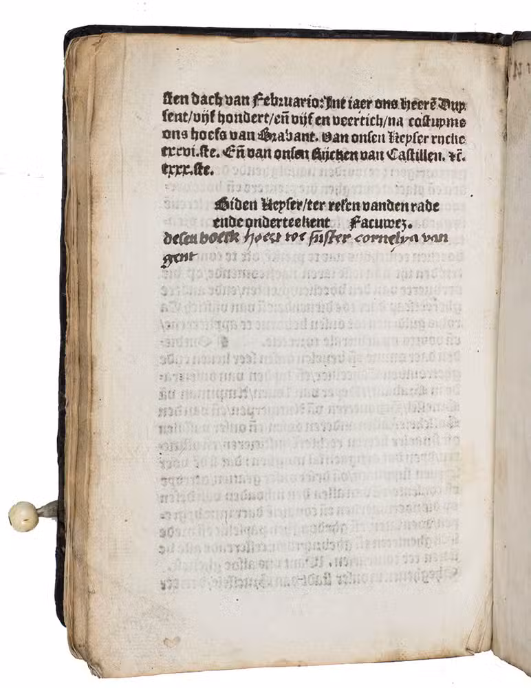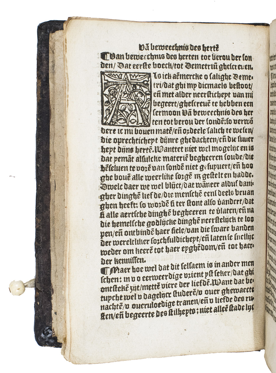With an interesting contemporary owner's inscription on the verso of the last leaf and on the back paste-down: "Desen boeck hoert toe suster cornelya van gent" and "Dit boexke[n] hoert toe s.cornelya va[n] ghendt" respectively. This may be one of the sisters in the monastery of Anthonis van Gemert, who stated explicitly in his prologue that he translated this Latin work into Dutch for his brothers and sisters in the Augustinian order. Also with another inscription pasted on the front paste-down and with a 20th-century inscription on the first free endleaf by "J. D. Moerman. Wageningen 1915". Panel-stamps only very slightly worn, one of the leather straps with the bone button gone (with only a remnant of it at the front board), but otherwise in good condition, including quire R (lacking in many copies, probably most) and in an attractive contemporary panel-stamped binding. Anet (1 copy, without quire R); Belgica typographica 1627; KVK & WorldCat (8 copies including all noted elsewhere, apparently only 1 including quire R); Lourdaux & Persoons, Recueil de travaux dhistoire et de philologie, p. 20; Machiels J93 (without quire R); Netherlandish books 16905 (4 copies); USTC (same 4 copies, apparently all without quire R); UniCat (3 copies, apparently all without quire R); not in Adams; Baur, S. Jean Chrysostome et ses oeuvres (1907); BMC STC Dutch; STCV; for the panel stamps: cf. Luc Indestege, "Heads-in-medallion panels as binding decoration in the Netherlands during the sixteenth century", in: Studia in honorem H. de la Fontaine Verwey (Amsterdam 1966), pp. 276-296, type XV.
