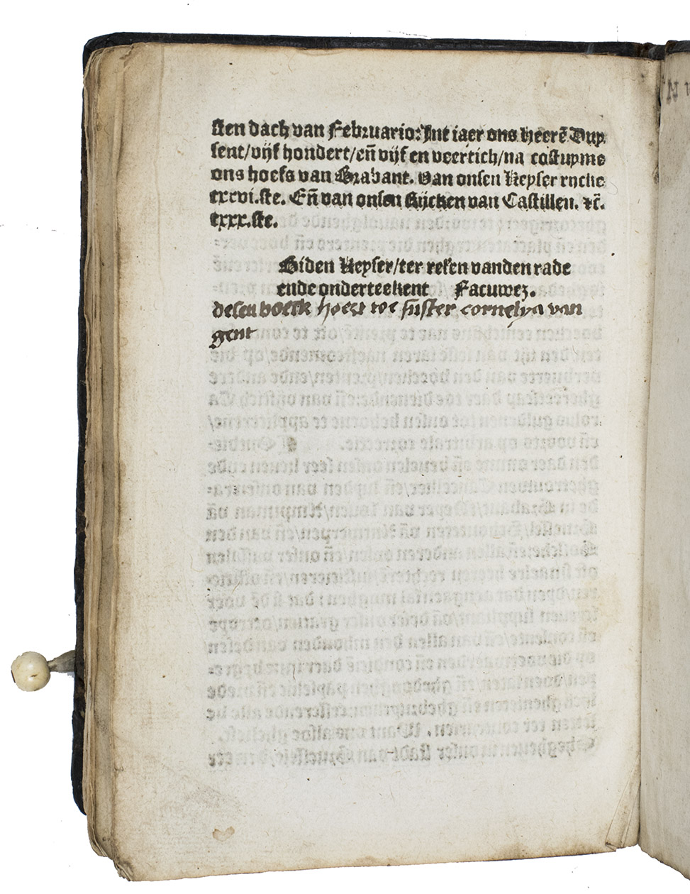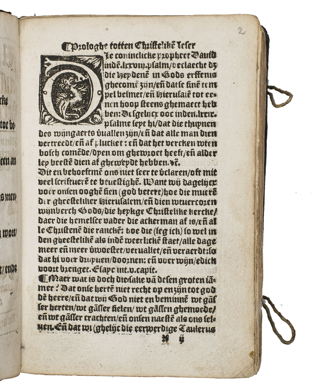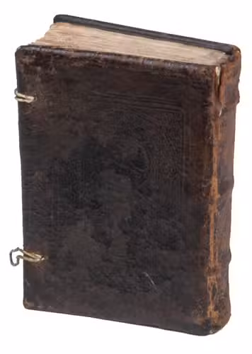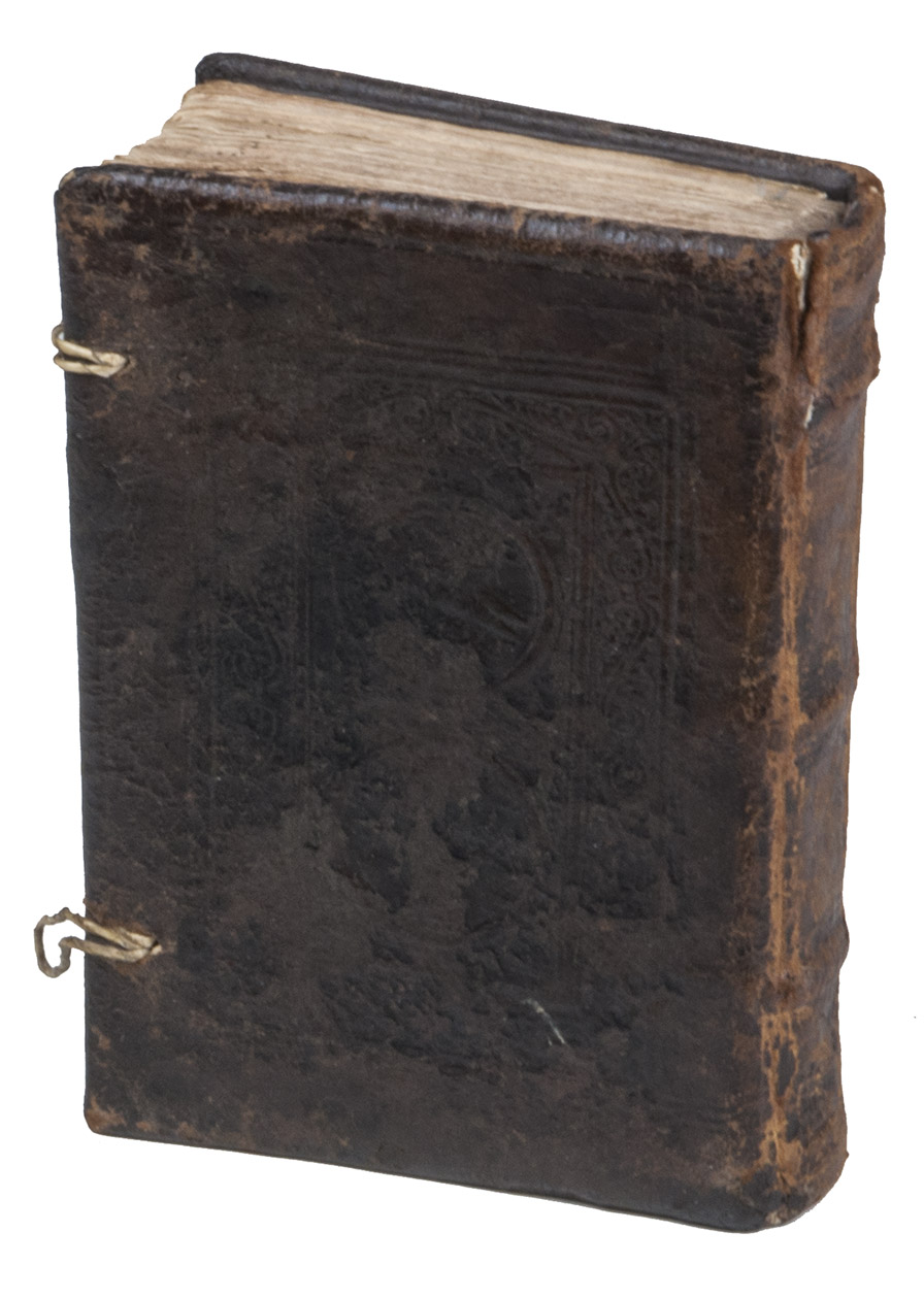 (Colophon:) Antwerp, Symon Cock, 18 August 1546. 8vo. With the title-page in red and black in a framework of thin rules, 6 woodcut decorated initials and 2 vine-leaf ornaments. Set in 3 sizes of textura gothic types. A very interesting Antwerp binding of contemporary panel-stamped calf, each board with the same panel, showing 2 medallion portraits in, the whole surrounded by a floral decorative border, interesting fastenings with cord loops that fasten to bone buttons on leather straps. [131], [1 blank] ll.