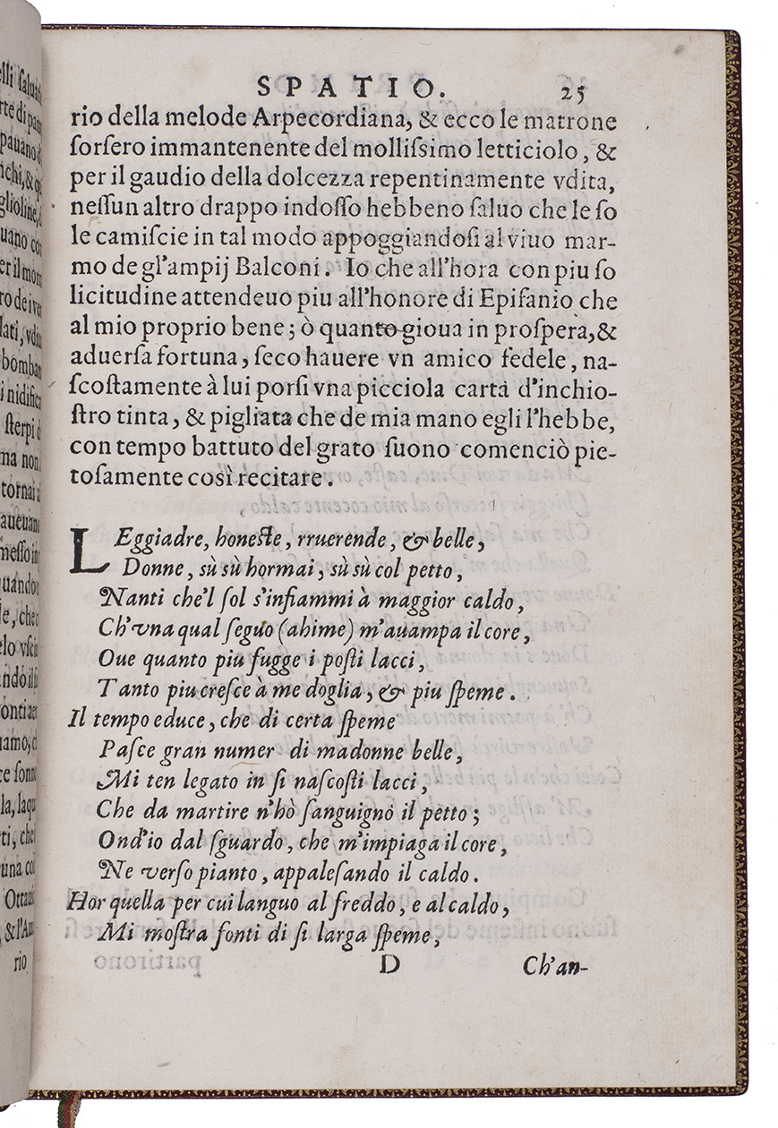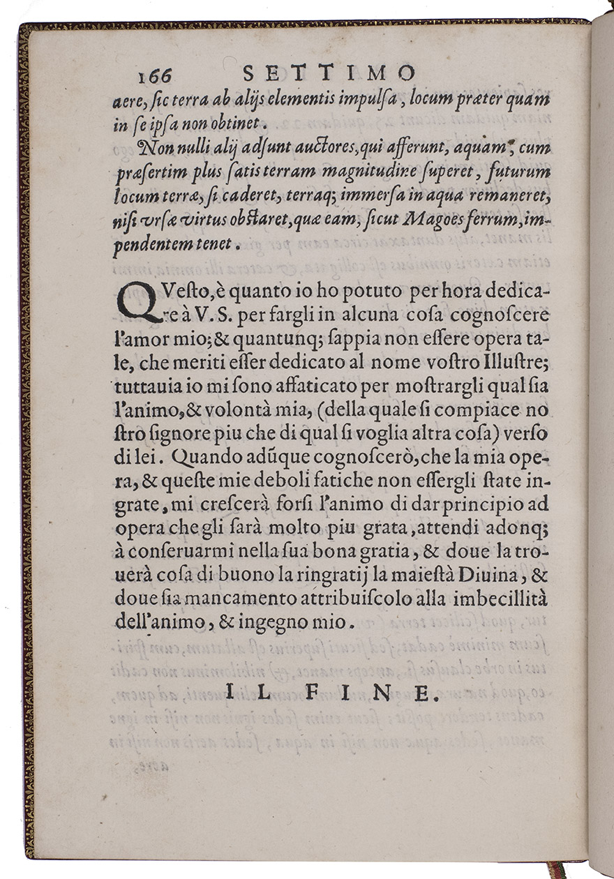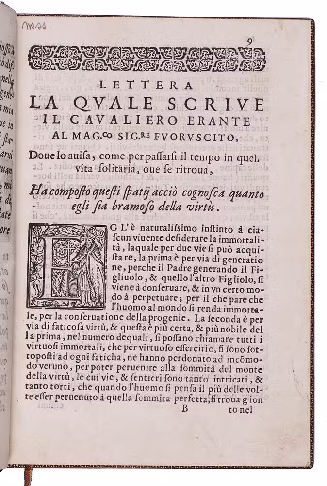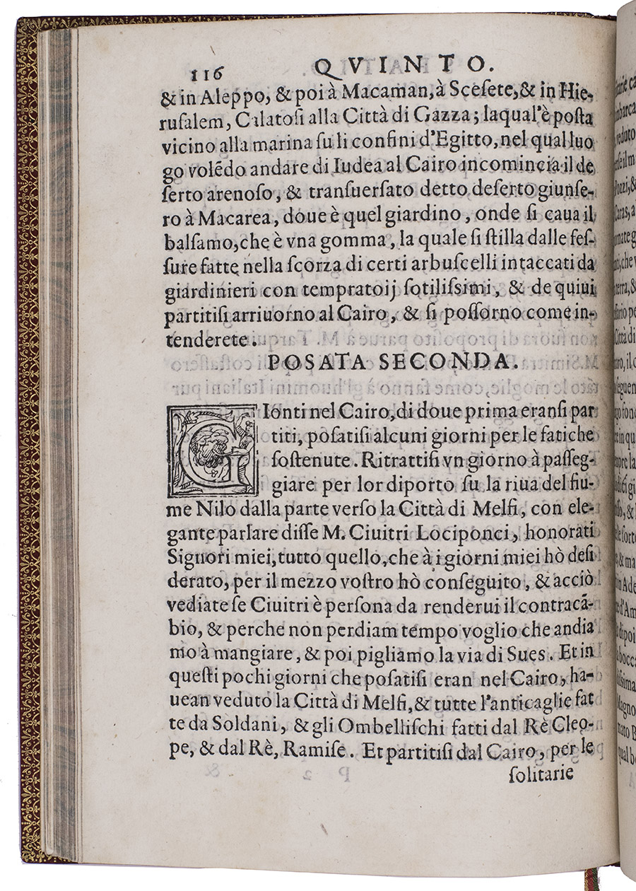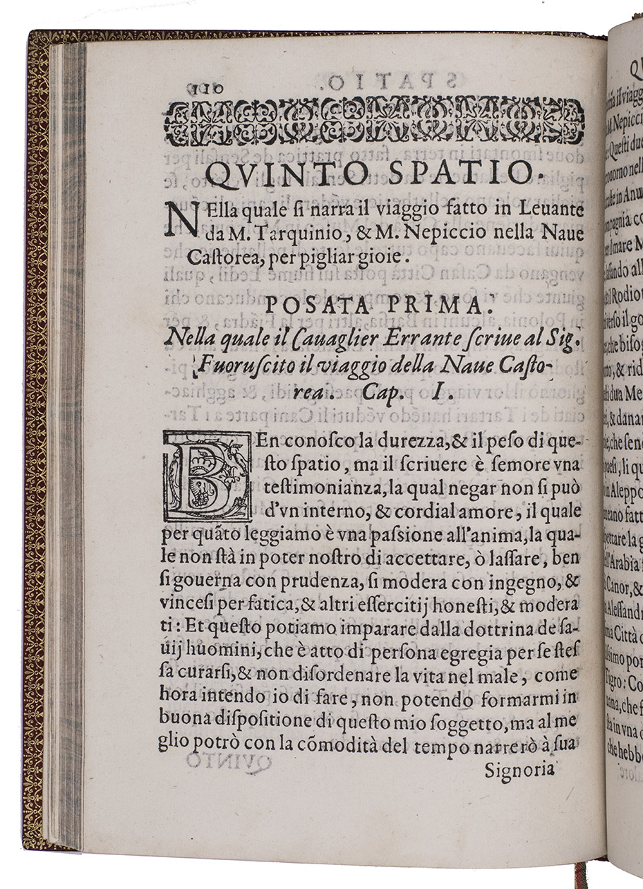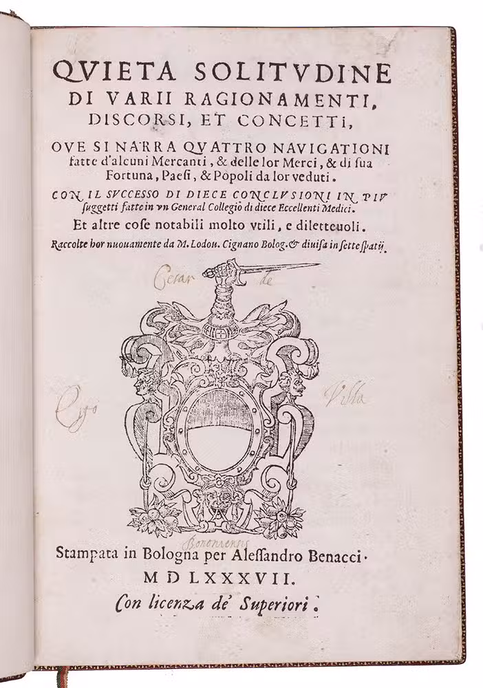 First and only edition of a fascinating combination of Italian Renaissance travel account, literature and philosophy. The publication is rare and hardly appears in the literature, so it is little known and provides a wealth of curious information. Real and imaginary stories of mercantile voyages to the East are combined with philosophical reflections on travel, in an endeavour to lift travel to a higher philosophical level. There are seven numbered chapters. The fourth chapter lays out an extensive trade route from Italy to India that runs through the Arabian Peninsula, resembling the famous Silk Route. It names many Arabian locations including Aleppo, Mecca, Hormuz and Basra. The final destinations are the cities of Magalore and Canonore (Kannur) on the Indian west coast, which are reached via Cambaia (Khambhat). Another chapter tells the story of a mercantile voyage by ship to China, with a stopover in India. The traveller describes a stay of several days in Calicut (Kozhikode), where they acquired a certain liqueur from a tree that was "molto buono, & excellente". Some of the other destinations, as well as the names of some of the people and ships, seem to be allegorical.