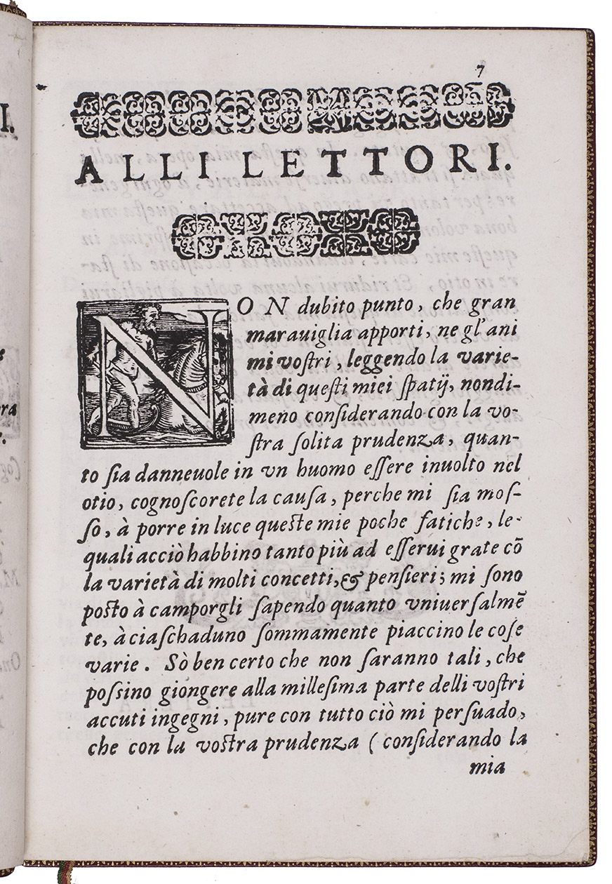 Bologna, Alessandro Benacci, 1587. Small 4to. With the woodcut coat of arms of the dedicatee Giovanni Luigi Scappi, elaborately helmed, crested and mantled, on the title-page, a woodcut tailpiece (plus 1 repeat), woodcut decorated initials (at least 4 series), decorations built up from cast typographic ornaments.