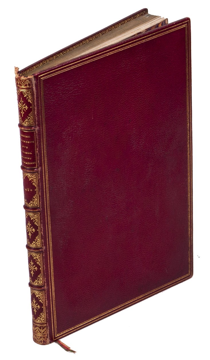 With an early owner's inscription on the title-page ("Cesar de Ego Villa Bononiensis") and a modern bookseller's ticket on the paste-down, with an earlier owner's(?) label removed. Washed by the nineteenth-century binder but book and binding in very good condition. A charmingly bound copy of a rare and curious work on the Near and Far East. BMC STC Italian, p. 184; Edit 16/ICCU 14145 (5 copies); USTC 822630 (9 copies); not in Atabey; Blackmer; Howgego (neither real nor "invented and apocryphal"); Mortimer.