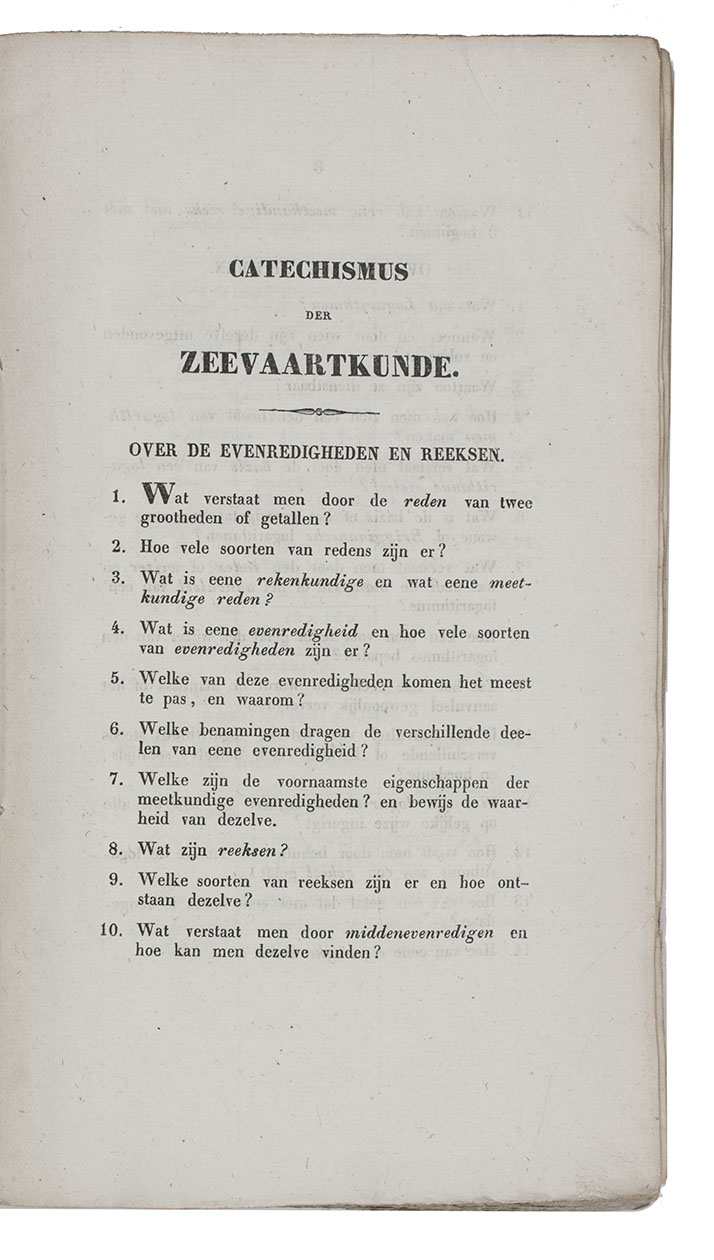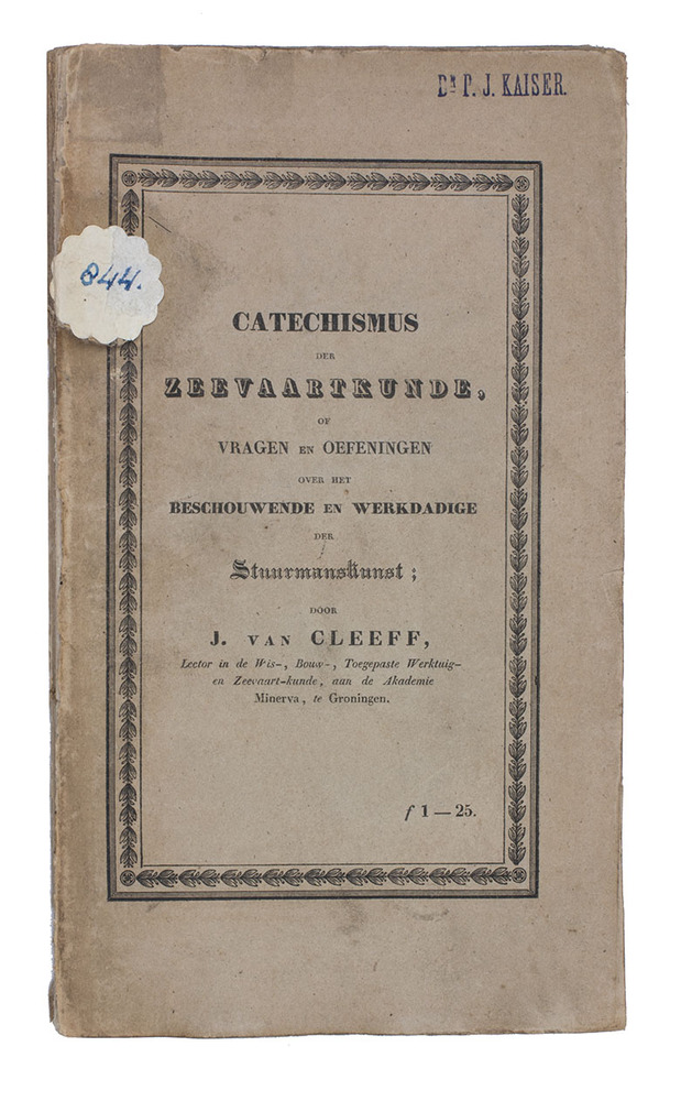 Rare first edition of a schoolbook on navigation in the form of questions and exercises, by Jacob van Cleeff (1788-1862), lecturer in mathematics, engineering and navigation at the maritime academy at Groningen known as the Academie Minerva. The work was meant to be used together with Jan Carel Pilaar's Handleiding tot de beschouwende en werkdadige stuurmanskunst first published in 1831. A second edition of the present work appeared in 1846 and a third in 1859.
