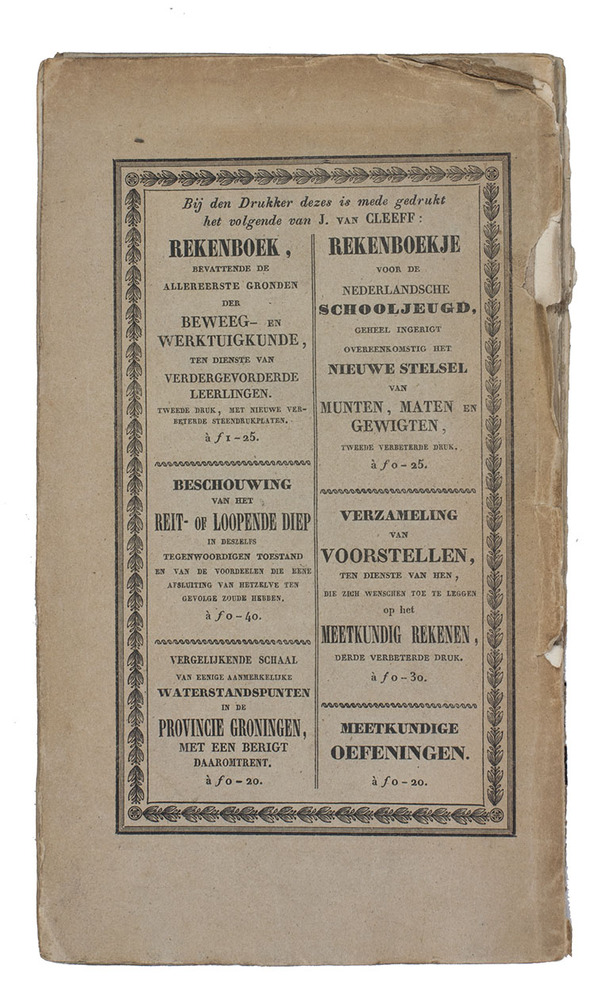 Groningen, J. Oomkens, 1840. 8vo. Original publisher's printed paper wrappers, with at the back an advertisement for 6 other works by Van Cleeff.  115, [1 blank] pp.