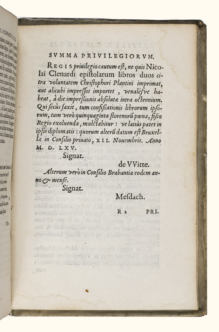Antwerp, Christopher Plantin, 1566. 2 parts in 1 volume. 8to. Both title-pages with Plantin's woodcut printer's mark, Arabic type interspersed. Contemporary vellum with 4 raised bands and a manuscript title on the spine. 112, 258 [= 241], [4] pp.