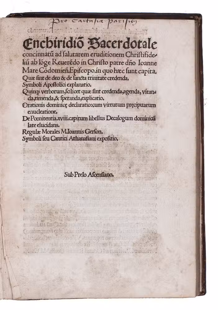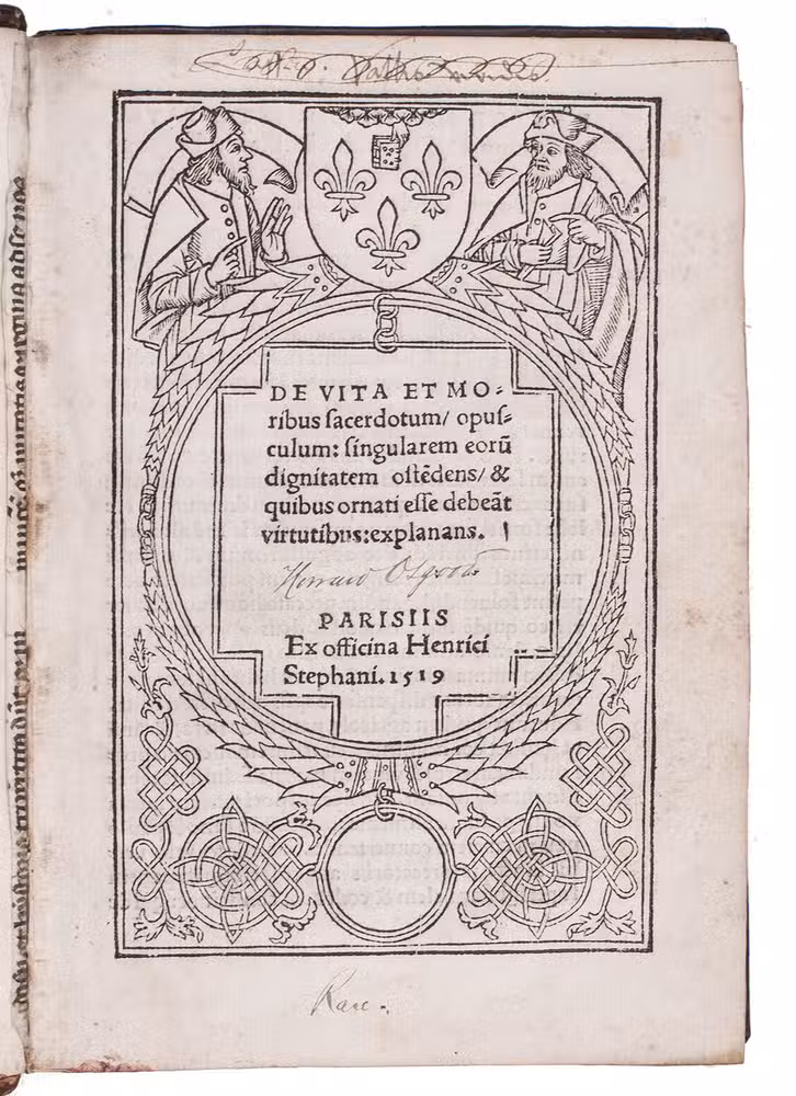 Two Paris first editions from 1519 on the priesthood and the education of priests, both complete with their final blank leaves (often lacking), finely produced by two of the most important printer-publishers of the 16th century, Henri Estienne I and Josse Bade. They are here preserved in a 16th-century binding made for what is likely to be a descendent of the first author's editor.