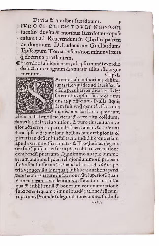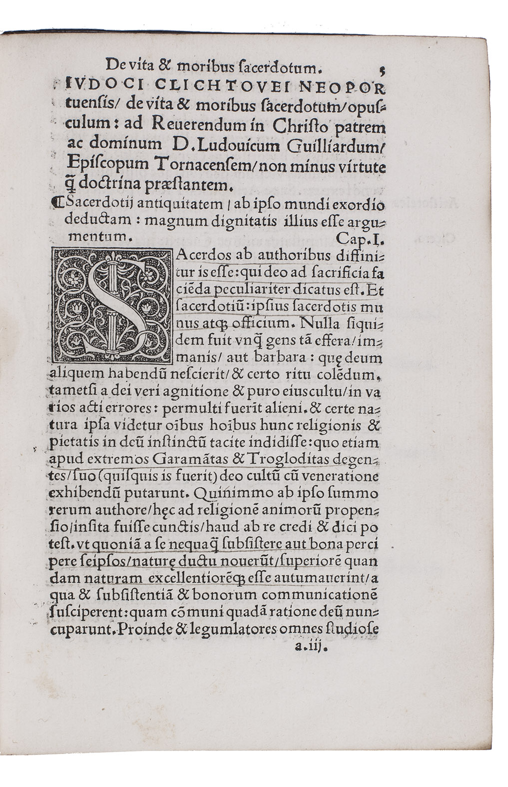 Ad 1: First edition of an influential work on the office and customs of the priesthood by Josse Clichtove (1472- 1543). A champion of reform in philosophical and theological studies during the earlier part of his life, Clichtove later devoted himself almost exclusively to combating the doctrines of Luther. In the present work he developed a new and comprehensive concept of the office of the priesthood that anticipated the counter-Reformation spirit of the Council of Trent. It also defended clerical celibacy and the fast, in opposition to Erasmus, whom he never mentions by name.