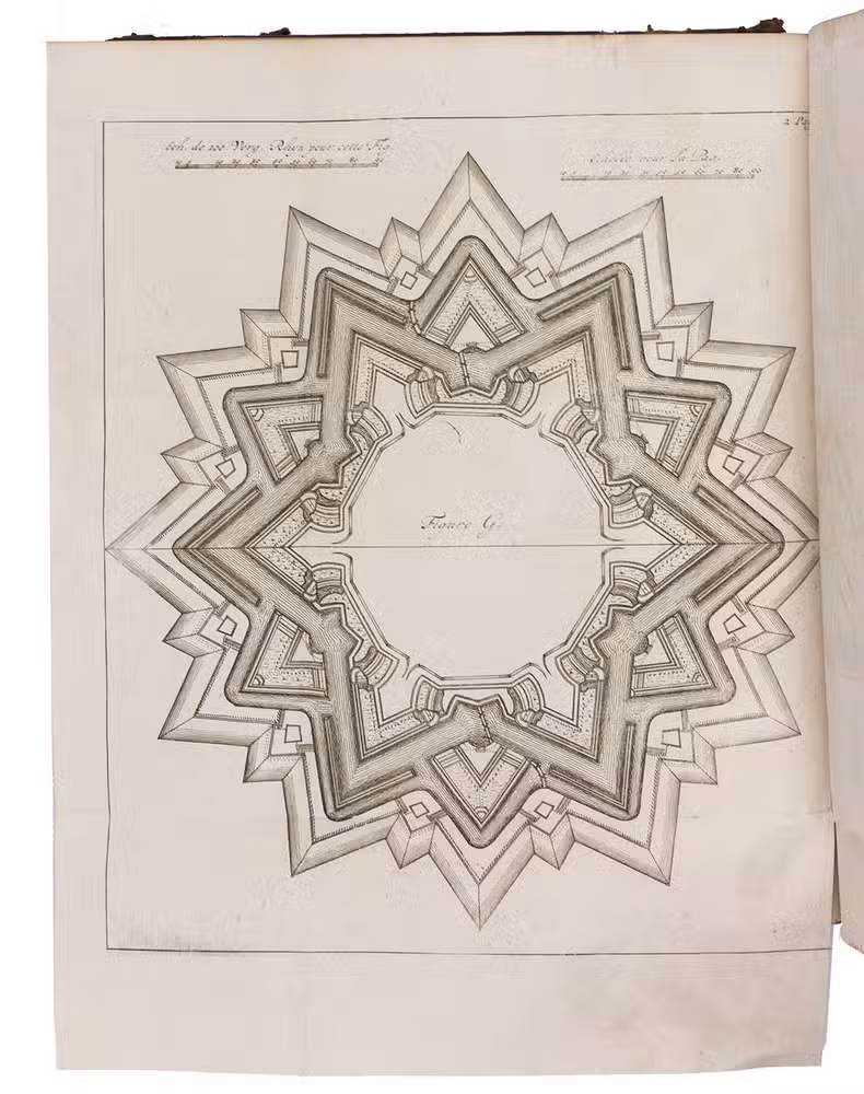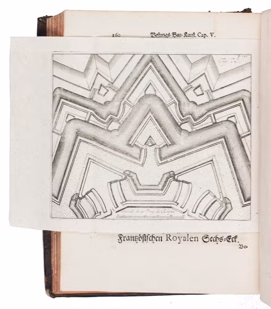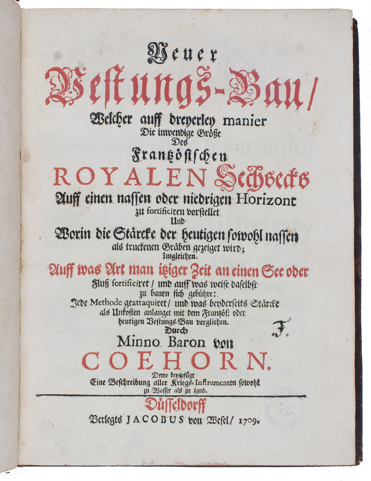 First German edition (second issue) of one of the greatest classics of the art of fortification, by the Inspector General of Dutch fortifications and Master General of the artillery, Menno van Coehoorn. While the Dutch had established themselves as the greatest masters of fortification during the Eighty Years' War for Dutch independence from Spain, the art did not stand still after peace came temporarily in 1648. Although a few Dutch engineers spoke out for reform, the Frenchman Sébastien Le Prestre de Vauban (1633-1707) was to dominate the field with his fortifications, defensive and especially offensive strategies, and publications on the subjects from the 1670s. Van Coehoorn (1641-1704), Vauban's only major rival, took a very different approach, more practical than theoretical, with his great fortification manual in 1685. He deployed troops more actively in the defence of fortifications and tailored his designs and strategies to the particular features of the site. This made them especially important for fortifications and siege warfare in the marshy flat lands of the Low Countries, circumstances less familiar to Vauban.