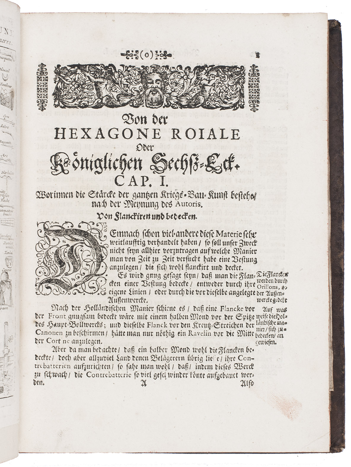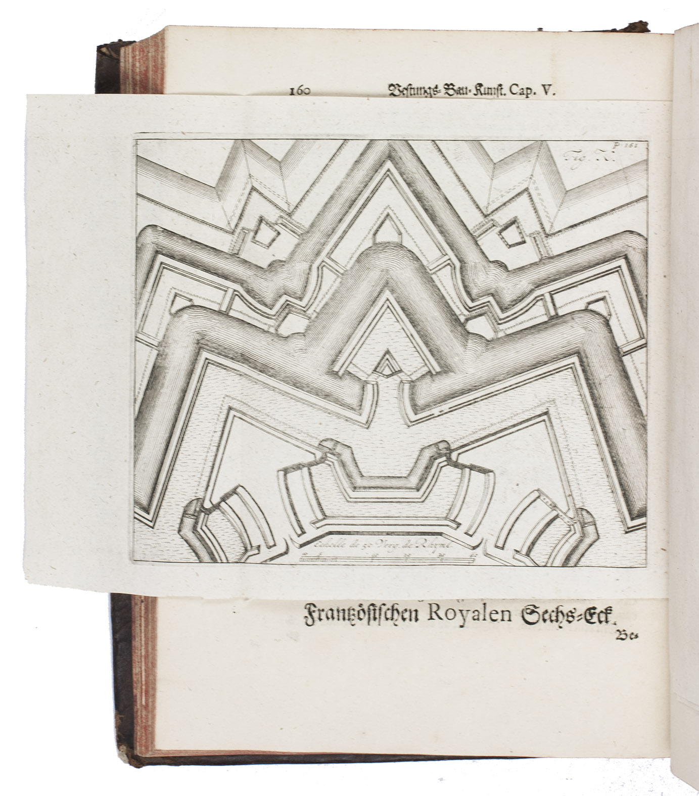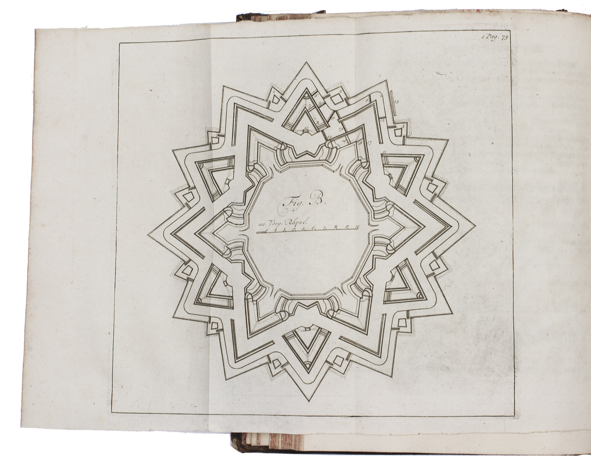 With library stamp. With a blank leaf pasted over the instructions to the bookbinder on )(4v. The plates are quite lightly inked, so that they show a great deal of detail. Lacking 1 folding plate, with a small tear and some wrinkles in 1 folding plate (fig. I) and an occasional minor spot, but otherwise in very good condition. The binding is scuffed and shows some worm damage, with the head and foot of the backstrip chipped and the front hinge cracked, but with the sewing structure still sound. First German edition of a classic of Dutch fortification. Jähns, p. 1383; Jordan 745 (3 copies); cf. Sloos, Warfare 8076.